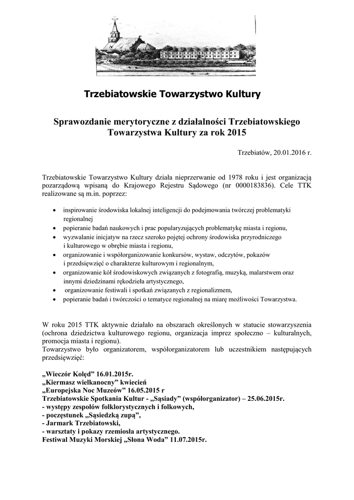Trzebiatowskie Towarzystwo Kultury Sprawozdanie merytoryczne z działalności Trzebiatowskiego Towarzystwa Kultury za rok 2015 Trzebiatów, 20.01.2016 r. Trzebiatowskie Towarzystwo Kultury działa nieprzerwanie od 1978 roku i jest organizacją pozarządową wpisaną do Krajowego Rejestru Sądowego (nr 0000183836). Cele TTK realizowane są m.in. poprzez: inspirowanie środowiska lokalnej inteligencji do podejmowania twórczej problematyki regionalnej popieranie badań naukowych i prac popularyzujących problematykę miasta i regionu, wyzwalanie inicjatyw na rzecz szeroko pojętej ochrony środowiska przyrodniczego i kulturowego w obrębie miasta i regionu, organizowanie i współorganizowanie konkursów, wystaw, odczytów, pokazów i przedsięwzięć o charakterze kulturowym i regionalnym, organizowanie kół środowiskowych związanych z fotografią, muzyką, malarstwem oraz innymi dziedzinami rękodzieła artystycznego, organizowanie festiwali i spotkań związanych z regionalizmem, popieranie badań i twórczości o tematyce regionalnej na miarę możliwości Towarzystwa. W roku 2015 TTK aktywnie działało na obszarach określonych w statucie stowarzyszenia (ochrona dziedzictwa kulturowego regionu, organizacja imprez społeczno – kulturalnych, promocja miasta i regionu). Towarzystwo było organizatorem, współorganizatorem lub uczestnikiem następujących przedsięwzięć: „Wieczór Kolęd” 16.01.2015r. „Kiermasz wielkanocny” kwiecień „Europejska Noc Muzeów” 16.05.2015 r Trzebiatowskie Spotkania Kultur - ,,Sąsiady” (współorganizator) – 25.06.2015r. - występy zespołów folklorystycznych i folkowych, - poczęstunek ,,Sąsiedzką zupą”, - Jarmark Trzebiatowski, - warsztaty i pokazy rzemiosła artystycznego. Festiwal Muzyki Morskiej „Słona Woda” 11.07.2015r. Trzebiatowskie Święto Kaszy (współorganizator) –01.08.2015r. przygotowanie tradycyjnego stoiska z produktami regionalnymi, IX Pałacowa Noc w Muzeum (współorganizator) - 14.08.2015 r. Udział w Dożynkach Gminnych w Trzebiatowie (20.09.2015 r.) – przygotowanie stoiska z potrawami regionalnymi, Europejskie Dni Dziedzictwa (współorganizator) - wrzesień 2015 r. pod hasłem „Dziedzictwo utracone, dziedzictwo ocalone” Spotkanie w ramach projektu ,,Od Izby Regionalnej do Muzeum Pałacowego. 15-lecie działalności muzealnej w Trzebiatowie” dofinansowanego ze środków Wojewódzkiego Urzędu Ochrony Zabytków w Szczecinie oraz w ramach Europejskich Dni Dziedzictwa. ,,Tradycje muzealne w Trzebiatowie i na Pomorzu” - wykład i prezentacja multimedialna dr Janiny Kochanowskiej ,,Tradycje muzealne w Trzebiatowie i na Pomorzu”, - otwarcie wystawy ,,Od Izby Regionalnej do Muzeum Pałacowego. 15-lecie działalności muzealnej w Trzebiatowie”, - promocja wydawnictwa ,,Muzeum Pałacowe w Trzebiatowie. Zobacz, dotknij, posłuchaj!” Członkowie TTK podczas seminarium naukowego ,,Trzebiatów – spotkania pomorskie 2015 r.” (16-17.10.2015 r.) wygłosili następujące referaty: Renata T. Korek – „Aspekt kulturowy osadnictwa ukraińskiego w gminie Trzebiatów” Hans Udo Vogler – „Ludwig Gotthard Kosegarten – pastor, poeta, profesor” Piotr Żak i Janina Kochanowska prowadzenie i dyskusja podczas objazdu naukowego dotyczącego stanu zachowania cennych zabytków Trzebiatowa. Członkowie Towarzystwa aktywnie pomagali w oprowadzaniu wycieczek, oraz piekli pierniki norbertańskie, które sprzedawane były podczas imprez. Dochód przeznaczony był na cele statutowe Towarzystwa. Opracowała Anna Rzepecka