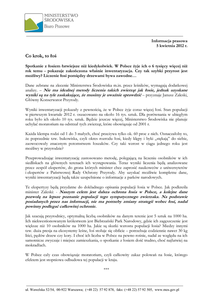 Informacja prasowa 5 kwietnia 2012 r. Co krok, to łoś Spotkanie z łosiem łatwiejsze niż kiedykolwiek. W Polsce żyje ich o 6 tysięcy więcej niż rok temu - pokazuje zakończona właśnie inwentaryzacja. Czy tak szybki przyrost jest możliwy? Liczenie łosi pomiędzy drzewami bywa zawodne… Dane zebrane na zlecenie Ministerstwa Środowiska m.in. przez leśników, wymagają dodatkowej analizy. – Nie ma idealnej metody liczenia takich zwierząt jak łosie, jednak uzyskane wyniki są na tyle zaskakujące, że musimy je uważnie sprawdzić – przyznaje Janusz Zaleski, Główny Konserwator Przyrody. Wyniki inwentaryzacji pokazały z pewnością, że w Polsce żyje coraz więcej łosi. Stan populacji w pierwszym kwartale 2012 r. oszacowano na około 16 tys. sztuk. Dla porównania w ubiegłym roku było ich około 10 tys. sztuk. Będzie jeszcze więcej, Ministerstwo Środowiska nie planuje uchylać moratorium na odstrzał tych zwierząt, które obowiązuje od 2001 r. Każda klempa rodzi od 1 do 3 małych, choć przeżywa tylko ok. 60 proc z nich. Oznaczałoby to, że poprzednie tzw. bukowiska, czyli okres rozrodu łosi, kiedy klępy i byki „stękają” do siebie, zaowocowały znacznym potomstwem łoszaków. Czy taki wzrost w ciągu jednego roku jest możliwy w przyrodzie? Przeprowadzając inwentaryzację zastosowano metodę, polegającą na liczeniu osobników w ich siedliskach na głównych terenach ich występowania. Teraz wyniki liczenia będą analizowane przez zespół ekspertów, do grona których minister chce zaprosić naukowców z uniwersytetów i ekspertów z Państwowej Rady Ochrony Przyrody. Aby uzyskać możliwie kompletne dane, wyniki inwentaryzacji będą także uzupełnione o informacje z parków narodowych. Te ekspertyzy będą przydatne do dokładnego opisania populacji łosia w Polsce. Jak podkreśla minister Zaleski: - Naszym celem jest dalsza ochrona łosia w Polsce, a kolejne dane pozwolą na lepsze poznanie populacji tego sympatycznego zwierzaka. Na podstawie posiadanych przez nas informacji, nie ma potrzeby zmiany strategii wobec łosi, nadal powinny podlegać całkowitej ochronie. Jak szacują przyrodnicy, optymalną liczbą osobników na danym terenie jest 5 sztuk na 1000 ha. Ich niekwestionowanym królestwem jest Biebrzański Park Narodowy, gdzie ich zagęszczenie jest większe niż 10 osobników na 1000 ha. Jakie są skutki wzrostu populacji łosia? Miedzy innymi tzw. duża presja na ekosystemy leśne, łoś stołuje się obficie – potrzebuje codziennie nawet 30 kg liści, pędów drzew czy kory. I choć ich liczba w Polsce na pewno rośnie, nadal ze względu na ich samotnicze zwyczaje i miejsce zamieszkania, o spotkanie z łosiem dość trudno, choć najłatwiej na mokradłach. W Polsce cały czas obowiązuje moratorium, czyli całkowity zakaz polowań na łosie, którego efektem jest stopniowa odbudowa tej populacji w kraju. *** ul. Wawelska 52/54, 00-922 Warszawa; (+48 22) 57 92 878, faks: (+48 22) 57 92 505, www.mos.gov.pl Więcej: Magda Sikorska, rzeczniczka prasowa, [email protected], kom. 695 100 978 Więcej o łosiach: Stan populacji łosia wg GUS wynosił w 2000 r. – 2076 sztuk, w 2005-3896 sztuk, w 20086479 sztuk, a 2011-9862 sztuki (wg inwentaryzacji szacunkowej wykonanej przez dzierżawców i zarządców obwodów łowieckich w każdym roku). Moratorium na odstrzał łosia (Alces alces) zostało wprowadzone w rozporządzeniu Ministra Środowiska, Zasobów Naturalnych i Leśnictwa z 10 kwietnia 2001 r. w sprawie ustalenia listy gatunków zwierząt łownych oraz określenia okresów polowań na te zwierzęta. Objęło ono łosie całoroczną ochroną nie pozbawiając go statusu zwierzęcia łownego, a także nie wskazując terminu zakończenia obowiązywania moratorium. W 2003 roku Zakładowi Badania Ssaków Uniwersytetu Jagiellońskiego prowadził pracę badawczą, mającą na celu m.in. analizę kształtowania populacji łosia w Polsce oraz określenie kierunków gospodarowania tą populacją. We wnioskach ze sprawozdania końcowego z tej ekspertyzy znalazła się m.in. konieczność przedłużenia obowiązywania moratorium na odstrzał łosia do 2008 r. Ponadto zarówno Polski Związek Łowiecki jak i Państwowa Rada Ochrony Przyrody w latach 2007 i 2008 wypowiadali się negatywnie w odniesieniu do skrócenia czasu obowiązywania moratorium, czy wydania zezwolenia przez ministra właściwego ds. środowiska na odstrzał łosi do celów badań naukowych, przynajmniej do czasu wykonania dokładniejszej inwentaryzacji łosia w Polsce. W 2008 roku podjęto, więc działania zmierzające do opracowania strategii gospodarowania populacją łosia w kraju i zlecenia jej Uniwersytetowi w Białymstoku. W odebranej 15 listopada 2011 „Strategii ochrony i gospodarowania populacją łosia w Polsce” uznano, że poziom 5 łosi na 1000 ha łowiska jest wielkością optymalną zapewniającą trwałość populacji i jej prawidłowy rozwój. 2