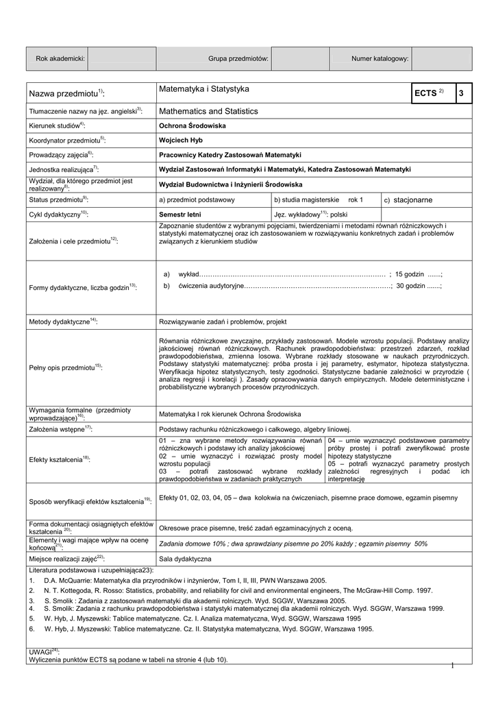 Rok akademicki: Grupa przedmiotów: Nazwa przedmiotu1): Tłumaczenie nazwy na jęz. angielski3): 4) Numer katalogowy: Matematyka i Statystyka ECTS 2) 3 Mathematics and Statistics Ochrona Środowiska Kierunek studiów : 5) Koordynator przedmiotu : Wojciech Hyb Prowadzący zajęcia6): Pracownicy Katedry Zastosowań Matematyki 7) Jednostka realizująca : Wydział Zastosowań Informatyki i Matematyki, Katedra Zastosowań Matematyki Wydział, dla którego przedmiot jest realizowany8): Wydział Budownictwa i Inżynierii Środowiska 9) a) przedmiot podstawowy b) studia magisterskie Cykl dydaktyczny10): Semestr letni Jęz. wykładowy11): polski Założenia i cele przedmiotu12): Zapoznanie studentów z wybranymi pojęciami, twierdzeniami i metodami równań różniczkowych i statystyki matematycznej oraz ich zastosowaniem w rozwiązywaniu konkretnych zadań i problemów związanych z kierunkiem studiów Formy dydaktyczne, liczba godzin13): rok 1 c) stacjonarne Status przedmiotu : a) wykład………………………………………………………………………… ; 15 godzin .......; b) ćwiczenia audytoryjne…………………………………………………………; 30 godzin .......; Metody dydaktyczne14): Rozwiązywanie zadań i problemów, projekt Pełny opis przedmiotu15): Równania różniczkowe zwyczajne, przykłady zastosowań. Modele wzrostu populacji. Podstawy analizy jakościowej równań różniczkowych. Rachunek prawdopodobieństwa: przestrzeń zdarzeń, rozkład prawdopodobieństwa, zmienna losowa. Wybrane rozkłady stosowane w naukach przyrodniczych. Podstawy statystyki matematycznej: próba prosta i jej parametry, estymator, hipoteza statystyczna. Weryfikacja hipotez statystycznych, testy zgodności. Statystyczne badanie zależności w przyrodzie ( analiza regresji i korelacji ). Zasady opracowywania danych empirycznych. Modele deterministyczne i probabilistyczne wybranych procesów przyrodniczych. Wymagania formalne (przedmioty wprowadzające)16): Matematyka I rok kierunek Ochrona Środowiska Założenia wstępne17): Podstawy rachunku różniczkowego i całkowego, algebry liniowej. Efekty kształcenia18): 01 – zna wybrane metody rozwiązywania równań różniczkowych i podstawy ich analizy jakościowej 02 – umie wyznaczyć i rozwiązać prosty model wzrostu populacji 03 – potrafi zastosować wybrane rozkłady prawdopodobieństwa w zadaniach praktycznych Sposób weryfikacji efektów kształcenia19): Efekty 01, 02, 03, 04, 05 – dwa kolokwia na ćwiczeniach, pisemne prace domowe, egzamin pisemny 04 – umie wyznaczyć podstawowe parametry próby prostej i potrafi zweryfikować proste hipotezy statystyczne 05 – potrafi wyznaczyć parametry prostych zależności regresyjnych i podać ich interpretację Forma dokumentacji osiągniętych efektów Okresowe prace pisemne, treść zadań egzaminacyjnych z oceną. kształcenia 20): Elementy i wagi mające wpływ na ocenę Zadania domowe 10% ; dwa sprawdziany pisemne po 20% każdy ; egzamin pisemny 50% końcową21): Miejsce realizacji zajęć22): Sala dydaktyczna Literatura podstawowa i uzupełniająca23): 1. D.A. McQuarrie: Matematyka dla przyrodników i inżynierów, Tom I, II, III, PWN Warszawa 2005. 2. N. T. Kottegoda, R. Rosso: Statistics, probability, and reliability for civil and environmental engineers, The McGraw-Hill Comp. 1997. 3. 4. S. Smolik : Zadania z zastosowań matematyki dla akademii rolniczych. Wyd. SGGW, Warszawa 2005. S. Smolik: Zadania z rachunku prawdopodobieństwa i statystyki matematycznej dla akademii rolniczych. Wyd. SGGW, Warszawa 1999. 5. W. Hyb, J. Myszewski: Tablice matematyczne. Cz. I. Analiza matematyczna, Wyd. SGGW, Warszawa 1995 6. W. Hyb, J. Myszewski: Tablice matematyczne. Cz. II. Statystyka matematyczna, Wyd. SGGW, Warszawa 1995. UWAGI24): Wyliczenia punktów ECTS są podane w tabeli na stronie 4 (lub 10). 1 Wskaźniki ilościowe charakteryzujące moduł/przedmiot25) : Szacunkowa sumaryczna liczba godzin pracy studenta (kontaktowych i pracy własnej) niezbędna dla osiągnięcia zakładanych efektów kształcenia18) - na tej podstawie należy wypełnić pole ECTS2: Łączna liczba punktów ECTS, którą student uzyskuje na zajęciach wymagających bezpośredniego udziału nauczycieli akademickich: (15 h wykłady + 30 h ćwiczenia + 5 h konsultacje + 2 h egzamin) Łączna liczba punktów ECTS, którą student uzyskuje w ramach zajęć o charakterze praktycznym, takich jak zajęcia laboratoryjne, projektowe, itp.: (30 h ćwiczenia + 5 h konsultacje + 15 h zadania domowe) 85 h (3,4 ECTS) 2,1 ECTS 2 ECTS Tabela zgodności kierunkowych efektów kształcenia efektami przedmiotu 26) Nr /symbol efektu 01 Wymienione w wierszu efekty kształcenia: zna wybrane metody rozwiązywania równań różniczkowych i podstawy ich analizy Odniesienie do efektów dla programu kształcenia na kierunku K_W02+++, K_W03++ jakościowej 02 umie wyznaczyć i rozwiązać prosty model wzrostu populacji K_W02+++, K_W03++ 03 potrafi zastosować wybrane rozkłady prawdopodobieństwa w zadaniach praktycznych K_W02+++, K_U01+ 04 umie wyznaczyć podstawowe parametry próby prostej i potrafi zweryfikować proste K_W02+++, K_W03+, K_U07++, hipotezy statystyczne K_U01+ potrafi wyznaczyć parametry prostych zależności regresyjnych i podać ich interpretację K_W02+++, K_W03+, K+U07++, 05 K_U01+ 2) Całkowity nakład czasu pracy - przyporządkowania ECTS : Wykłady Ćwiczenia audytoryjne Udział w konsultacjach (1/3 wszystkich konsultacji) Obecność na egzaminie Przygotowanie do kolokwium Rozwiązywanie zadań domowych Przygotowanie do egzaminu Razem: 15h 30h 5h 2h 10h 10h 15h 85 h 3,4 ECTS W ramach całkowitego nakładu czasu pracy studenta - łączna liczba punktów ECTS, którą student uzyskuje na zajęciach wymagających bezpośredniego udziału nauczycieli akademickich: Wykłady 15h Ćwiczenia audytoryjne 30h Udział w konsultacjach (1/3 wszystkich konsultacji) 5h Egzamin 2h Razem: 52 h 2,1 ECTS W ramach ca