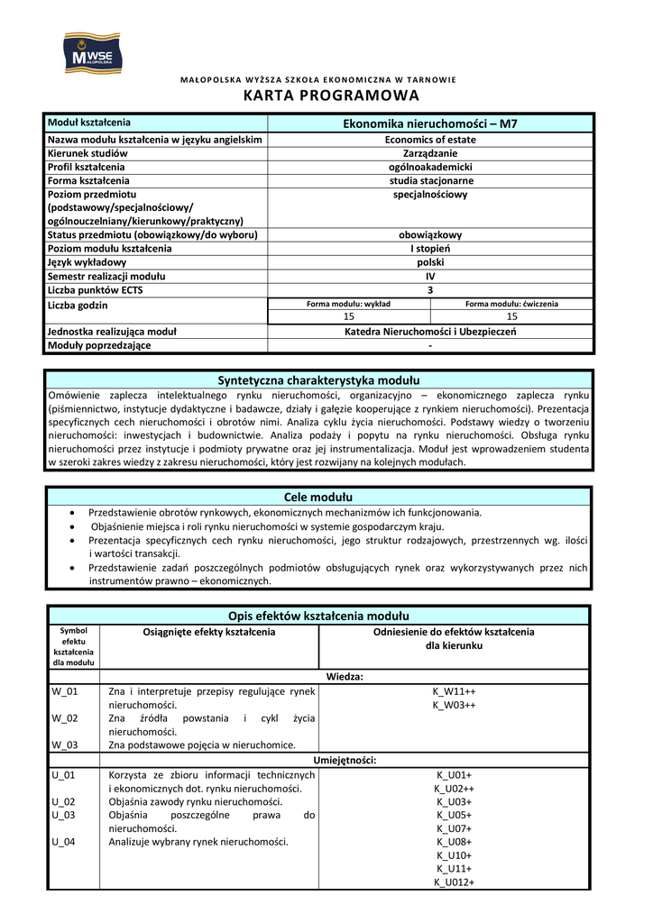 MAŁOP OLSKA WYŻSZ A SZ KOŁA E KONOMICZNA W TARN OW IE KARTA PROGRAMOWA Moduł kształcenia Ekonomika nieruchomości – M7 Nazwa modułu kształcenia w języku angielskim Kierunek studiów Profil kształcenia Forma kształcenia Poziom przedmiotu (podstawowy/specjalnościowy/ ogólnouczelniany/kierunkowy/praktyczny) Status przedmiotu (obowiązkowy/do wyboru) Poziom modułu kształcenia Język wykładowy Semestr realizacji modułu Liczba punktów ECTS Liczba godzin Economics of estate Zarządzanie ogólnoakademicki studia stacjonarne specjalnościowy obowiązkowy I stopień polski IV 3 Forma modułu: wykład Forma modułu: ćwiczenia 15 15 Katedra Nieruchomości i Ubezpieczeń - Jednostka realizująca moduł Moduły poprzedzające Syntetyczna charakterystyka modułu Omówienie zaplecza intelektualnego rynku nieruchomości, organizacyjno – ekonomicznego zaplecza rynku (piśmiennictwo, instytucje dydaktyczne i badawcze, działy i gałęzie kooperujące z rynkiem nieruchomości). Prezentacja specyficznych cech nieruchomości i obrotów nimi. Analiza cyklu życia nieruchomości. Podstawy wiedzy o tworzeniu nieruchomości: inwestycjach i budownictwie. Analiza podaży i popytu na rynku nieruchomości. Obsługa rynku nieruchomości przez instytucje i podmioty prywatne oraz jej instrumentalizacja. Moduł jest wprowadzeniem studenta w szeroki zakres wiedzy z zakresu nieruchomości, który jest rozwijany na kolejnych modułach. Cele modułu Przedstawienie obrotów rynkowych, ekonomicznych mechanizmów ich funkcjonowania. Objaśnienie miejsca i roli rynku nieruchomości w systemie gospodarczym kraju. Prezentacja specyficznych cech rynku nieruchomości, jego struktur rodzajowych, przestrzennych wg. ilości i wartości transakcji. Przedstawienie zadań poszczególnych podmiotów obsługujących rynek oraz wykorzystywanych przez nich instrumentów prawno – ekonomicznych. Opis efektów kształcenia modułu Symbol efektu kształcenia dla modułu W_01 W_02 W_03 U_01 U_02 U_03 U_04 Osiągnięte efekty kształcenia Odniesienie do efektów kształcenia dla kierunku Wiedza: Zna i interpretuje przepisy regulujące rynek nieruchomości. Zna źródła powstania i cykl życia nieruchomości. Zna podstawowe pojęcia w nieruchomice. Umiejętności: Korzysta ze zbioru informacji technicznych i ekonomicznych dot. rynku nieruchomości. Objaśnia zawody rynku nieruchomości. Objaśnia poszczególne prawa do nieruchomości. Analizuje wybrany rynek nieruchomości. K_W11++ K_W03++ K_U01+ K_U02++ K_U03+ K_U05+ K_U07+ K_U08+ K_U10+ K_U11+ K_U012+ K_01 K_02 Kompetencje społeczne: Reprezentuje podstawy postępowania etycznego. Rozumie problematykę etyczną w zakresie rynku nieruchomości. Podąża w obszarze uzupełniania swojej dotychczasowej wiedzy i umiejętności w aspekcie działalności rynku nieruchomości. K_K04++ K_K01+ Treści kształcenia modułu Forma modułu: wykład Pojęcia podstawowe w nieruchomice. Piśmiennictwo. Zakres przedmiotu. 2. Powstanie nieruchomości: A: Działalność inwestycyjna. Pojęcia. Systematyka. Rodzaje i struktura nakładów. B: Działalność budowlano – montażowa. Sieć p-stw. Wielkość i struktura produkcji budżetowo – montażowej. Developerstwo. Podstawy prawa budowlanego i elementy polityki budowlanej. 3. Zasób nieruchomości w gospodarce nieruchomościami. Rozmiary i struktura gruntów. Wielkość budynków i budowli. Zasób mieszkaniowy. Relacje majątku trwałego. 4. Funkcjonowanie rynku nieruchomości. 5. Podmioty na rynku nieruchomości. 6. Instrumenty rynkowe/ceny, czynsze, przepisy, opłaty/. 1. 1. 2. 3. 4. 5. 6. 7. Literatura podstawowa Literatura uzupełniająca Forma modułu: ćwiczenia Funkcjonowanie Katastru i Księgi Wieczystej – siedziba, zawartość. Działy KW, jawność KW, domniemanie prawdziwości wpisów, rękojmia wiary publicznej, pierwszeństwo praw wpisanych, wzmianka, ostrzeżenie – analiza przykładowych wypisów z KW i Katastru, ćwiczenia praktyczne. Polska Klasyfikacja Działalności, podstawowe sekcje, działy, przydatność PKD. Rynek nieruchomości, jego cechy, funkcje, składniki: przedmioty, podmioty, instytucje. Analiza SWOT tarnowskiego i polskiego rynku nieruchomości. Zarys rynków zagranicznych (ćwiczenia w grupach). Rynek nieruchomości w Polsce – analiza danych z Monitoringu Polskiego Rynku Nieruchomości - praca w grupach. Zawody rynku nieruchomości - zarządca nieruchomości, pośrednik w obrocie nieruchomościami, rzeczoznawca majątkowy (specyfika pracy, wymagania względem uzyskania uprawnień rzeczoznawcy majątkowego, dostępność do zawodu, praktyczne informacje). Doradca rynku nieruchomości. Inni uczestnicy rynku nieruchomości, np. developer, inwestor, notariusz, kredytodawca, itp. – praktyczne podejście. Praktyczne przejawy praw do nieruchomości. Prawa rzeczowe, ograniczone prawa rzeczowe. Inwestycje w Polsce – dane GUS (wg województw i regionów, wg PKD oraz wg klasyfikacji środków trwałych) (praca w grupach). Aktualna sytuacja na rynku kredytów hipotecznych – analiza przypadku. Budownictwo mieszkaniowe, inwestycje mieszkaniowe i niemieszkaniowe w Polsce – interpretacja danych statystycznych – zadania w grupach. E. Kucharska – Stasiak, Nieruchomości w gospodarce rynkowej, Wydawnictwo Naukowe PWN, Warszawa 2012 rok; M. Trojanek (red), Ekonomiczne uwarunkowania decyzji na rynku nieruchomości: wybrane problemy, Wydawnictwo: UE w Poznaniu, Poznań 2013 rok; M. Bryx, Rynek nieruchomości, Wydawnictwo: Poltext, Warszawa 2006 rok; M. Bryx (red), Finansowanie i gospodarka nieruchomości w procesach rewitalizacji, Wydawnictwo: Instytut Rozwoju Miast, Kraków 2009 rok; P. Wancke, Leksykon pojęć i definicji, Wydawnictwo Wolters Kluwer Polska, Warszawa 2007 rok; L. Kałkowski, Usługi nieruchomościowe w gospodarce krajów Unii Europejskiej, Zeszyt Naukowy MWSE w Tarnowie nr 1(20), s. 63 – 72, Wyd. MWSE w Tarnowie, Tarnów 2012 rok, (dostęp: http://zn.mwse.edu.pl/leszek-kalkowski-uslugi-nieru