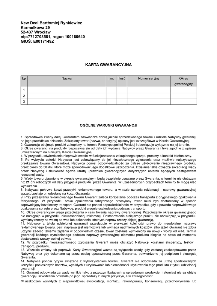 New Deal Bartłomiej Rynkiewicz Karmelkowa 29 52-437 Wrocław nip:7712703581, regon 100160640 GIOŚ: E0017149Z KARTA GWARANCYJNA Lp Nazwa j.m. Ilość Numer seryjny Okres gwarancyjny 1 2 3 OGÓLNE WARUNKI GWARANCJI 1. Sprzedawca zwany dalej Gwarantem zaświadcza dobrą jakość sprzedawanego towaru i udziela Nabywcy gwarancji na jego prawidłowe działanie. Zakupiony towar (nazwa, nr seryjny) opisany jest szczegółowo w Karcie Gwarancyjnej. 2. Gwarancja obejmuje produkt zakupiony na terenie Rzeczypospolitej Polskiej i obowiązuje wyłącznie na jej terenie. 3. Okres gwarancji na produkty rozpoczyna się od daty ich wydania Nabywcy przez Gwaranta i trwa zgodnie z wpisem umieszczonym na niniejszej Karcie Gwarancyjnej. 4. W przypadku stwierdzenia nieprawidłowości w funkcjonowaniu zakupionego sprzętu prosimy o kontakt telefoniczny. 5. Po wykryciu usterki, Nabywca jest zobowiązany do jej niezwłocznego zgłoszenia oraz możliwie najszybszego przekazania towaru Gwarantowi. Nabywca ponosi odpowiedzialność za dalsze użytkowanie niesprawnego produktu przez okres do 30 dni, które może spowodować jego dodatkowe uszkodzenia. Działanie takie oznacza akceptację wady przez Nabywcę i skutkować będzie utratą uprawnień gwarancyjnych dotyczących usterek będących następstwem rzeczonej wady. 6. Wady towaru ujawnione w okresie gwarancyjnym będą bezpłatnie usuwane przez Gwaranta, w terminie nie dłuższym niż 21 dni roboczych od daty przyjęcia produktu przez Gwaranta. W uzasadnionych przypadkach terminy te mogą ulec wydłużeniu. 8. Nabywca pokrywa koszt przesyłki reklamowanego towaru, a w razie uznania reklamacji i naprawy gwarancyjnej sprzętu zostaje on odesłany na koszt Gwaranta. 9. Przy przesyłaniu reklamowanego towaru Gwarant zaleca korzystanie podczas transportu z oryginalnego opakowania fabrycznego. W przypadku braku opakowania fabrycznego przesyłany towar musi być dostarczony w sposób zapewniający bezpieczny transport. Gwarant nie ponosi odpowiedzialności w przypadku, gdy z powodu nieprawidłowego opakowania sprzętu przez Nabywcę, produkt ulegnie uszkodzeniu podczas transportu. 10. Okres gwarancyjny ulega przedłużeniu o czas trwania naprawy gwarancyjnej. Przedłużenie okresu gwarancyjnego nie następuje w przypadku nieuzasadnionej reklamacji. Postanowienia niniejszego punktu nie obowiązują w przypadku wymiany rzeczy na wolną od wad lub dokonania istotnych napraw rzeczy objętej gwarancją. 11. Nabywcy z tytułu udzielonej gwarancji przysługuje w pierwszej kolejności prawo do nieodpłatnej naprawy reklamowanego towaru. Jeśli naprawa jest niemożliwa lub wymaga nadmiernych kosztów, albo jeżeli Gwarant nie zdoła uczynić zadość takiemu żądaniu w odpowiednim czasie, towar zostanie wymieniony na nowy - wolny od wad. Termin gwarancji każdego wymienionego podczas naprawy gwarancyjnej elementu produktu biegnie na nowo od momentu dostarczenia rzeczy wolnej od wad. 12. W przypadku nieuzasadnionego zgłoszenia Gwarant może obciążyć Nabywcę kosztami ekspertyzy, testów i transportu produktu. 13. Wszelkie zmiany lub poprawki Karty Gwarancyjnej ważne są wyłącznie wtedy, gdy zostaną zaakceptowane przez Nabywcę oraz gdy dokonane są przez osobę upoważnioną przez Gwaranta, potwierdzone jej podpisem i pieczęcią Gwaranta. 14. Nabywca ponosi ryzyko związane z wykorzystaniem towaru. Gwarant nie odpowiada za utratę spodziewanych korzyści i poniesionych kosztów, wynikłych z użytkowania lub niemożności użytkowania tego produktu z tytułu udzielonej gwarancji. 15. Gwarant odpowiada za wady wynikłe tylko z przyczyn tkwiących w sprzedanym produkcie, natomiast nie są objęte gwarancją uszkodzenia powstałe po jego sprzedaży z innych przyczyn, a w szczególności: • uszkodzeń wynikłych z nieprawidłowej eksploatacji, montażu, rekonfiguracji, konserwacji, przechowywania lub • transportu, wywołanych zdarzeniami losowymi takimi jak pożar, powódź, działania wojenne, atak terrorystycznym, klęska żywiołów czy na skutek uszkodzenia niezawinionego przez Gwaranta, w tym uszkodzenia chemicznego i mechanicznego, • w wyniku uszkodzeń będących następstwem niewłaściwej kompletacji. 16. Gwarancja nie obejmuje: • różnic wynikających z indywidualnych ustawień komputera Klienta (kolor, proporcje itp.), • uszkodzeń mechanicznych i wywołanych nimi wad, • uszkodzeń powstałych na skutek nieprzestrzegania powszechnych zasad, stosowania sprzętu niezgodnie z przeznaczeniem oraz innych uszkodzeń powstałych z winy lub niewiedzy Nabywcy. 17. Nabywca traci uprawnienia gwarancyjne w przypadku stwierdzenia przez Serwis Gwaranta następujących okoliczności: • wszelkich prób napraw, przeróbek lub zmian konstrukcyjnych podejmowanych przez nieuprawnione osoby lub firmy, • utraty karty gwarancyjnej. Duplikaty karty gwarancyjnej NIE będą wydawane. 18. Niniejsza gwarancja nie ogranicza w żaden sposób, nie zawiesza ani nie wyłącza uprawnień Nabywcy w stosunku do Sprzedawcy z tytułu roszczeń kontraktowych oraz ustawowych. 19. W sprawach nieuregulowanych niniejszymi warunkami gwarancyjnymi mają zastosowanie przepisy przepisy powszechnie obowiązujące w Rzeczypospolitej Polskiej. Akceptuję warunki gwarancji Data i podpis Nabywcy. Data i podpis Sprzedawcy/Gwaranta