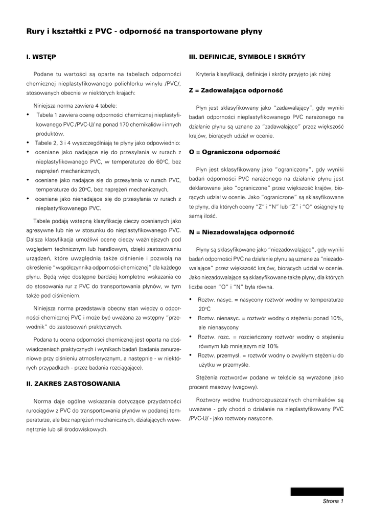 Rury i kszta³tki z PVC - odpornoœæ na transportowane p³yny I. WSTÊP III. DEFINICJE, SYMBOLE I SKRÓTY Podane tu wartoœci s¹ oparte na tabelach odpornoœci Kryteria klasyfikacji, definicje i skróty przyjêto jak ni¿ej: chemicznej nieplastyfikowanego polichlorku winylu /PVC/, stosowanych obecnie w niektórych krajach: Z = Zadowalaj¹ca odpornoœæ Niniejsza norma zawiera 4 tabele: • • • P³yn jest sklasyfikowany jako “zadawalaj¹cy”, gdy wyniki Tabela 1 zawiera ocenê odpornoœci chemicznej nieplastyfi- badañ odpornoœci nieplastyfikowanego PVC nara¿onego na kowanego PVC /PVC-U/ na ponad 170 chemikaliów i innych dzia³anie p³ynu s¹ uznane za “zadawalaj¹ce” przez wiêkszoœæ produktów. krajów, bior¹cych udzia³ w ocenie. Tabele 2, 3 i 4 wyszczególniaj¹ te p³yny jako odpowiednio: oceniane jako nadaj¹ce siê do przesy³ania w rurach z O = Ograniczona odpornoœæ nieplastyfikowanego PVC, w temperaturze do 60oC, bez P³yn jest sklasyfikowany jako “ograniczony”, gdy wyniki naprê¿eñ mechanicznych, • • oceniane jako nadaj¹ce siê do przesy³ania w rurach PVC, badañ odpornoœci PVC nara¿onego na dzia³anie p³ynu jest temperaturze do 20oC, bez naprê¿eñ mechanicznych, deklarowane jako “ograniczone” przez wiêkszoœæ krajów, bio- oceniane jako nienadaj¹ce siê do przesy³ania w rurach z r¹cych udzia³ w ocenie. Jako “ograniczone” s¹ sklasyfikowane nieplastyfikowanego PVC. te p³yny, dla których oceny “Z” i “N” lub “Z” i “O” osi¹gnê³y tê Tabele podaj¹ wstêpn¹ klasyfikacjê cieczy ocenianych jako agresywne lub nie w stosunku do nieplastyfikowanego PVC. sam¹ iloœæ. N = Niezadowalaj¹ca odpornoœæ Dalsza klasyfikacja umo¿liwi ocenê cieczy wa¿niejszych pod wzglêdem technicznym lub handlowym, dziêki zastosowaniu P³yny s¹ sklasyfikowane jako “niezadowalaj¹ce”, gdy wyniki urz¹dzeñ, które uwzglêdni¹ tak¿e ciœnienie i pozwol¹ na badañ odpornoœci PVC na dzia³anie p³ynu s¹ uznane za “niezado- okreœlenie “wspó³czynnika odpornoœci chemicznej” dla ka¿dego walaj¹ce” przez wiêkszoœæ krajów, bior¹cych udzia³ w ocenie. p³ynu. Bêd¹ wiêc dostêpne bardziej kompletne wskazania co Jako niezadowalaj¹ce s¹ sklasyfikowane tak¿e p³yny, dla których do stosowania rur z PVC do transportowania p³ynów, w tym liczba ocen “O” i “N” by³a równa. tak¿e pod ciœnieniem. • Niniejsza norma przedstawia obecny stan wiedzy o odpornoœci chemicznej PVC i mo¿e byæ uwa¿ana za wstêpny “prze- 20oC • wodnik” do zastosowañ praktycznych. Podana tu ocena odpornoœci chemicznej jest oparta na doœwiadczeniach praktycznych i wynikach badañ (badania zanurzeniowe przy ciœnieniu atmosferycznym, a nastêpnie - w niektórych przypadkach - przez badania rozci¹gaj¹ce). II. ZAKRES ZASTOSOWANIA Roztw. nasyc. = nasycony roztwór wodny w temperaturze Roztw. nienasyc. = roztwór wodny o stê¿eniu ponad 10%, ale nienasycony • Roztw. rozc. = rozcieñczony roztwór wodny o stê¿eniu • Roztw. przemys³. = roztwór wodny o zwyk³ym stê¿eniu do równym lub mniejszym ni¿ 10% u¿ytku w przemyœle. Stê¿enia roztworów podane w tekœcie s¹ wyra¿one jako procent masowy (wagowy). Norma daje ogólne wskazania dotycz¹ce przydatnoœci Roztwory wodne trudnorozpuszczalnych chemikaliów s¹ ruroci¹gów z PVC do transportowania p³ynów w podanej tem- uwa¿ane - gdy chodzi o dzia³anie na nieplastyfikowany PVC peraturze, ale bez naprê¿eñ mechanicznych, dzia³aj¹cych wew- /PVC-U/ - jako roztwory nasycone. nêtrznie lub si³ œrodowiskowych. Strona 1 Tabela 1. Odpornoœæ chemiczna nieplastyfikowanego PVC nie podlegaj¹cego naprê¿eniu mechanicznemu na p³yny przy 20oC i 60oC L.p. Chemikalia lub produkty 1. 2. 3. 4. 5. 6. 7. 8. 9. 10. 11. 12. 13. 14. 15. 16. 17. 18. 19. 20. 21. 22. 23. 24. 25. 26. 27. 28. 29. 30. 31. 32. 33. 34. 35. 36. 37. 38. 39. 40. 41. 42. 43. 44. 45. 46. 47. 48. 49. 50. 51. Aceton Akrylan etylu Aldehyd benzoesowy Aldehyd krotonowy Aldehyd octowy Aldehyd octowy Alkohol allilowy Alkohol amylowy Alkohol furfurylowy Amoniak, gaz suchy Amoniak, p³yn Amoniak, roztwór wodny Amonowy azotan Amonowy chlorek Amonowy fluorek Amonowy siarczan Anilina Anilina Aniliny chlorowodorek Antymonawy chlorek Benzen Benzyna (wêglowodory alifatyczne) Benzyna (wêglowodory alifatyczne),benzen Bezwodnik octowy Boraks Brom, p³yn Butadien Butan, gaz Butanole Butylofenol Chlor, gaz suchy Chlor, roztwór wodny Cukier Cykloheksanol Cykloheksanon Cynawy chlorek Cynku chlorek Dekstryna Dro¿d¿e Dwuchlorooctan Dwumetyloamina Etanol Etylowy eter Etylowy glikol Fenol Fenylohydrazyna Fenylohydrazynowy chlorowodór Formaldehyd Formaldehyd Fosforowodór Fosforu trójchlorek Stê¿enie 100% 100% 0.1% 100% 40% 100% 96% 100% 13% 100% Roztw.rozc. Roztw. nasyc. Roztw. nasyc. 20% Roztw. nasyc. 100% Roztw. nasyc. Roztw. nasyc. 90% 100% 80/20 100% Roztw. nasyc. 100% 100% 100% do 100% 100% 100% Roztw. nasyc. Roztw. nasyc. 100% 100% Roztw. nasyc. Roztw. nasyc. Roztw. nasyc. Roztw. nienasyc. 100% 30% 95% 100% Roztw. przemys³. 90% 100% 97% Roztw. rozc. 40% 100% 100% Z = Zadowalaj¹ca odpornoœæ, O = ograniczona odpornoœæ, N = Niezadowalaj¹ca odpornoœæ Strona 2 Temperatura 200C 600C N N N N N N O Z N Z O Z Z Z Z Z N N N Z N Z N N Z N Z Z Z O O O Z N N Z Z Z Z N Z Z N Z O N O Z Z Z N N N N N N O N Z N O Z Z O Z N N N Z N Z N N O N Z O N N N Z N N Z Z O O N O Z N N N O Z Z - L.p. 52. 53. 54. 55. 56. 57. 58. 59. 60. 61. 62. 63. 64. 65. 66. 67. 68. 69. 70. 71. 72. 73. 74. 75. 76. 77. 78. 79. 80. 81. 82. 83. 84. 85. 86. 87. 88. 89. 90. 91. 92. 93. 94. 95. 96. 97. 98. 99. 100. 101. 102. Chemikalia lub produkty Stê¿enie Gliceryna Glinowo-potasowy siarczan Glinowy chlorek Glinowy siarczan Glukoza Heksadekanol Krezole Ksylol Kwas adypinowy Kwas antrachinonosulfonowy Kwas arsenowy Kwas azotowy Kwas azotowy Kwas benzoesowy Kwas borowy Kwas bromowodorowy Kwas bromowodorowy Kwas bromowy Kwas chlorooctowy Kwas chlorosulf
