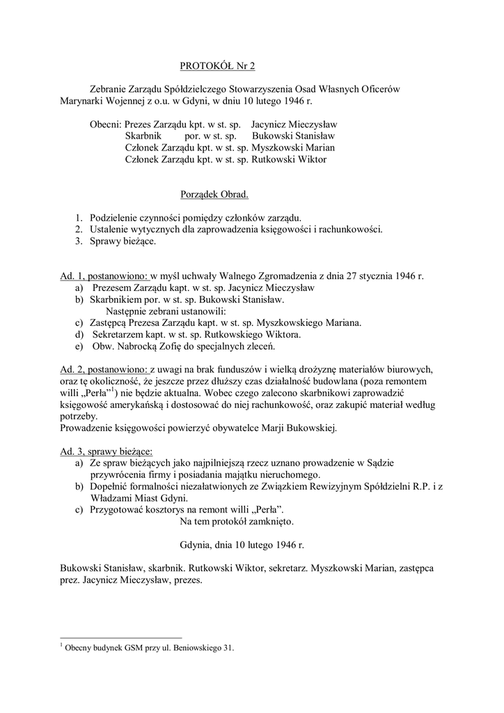 PROTOKÓŁ Nr 2 Zebranie Zarządu Spółdzielczego Stowarzyszenia Osad Własnych Oficerów Marynarki Wojennej z o.u. w Gdyni, w dniu 10 lutego 1946 r. Obecni: Prezes Zarządu kpt. w st. sp. Jacynicz Mieczysław Skarbnik por. w st. sp. Bukowski Stanisław Członek Zarządu kpt. w st. sp. Myszkowski Marian Członek Zarządu kpt. w st. sp. Rutkowski Wiktor Porządek Obrad. 1. Podzielenie czynności pomiędzy członków zarządu. 2. Ustalenie wytycznych dla zaprowadzenia księgowości i rachunkowości. 3. Sprawy bieżące. Ad. 1, postanowiono: w myśl uchwały Walnego Zgromadzenia z dnia 27 stycznia 1946 r. a) Prezesem Zarządu kapt. w st. sp. Jacynicz Mieczysław b) Skarbnikiem por. w st. sp. Bukowski Stanisław. Następnie zebrani ustanowili: c) Zastępcą Prezesa Zarządu kapt. w st. sp. Myszkowskiego Mariana. d) Sekretarzem kapt. w st. sp. Rutkowskiego Wiktora. e) Obw. Nabrocką Zofię do specjalnych zleceń. Ad. 2, postanowiono: z uwagi na brak funduszów i wielką drożyznę materiałów biurowych, oraz tę okoliczność, że jeszcze przez dłuższy czas działalność budowlana (poza remontem willi „Perła”1) nie będzie aktualna. Wobec czego zalecono skarbnikowi zaprowadzić księgowość amerykańską i dostosować do niej rachunkowość, oraz zakupić materiał według potrzeby. Prowadzenie księgowości powierzyć obywatelce Marji Bukowskiej. Ad. 3, sprawy bieżące: a) Ze spraw bieżących jako najpilniejszą rzecz uznano prowadzenie w Sądzie przywrócenia firmy i posiadania majątku nieruchomego. b) Dopełnić formalności niezałatwionych ze Związkiem Rewizyjnym Spółdzielni R.P. i z Władzami Miast Gdyni. c) Przygotować kosztorys na remont willi „Perła”. Na tem protokół zamknięto. Gdynia, dnia 10 lutego 1946 r. Bukowski Stanisław, skarbnik. Rutkowski Wiktor, sekretarz. Myszkowski Marian, zastępca prez. Jacynicz Mieczysław, prezes. 1 Obecny budynek GSM przy ul. Beniowskiego 31.