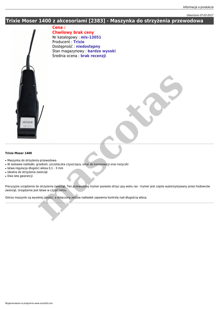 Informacje o produkcie Utworzono 07-03-2017 Trixie Moser 1400 z akcesoriami [2383] - Maszynka do strzyżenia przewodowa Cena : Chwilowy brak ceny Trixie Moser 1400 ● ● ● ● Maszynka do strzyżenia przewodowa W zestawie nakładki, grzebień, szczoteczka czyszcząca, smar do konserwacji oraz nożyczki łatwa regulacja długości włosa 0,1 - 3 mm Idealna do strzyżenia zwierząt Dwa lata gwarancji m as ● co ta s Nr katalogowy : mls-13051 Producent : Trixie Dostępność : niedostępny Stan magazynowy : bardzo wysoki Średnia ocena : brak recenzji Precyzyjne urządzenie do strzyżenia zwierząt. Ten przewodowy trymer pozwala strzyc psy wielu ras - trymer jest często wykorzystywany przez hodowców zwierząt. Urządzenie jest łatwe w czyszczeniu. Ostrza maszynki są wysokiej jakości, a dołączony zestaw nakładek zapewnia kontrolę nad długością włosa. Wygenerowano w programie www.oscGold.com