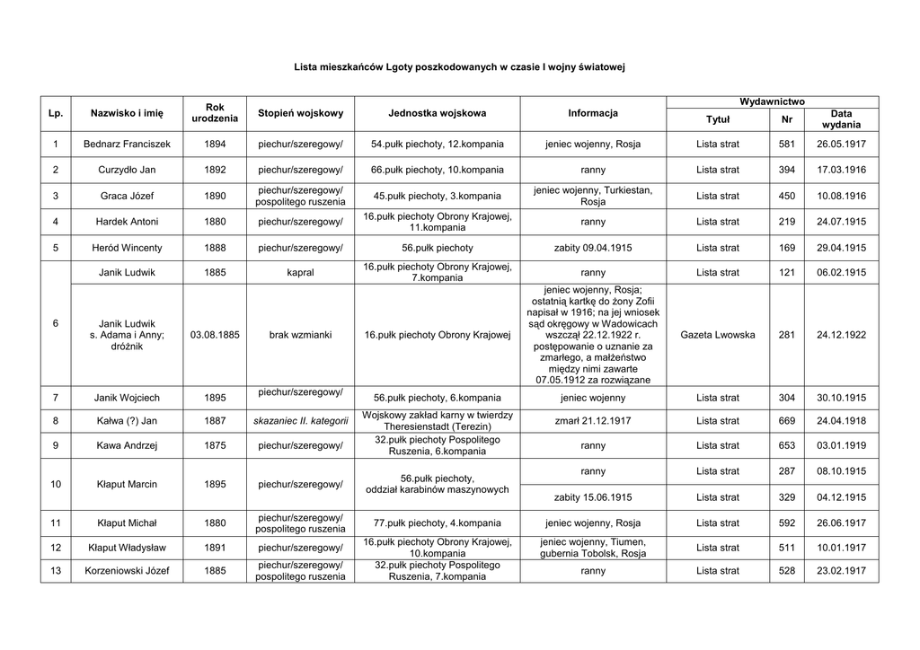 Lista mieszkańców Lgoty poszkodowanych w czasie I wojny światowej Wydawnictwo Lp. Nazwisko i imię Rok urodzenia Stopień wojskowy Jednostka wojskowa Informacja 1 Bednarz Franciszek 1894 piechur/szeregowy/ 54.pułk piechoty, 12.kompania 2 Curzydło Jan 1892 piechur/szeregowy/ 3 Graca Józef 1890 4 Hardek Antoni 5 6 Tytuł Nr Data wydania jeniec wojenny, Rosja Lista strat 581 26.05.1917 66.pułk piechoty, 10.kompania ranny Lista strat 394 17.03.1916 piechur/szeregowy/ pospolitego ruszenia 45.pułk piechoty, 3.kompania jeniec wojenny, Turkiestan, Rosja Lista strat 450 10.08.1916 1880 piechur/szeregowy/ 16.pułk piechoty Obrony Krajowej, 11.kompania ranny Lista strat 219 24.07.1915 Heród Wincenty 1888 piechur/szeregowy/ 56.pułk piechoty zabity 09.04.1915 Lista strat 169 29.04.1915 Janik Ludwik 1885 kapral 16.pułk piechoty Obrony Krajowej, 7.kompania ranny Lista strat 121 06.02.1915 16.pułk piechoty Obrony Krajowej jeniec wojenny, Rosja; ostatnią kartkę do żony Zofii napisał w 1916; na jej wniosek sąd okręgowy w Wadowicach wszczął 22.12.1922 r. postępowanie o uznanie za zmarłego, a małżeństwo między nimi zawarte 07.05.1912 za rozwiązane Gazeta Lwowska 281 24.12.1922 56.pułk piechoty, 6.kompania jeniec wojenny Lista strat 304 30.10.1915 zmarł 21.12.1917 Lista strat 669 24.04.1918 ranny Lista strat 653 03.01.1919 ranny Lista strat 287 08.10.1915 zabity 15.06.1915 Lista strat 329 04.12.1915 77.pułk piechoty, 4.kompania jeniec wojenny, Rosja Lista strat 592 26.06.1917 16.pułk piechoty Obrony Krajowej, 10.kompania 32.pułk piechoty Pospolitego Ruszenia, 7.kompania jeniec wojenny, Tiumen, gubernia Tobolsk, Rosja Lista strat 511 10.01.1917 ranny Lista strat 528 23.02.1917 Janik Ludwik s. Adama i Anny; dróżnik 03.08.1885 7 Janik Wojciech 1895 8 Kałwa (?) Jan 1887 skazaniec II. kategorii 9 Kawa Andrzej 1875 piechur/szeregowy/ 10 Kłaput Marcin 1895 piechur/szeregowy/ brak wzmianki piechur/szeregowy/ 11 Kłaput Michał 1880 piechur/szeregowy/ pospolitego ruszenia 12 Kłaput Władysław 1891 piechur/szeregowy/ 13 Korzeniowski Józef 1885 piechur/szeregowy/ pospolitego ruszenia Wojskowy zakład karny w twierdzy Theresienstadt (Terezin) 32.pułk piechoty Pospolitego Ruszenia, 6.kompania 56.pułk piechoty, oddział karabinów maszynowych 14 Kożuch Jan 1896 piechur/szeregowy/ 15 Krowiarz Michał 1877 piechur/szeregowy/ 16 Lempart Jan 1893 piechur/szeregowy/ 17 Lukaj Franciszek 1890 strzelec 18 Majtyka Jan 1894(5) 16.pułk piechoty Obrony Krajowej, 9.kompania 16.pułk piechoty Pospolitego Ruszenia 16.pułk piechoty Obrony Krajowej, 3.kompania 6.batalion strzelców polowych, 1.kompania piechur/szeregowy/ Malinowski Józef 1896 Lista strat 497 04.12.1916 jeniec wojenny, Kurgan, gubernia Tobolsk, Rosja Lista strat 391 13.03.1916 ranny Lista strat 323 27.11.1915 ranny Uzupełnienia i sprostowania E11 16.07.1915 ranny Lista strat 244 21.08.1915 ranny Lista strat 304 30.10.1915 ranny Lista strat 381 30.10.1915 zabity 20.07.1915 Lista strat 389 09.03.1916 56.pułk piechoty, 6.kompania starszy szeregowy 19 ranny piechur/szeregowy/ 56.pułk piechoty, 5.kompania 20 Małecki Ignacy 1890 piechur/szeregowy/ 56.pułk piechoty, 7.kompania ranny Lista strat 304 30.10.1915 21 Michalik Franciszek 1877 piechur/szeregowy/ 31.pułk piechoty Pospolitego Ruszenia, 8.kompania ranny Lista strat 462 09.09.1916 22 Michalik Józef 1894 piechur/szeregowy/ pospolitego ruszenia 56.pułk piechoty jeniec wojenny, obóz w Rosji Lista strat 382 26.02.1916 23 Miśkiewicz Wojciech 1888 piechur/szeregowy/ 56.pułk piechoty, 8.kompania zabity 12.07.1916 Lista strat 546 24 Mrowiec Mikołaj ? strzelec 6.batalion strzelców polowych, 1.kompania zabity 06.03.1915 Lista strat 169 25 Medoń Andrzej 1896 piechur/szeregowy/ 56.pułk piechoty, 6.kompania chory, lazaret w Ostrawie Wiadomości o rannych i chorych 434 13.07.1915 Gazeta Lwowska 249 29.10.1929 31.03.1917 29.04.1915 26 Odrobina Franciszek, s. Wojciecha 26.09.1889 brak wzmianki 56.pułk piechoty zaginął w czasie wojny, od końca 1915 bez wieści; sąd okręgowy w Wadowicach wszczął 21.10.1929 postępowanie o uznanie za zmarłego 27 Orkisz Józef 1892 piechur/szeregowy/ 56.pułk piechoty, 3.kompania ranny Lista strat 139 10.03.1915 28 Pamuła Jan 1897 piechur/szeregowy/ pospolitego ruszenia 31.pułk piechoty Pospolitego Ruszenia, 8.kompania ranny Lista strat 665 03.04.1918 29 Pasterak Wincenty 1881 piechur/szeregowy/ 56.pułk piechoty jeniec wojenny, wieś Orlówka, rejon Akmolińsk, Rosja Lista strat 428 05.06.1916 30 Radwan Andrzej 1887 piechur/szeregowy/ 56.pułk piechoty, 7.kompania ranny Lista strat 244 21.08.1915 piechur/szeregowy/ 31 Rzeszódko Bolesław 1895 kapral 32 Sikora Piotr 1880 33 Skrzyński Ignacy 1885 34 Witek Franciszek 1894 ranny Lista strat 287 08.10.1915 ranny Lista strat 546 31.03.1917 56.pułk piechoty, 1.kompania zmarł 09.01.1918 w szpitalu wojskowym w Orłowej, Czechy saper piechur/szeregowy/ 1. batalion saperski 56.pułk piechoty, 1.kompania postrzał w kręgosłup, zmarł 10.07.1916 postrzał w kręgosłup, zmarł 10.05.1915 w szpitalu polowym Nr 8/9, pochowany na cmentarzu w Grybowie postrzał w plecy, zmarł 10.05.1915 zabity 10.05.1915 Informacja o śmierci pochodzi z dokumentu wydanego 10.04.1918 r. przez Sąd Powiatowy w Wadowicach w sprawie spadkowej po zmarłym Wiadomości o 509 28.08.1916 rannych i chorych Wiadomości o rannych i chorych 420 Lista strat 329 Wiadomości o rannych i chorych 504 18.06.1915 04.12.1915 18.07.1916