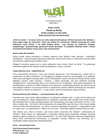 Komunikat prasowy 8.09.2014 r. Nowa marka Plush na Kartę Każdy znajdzie coś dla siebie Żeby korzystać bez konsekwencji! „Plush na kartę” – to nowa marka na rynku telekomunikacyjnym. Marka stworzona dla młodych, z którą będą mogli się utożsamić i która jest bliska ich wartościom. Młodzi otrzymują dla siebie całkowicie nowa markę, a nie tylko kolejną ofertę - więc dostają coś wyłącznie swojego, wyjątkowego i pozbawionego ograniczeń świata dorosłych. To podejście definiuje hasło i motyw przewodni komunikacji nowej marki „Bez konsekwencji”. Nowa marka dla młodych Dzisiaj młode osoby poszukują w każdym aspekcie życia bliskich sobie wartości i możliwości identyfikacji – stąd koncepcja stworzenia całkowicie nowej marki, która w maksymalny sposób spełni oczekiwania współczesnych młodych ludzi. Dlatego 9 września pojawi się na rynku całkowicie nowa marka „Plush na Kartę”. To propozycja adresowana głównie do młodych osób korzystających z usług „na kartę”. Czego właściwe chcą – zapytaliśmy ich Chcą maksymalnie korzystać z życia, bez żadnych ograniczeń i bez konsekwencji i nawet jeśli te oczekiwania są tylko marzeniem, to wymagają od swojego otoczenia, by pomagało im je spełniać. Takie same wymagania stawiają sobie, swoim rówieśnikom, klubom, do których chodzą, filmom, jakie oglądają, muzyce, jakiej słuchają i markom, z jakich korzystają. Od tych ostatnich oczekują zaangażowania i autentycznego bycia w ich świecie. By ich intrygowały i były godne posiadania. By przedstawiana im oferta nie tylko spełniała ich oczekiwania i zaspokajała potrzeby, ale również by jej komunikacja trafiała w ich poczucie humoru i wyznawane wartości. Młodzi obserwują się nawzajem: „Wszystko co robimy ma znaczenie” – a więc marki, z jakich korzystają też mają znaczenie. Bez konsekwencji dla młodych… z konsekwencjami dla rynku Powstała więc nowa marka odpowiadająca na oczekiwania młodych ludzi – marka, której hasłem jest „bez konsekwencji”. Marka dopasowana do oczekiwań i potrzeb, jakie określili sami młodzi ludzie. Bez konsekwencji, bo daje swobodę wyboru. Bez konsekwencji, bo mogą rozmawiać ile chcą i z kim chcą w każdej sieci – bez limitu. Bez konsekwencji, bo mogą SMS-ować ile chcą i z kim chcą w każdej sieci bez limitu. Bez konsekwencji – bo nikt nie narzuca im jednego rozwiązania – i mogą wybrać sami to, czego chcą. I co najważniejsze – będzie ich na to stać – Plush daje najtańszy pakiet usług na rynku. Taki właśnie jest „Plush na Kartę”, czyli nowa marka stworzona dla młodych i adresowana do młodych. Nowy brand ma odpowiadać na potrzeby młodej grupy docelowej, dlatego wszystkie działania spięte są obietnicą „braku konsekwencji”. To myśl, która definiuje zarówno przygotowanie oferty (brak konsekwencji finansowych w przypadku rozmów, SMS-ów oraz Internetu), jak i wszelkiego rodzaju aktywności komunikacyjnych. Plush – komunikacja marki Dział Komunikacji Korporacyjnej Polkomtel Sp. z o.o. E-mail: [email protected] Platforma komunikacji „Plush na Kartę” opiera się na postaci Brand Hero tzw. Plushaku, czyli pluszowym misiu, który jak większość młodej grupy docelowej nie do końca przejmuje się konsekwencjami swoich działań. Jest królem życia i urodzonym hedonistą, ma mnóstwo przyjaciół, skacze ze sceny, jeździ na longboardzie, potrafi nieźle rymować, przepada za pizzą na puszystym cieście, a jego dewizą jest „przyjemność bez konsekwencji”. „Nowa marka to również całkowicie nowa komunikacja z klientem. Proponujemy coś całkowicie nowego i odświeżającego - komunikacja będzie otwarta, odważna i wielowątkowa. Z nowym, zdystansowanym do świata dorosłych i celebrytów bohaterem, który jest przerysowanym marzeniem wielu młodych ludzi. Nasz brand hero Plushak preferuje życie bez konsekwencji, maksymalne korzystanie z życia bez konsekwencji – bo kiedy mamy być nieodpowiedzialni, jak nie w czasie młodości? I z tą koncepcją tożsama jest nasza oferta – pakiety usług dostosowane do potrzeb, bez limitu, bez ograniczeń, i bez konsekwencji.” – mówi Beata Białkowska, Dyrektor Zarządzająca ds. marketingu w Plusie i Cyfrowym Polsacie. Plush – zwiad i rozpoznanie bojem Nadejście Plusha poprzedziły intensywne działania teaserowe. Rozpoczęły je zmiany na billboardach Plusa, na których nieznani sprawcy domalowywali sprayem wielką, czarną literę H przy nazwie Plus. Kolejnym krokiem był atak hakerski na stronę internetową operatora, na której również przy nazwie sieci pojawiło się wielkie domalowane H. Co więcej profil na Facebooku sprawiał wrażenie całkowicie przejętego przez obce osoby, i że administratorzy nie mają wpływu na pojawiające się na nim treści. Dopełnieniem akcji były zhakowane w miniony weekend spoty reklamowe Plusa w telewizji. ps. Koparka, która przecięła w ostatni piątek światłowód nie była w zmowie z Plusem. Oferta „Plush na Kartę” – oferta na miarę i bez konsekwencji To propozycja dla osób, dla których najważniejszy jest nielimitowany kontakt ze wszystkimi oraz stały dostęp do Internetu w swoim telefonie. To gotowe, najtańsze na rynku zestawy usług, wśród których każdy znajdzie coś dla siebie. Klienci nie muszą się ograniczać – mogą korzystać bez limitu z tego co wybrali i bez konsekwencji i obaw o wysokie koszty! Dla tych, którzy chcą mieć wszystko, do wyboru są: 1. Rozmowy i SMS-y bez limitu do wszystkich sieci komórkowych i pakiet 0,5 GB Internetu. Jest to najtańszy zestaw usług na rynku za 35 zł na 30 dni! Dział Komunikacji Korporacyjnej Polkomtel Sp. z o.o. E-mail: [email protected] 2. Rozmowy i SMS-y bez limitu do wszystkich sieci komórkowych za 30 zł na 30 dni. 3. Rozmowy bez limitu do wszystkich sieci komórkowych za 25 zł na 30 dni. Dla tych, którzy potrzebują Internet