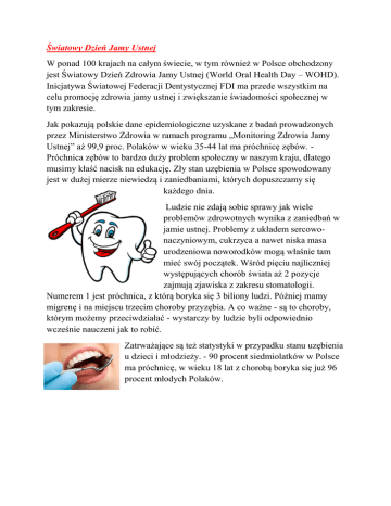 Światowy Dzień Jamy Ustnej W ponad 100 krajach na całym świecie, w tym również w Polsce obchodzony jest Światowy Dzień Zdrowia Jamy Ustnej (World Oral Health Day – WOHD). Inicjatywa Światowej Federacji Dentystycznej FDI ma przede wszystkim na celu promocję zdrowia jamy ustnej i zwiększanie świadomości społecznej w tym zakresie. Jak pokazują polskie dane epidemiologiczne uzyskane z badań prowadzonych przez Ministerstwo Zdrowia w ramach programu „Monitoring Zdrowia Jamy Ustnej” aż 99,9 proc. Polaków w wieku 35-44 lat ma próchnicę zębów. Próchnica zębów to bardzo duży problem społeczny w naszym kraju, dlatego musimy kłaść nacisk na edukację. Zły stan uzębienia w Polsce spowodowany jest w dużej mierze niewiedzą i zaniedbaniami, których dopuszczamy się każdego dnia. Ludzie nie zdają sobie sprawy jak wiele problemów zdrowotnych wynika z zaniedbań w jamie ustnej. Problemy z układem sercowonaczyniowym, cukrzyca a nawet niska masa urodzeniowa noworodków mogą właśnie tam mieć swój początek. Wśród pięciu najliczniej występujących chorób świata aż 2 pozycje zajmują zjawiska z zakresu stomatologii. Numerem 1 jest próchnica, z którą boryka się 3 biliony ludzi. Później mamy migrenę i na miejscu trzecim choroby przyzębia. A co ważne - są to choroby, którym możemy przeciwdziałać - wystarczy by ludzie byli odpowiednio wcześnie nauczeni jak to robić. Zatrważające są też statystyki w przypadku stanu uzębienia u dzieci i młodzieży. - 90 procent siedmiolatków w Polsce ma próchnicę, w wieku 18 lat z chorobą boryka się już 96 procent młodych Polaków.