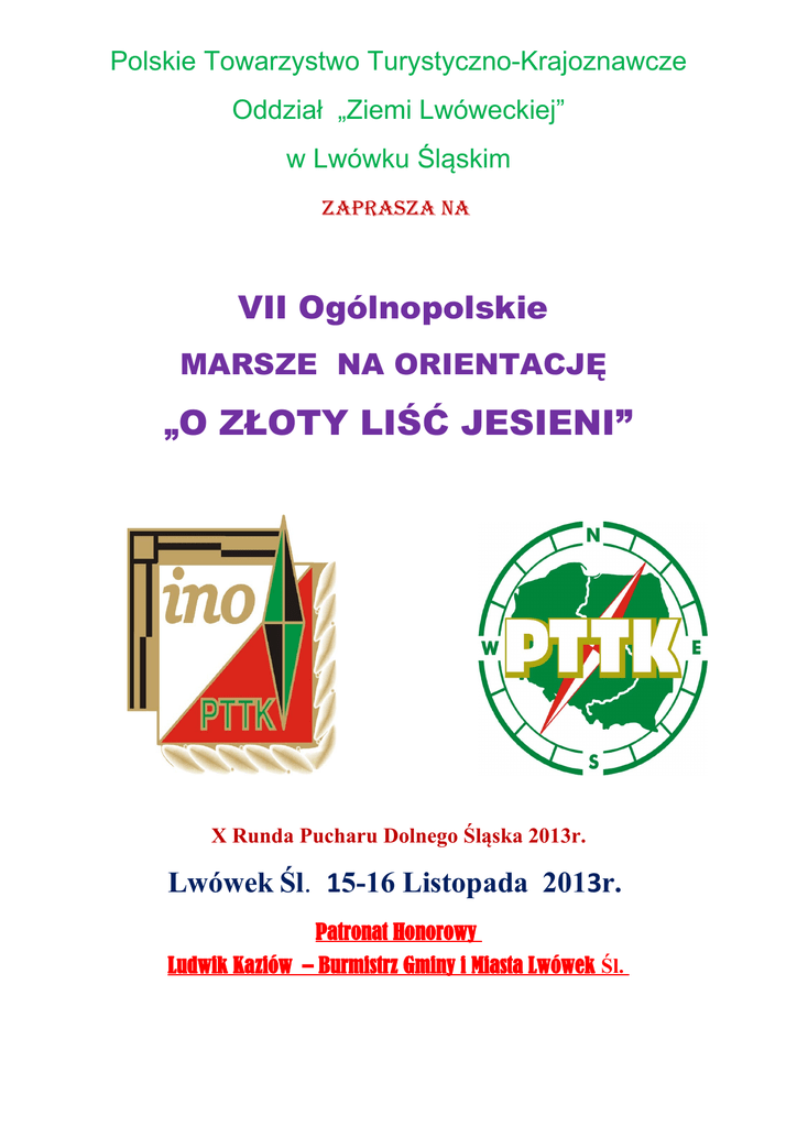 Polskie Towarzystwo Turystyczno-Krajoznawcze Oddział „Ziemi Lwóweckiej” w Lwówku Śląskim ZAPRASZA NA VII Ogólnopolskie MARSZE NA ORIENTACJĘ „O ZŁOTY LIŚĆ JESIENI” X Runda Pucharu Dolnego Śląska 2013r. Lwówek Śl. 15-16 Listopada 2013r. Patronat Honorowy Ludwik Kaziów – Burmistrz Gminy i Miasta Lwówek Śl. REGULAMIN ORGANIZATORZY Oddział PTTK „Ziemi Lwóweckiej w Lwówku Śląskim Szkoła Podstawowa nr 2 w Lwówku Śl. WSPÓŁORGANIZATORZY IMPREZA DOFINASOWANA ZE ŚRODKÓW Województwa Dolnośląskiego ZESPÓŁ GŁÓWNYCH ORGANIZATORÓW Kierownik Imprezy – Krzysztof Marecki oraz Wojciech Król (PINO) Sędzia Główny – Adam Pawłowicz ( PINO 638) Budowa etapów – Maciej Pawłowicz ( PINO 650); Paweł Idzik ( PINO629); Adam Pawłowicz ( PINO ); Piotr Kosiuk (OINO) Tomasz Karpiszyn (PINO 410) Upowszechnianie turystycznych Marszy na Orientację Promowanie Gminy Lwówek ŚL. i Powiatu Lwóweckiego Prezentacja walorów krajoznawczych Lwówka Śl i okolic Rozegranie X rundy Pucharu Dolnego Śl. w Marszach na Orientację 2013. CEL IMPREZY FORMA, ETAPY, KATEGORIE TE – zgodnie ze składem ustalonym przez Dolnośląską Komisję InO ( 1 etap dzienny i 2 nocne, zespoły 1 – 2 osobowe) TS – urodzeni w 1993 r. i wcześniej (etapy i zespoły j. w.) TJ – urodzeni w 1994 - 1996r. (etapy i zespoły j. w.) TM – urodzeni w 1997 – 1999 r. ( 2 etapy dzienne, zespoły 2 osobowe) TD – urodzeni w 2000 r i później (2 etapy dzienne, zespoły 2 osobowe) TN – urodzeni w 1997 i później TP – dla początkujących (1 etap dzienny, wiek i ilość osób w zespole dowolne), kategoria bez klasyfikacji i nagród. Odstępstwa od w/w ilości osób w zespołach zgodnie z pkt. V.7 Regulaminu Pucharu Dolnego Śląska w MnO. Każdy z uczestników może startować tylko w jednej kategorii. W kategorii TD istnieje możliwość startu zespołu 3 osobowego jednak że za zgodą sędziego głównego oraz postanowień regulaminu Pucharu Dolnego Śląska w MNO W trakcie trwania imprezy składy zespołów nie mogą ulec zmianie. Powyższe nie dotyczy kategorii TP ( zawodnicy po pokonaniu trasy TP mogą poza konkursem wystartować na trasie TD – jedynie po uzgodnieniu z Sędzią Głównym i warunkiem dysponowania przez organizatorów odpowiednią ilością materiałów. Oraz kat. TN – przeznaczonej dla uczestników kat. TD TM. ) MAPY I TEREN Mapy nietypowe, miejscami unacześniane. Teren o zmiennej przebieżności, Skala trudności etapów oraz pokonywanego terenu uzależniona jest od kategorii. Stosownie do postanowień Regulaminu Pucharu Dolnego Śląska w Marszach na Orientację BAZA IMPREZY Baza Imprezy to Szkoła Podstawowa nr 2 w Lwówku Śl. ul. Aleja Wojska Polskiego 1A PROGRAM IMPREZY: 12 Listopada 2013 ( Wtorek ) 21.00 – definitywne zakończenie przyjmowania zgłoszeń 13 -14 Listopada 2013 (środa- czwartek ) – przygotowanie materiałów, list startowych oraz tras 15 Listopada 2013 (piątek) 16.00 – 18.00 – przyjmowanie uczestników w bazie imprezy dla kat. TE TS TJ TN wydawanie materiałów startowych i świadczeń – bez możliwości wprowadzania zmian. Dodatkowe zgłoszenia możliwe tylko w przypadku rezygnacji ze startu innych uczestników. 18.00 – otwarcie imprezy i odprawa techniczna dla kat. TE TS TJ TN 18.30 – wyjazd uczestników na E-I i E- II 19.00 – start do etapu I Ok. 1.00 – zakończenie etapów – powrót do bazy. 16 Listopada 2013 ( sobota) 7.30 – 8.45 – przyjmowanie uczestników w bazie imprezy kat. TM TD TP wydawanie materiałów startowych i świadczeń - bez możliwości wprowadzania zmian. Dodatkowe zgłoszenia możliwe tylko w przypadku rezygnacji ze startu innych uczestników. 9.00 – uroczyste otwarcie zawodów i odprawa techniczna. Dla etapów dziennych. 9.30 – wyjazd lub wyjście w teren zawodów 10.00 – start do E I i E II dla kat. TP TD TM oraz E- III dla kat. TE TS TJ ok 14.30 – 15.30 – ciepły posiłek 16.00-18.00 wycieczka krajoznawcza z przewodnikiem po Lwówku Śl. ok.18.00 – uroczyste zakończenie zawodów w kat. TD i TM ŚWIADCZENIA Nocleg warunkach turystycznych dla uczestników kat. TE TS TJ TN należy posiadać własny śpiwór i karimatę Znaczek okolicznościowy Poczęstunek po I etapie dziennym ciepły posiłek po etapach dziennych – nie dotyczy kat. TP i TN komplet materiałów startowych nagrody i dyplomy dla najlepszych – nie dotyczy kat. TP. pkt. do OInO 3 x 3 pkt (kat. TE, TS, TJ) 2 x 3 pkt. (kat. TM i TD), 1 x 3 pkt (kat. TN) oraz 1x 1 pkt (kat. TP) ubezpieczenie NNW tylko dla członków PTTK. Inne niespodzianki w miarę możliwości organizatora WPISOWE Przodownicy Członkowie Pozostali Ino PTTK Uczestnicy TE TS TJ 25 27 29 TM TD TN ------------14 16 TP ------------5 7 Uczestnicy posiadający uprawnienia do zniżki powinny okazać ważne legitymacje za skorzystanie ze zniżek w bazie imprezy podczas zgłoszenia. Nie posiadający tych legitymacji w bazie będą zmuszeni do dopłaty do wpisowego Wpisowe należy wpłacać przekazem pocztowym na adres: Oddział PTTK „Ziemi Lwóweckiej” ul. Kościelna 32, 59-600 Lwówek Śląski Kategoria lub przelewem na konto: Bank Spółdzielczy w Lwówku Śląskim nr: 89 8384 0009 0011 9187 2000 0001 z dopiskiem „O INO ZŁOTY LIŚĆ” kopie dowodu wpłaty należy dołączyć do zgłoszenia. W uzasadnionych i bardzo istotnych przypadkach istnieje możliwość wpłaty wpisowego na miejscu w bazie imprezy jednak że po wcześniejszym uzgodnieniu tego faktu z organizatorem. Jednak że opłata będzie pobierana za tyle osób ile będzie zgłoszonych nawet jak te osoby nie będą obecne na imprezie. Zwolnienia z wpisowego: - Łukasz Szymański oraz Rafał Szałaj - zwycięscy PDŚl. 2012 w kat.TM - opiekunowie uczestników niepełnoletnich (1 na 10 osób) pod warunkiem zaznaczenia tego faktu w zgłoszeniu. UWAGA!!! Opiekunowie startujący w zawodach opłacają wpisowe na ogólnych zasadach. Uczestnicy kategorii TP, w ramach wpisowego nie mają zabezpieczo