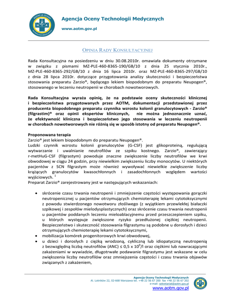 Agencja Oceny Technologii Medycznych www.aotm.gov.pl OPINIA RADY KONSULTACYJNEJ Rada Konsultacyjna na posiedzeniu w dniu 30.08.2010r. omawiała dokumenty otrzymane w związku z pismami MZ‐PLE‐460‐8365‐190/GB/10 z dnia 25 stycznia 2010r., MZ‐PLE‐460‐8365‐292/GB/10 z dnia 16 lipca 2010r. oraz MZ‐PLE‐460‐8365‐297/GB/10 z dnia 28 lipca 2010r. dotyczące przygotowania analizy skuteczności i bezpieczeństwa stosowania preparatu Zarzio®, będącego lekiem biopodobnym do preparatu Neupogen®, stosowanego w leczeniu neutropenii w chorobach nowotworowych. Rada Konsultacyjna wyraża opinię, że na podstawie oceny skuteczności klinicznej i bezpieczeństwa przygotowanych przez AOTM, dokumentacji przedstawionej przez producenta biopodobnego preparatu czynnika wzrostu kolonii granulocytowych ‐ Zarzio® (filgrastim)® oraz opinii ekspertów klinicznych, nie można jednoznacznie uznać, że efektywność kliniczna i bezpieczeństwo jego stosowania w leczeniu neutropenii w chorobach nowotworowych nie różnią się w sposób istotny od preparatu Neupogen®. Proponowana terapia Zarzio® jest lekiem biopodobnym do preparatu Neupogen®. Ludzki czynnik wzrostu kolonii granulocytów (G‐CSF) jest glikoproteiną, regulującą wytwarzanie i uwalnianie neutrofilów ze szpiku kostnego. Zarzio®, zawierający r‐metHuG‐CSF (filgrastym) powoduje znaczne zwiększenie liczby neutrofilów we krwi obwodowej w ciągu 24 godzin, przy niewielkim zwiększeniu liczby monocytów. U niektórych pacjentów z SCN filgrastym może również wywoływać niewielkie zwiększenie liczby krążących granulocytów kwasochłonnych i zasadochłonnych względem wartości wyjściowych. 1 Preparat Zarzio® zarejestrowany jest w następujących wskazaniach: skrócenie czasu trwania neutropenii i zmniejszenie częstości występowania gorączki neutropenicznej u pacjentów otrzymujących chemioterapię lekami cytotoksycznymi z powodu stwierdzonego nowotworu złośliwego (z wyjątkiem przewlekłej białaczki szpikowej i zespołów mielodysplastycznych) oraz skrócenie czasu trwania neutropenii u pacjentów poddanych leczeniu mieloablacyjnemu przed przeszczepieniem szpiku, u których występuje zwiększone ryzyko przedłużonej ciężkiej neutropenii. Bezpieczeństwo i skuteczność stosowania filgrastymu są podobne u dorosłych i dzieci otrzymujących chemioterapię lekami cytotoksycznymi, mobilizacja komórek progenitorowych krwi obwodowej, u dzieci i dorosłych z ciężką wrodzoną, cykliczną lub idiopatyczną neutropenią z bezwzględną liczbą neutrofilów (ANC) ≤ 0,5 x 109/l oraz ciężkimi lub nawracającymi zakażeniami w wywiadzie, długotrwałe podawanie filgrastymu jest wskazane w celu zwiększenia liczby neutrofilów oraz zmniejszenia częstości i czasu trwania objawów związanych z zakażeniem, Agencja Oceny Technologii Medycznych Al. Lotników 22, 02-668 Warszawa tel. +48 22 56 67 200 fax +48 22 56 67 202 e-mail: [email protected] www.aotm.gov.pl leczenie przewlekłej neutropenii (ANC ≤ 1,0 x 109/l) u pacjentów z zaawansowanym zakażeniem wirusem HIV, w celu zmniejszenia ryzyka zakażeń bakteryjnych, gdy nie można zastosować innych metod leczenia neutropenii. 1 Zalecana dawka filgrastymu wynosi 0,5 mln j./kg mc./dobę (5 μg/kg mc./dobę). Pierwszej dawki filgrastymu nie należy podawać przed upływem 24 godzin od zakończenia chemioterapii cytotoksycznej. 1 Skuteczność proponowanej terapii W ramach analizy efektywności klinicznej przedstawiono 4 badania biorównoważności preparatów Zarzio® i Neupogen®, prospektywne badanie (bez grupy kontrolnej), dotyczące stosowania preparatu Zarzio® u pacjentek z rakiem piersi oraz 4 badania przeprowadzone z użyciem preparatu Neupogen®. 2 W badaniach biorównoważności, profil farmakodynamiczny obu preparatów mieścił się w normach biorównoważności. W zakresie właściwości farmakokinetycznych, po 7 dawce preparatu Zarzio®, przedział ufności zawierał dolną granicę normy biopodobności. 2 W badaniu prospektywnym, u pacjentów z rakiem piersi przyjmujących Zarzio®, neutropeniaIV stopnia wystąpiła u 15‐47%, w zależności od cyklu chemioterapii, a trwała 1,3‐1,8 dnia. 2 W badaniach przeprowadzonych z wykorzystaniem preparatu Neupogen®, u pacjentów z rakiem piersi, neutropenia IV stopnia wystąpiła średnio u 53‐80% pacjentów w zależności od cyklu chemioterapii, a trwała 1,2‐1,7 dnia. 2 Zdaniem ekspertów klinicznych, preparat Zarzio® nie powinien być stosowany zamiennie z preparatem Neupogen®, gdyż brakuje długofalowych badań dotyczących ryzyka immunizacji pacjentów stosujących lek biopodobny. 3, 4 Bezpieczeństwo terapii ChPL podaje, że działania niepożądane, związane ze stosowaniem filgrastymu u pacjentów cierpiących na nowotwór złośliwy, obejmowały głównie bóle mięśni i kości oraz zwiększenie aktywności fosfatazy zasadowej, dehydrogenazy mleczanowej (LDH), 1 gamma‐glutamylotransferazy (GGT) i stężenia kwasu moczowego we krwi. W badaniu na pacjentach z rakiem piersi, najczęściej obserwowano bóle mięśni, kości, stawów oraz gorączkę neutropeniczną. 2 Prof. dr hab. n. med. Tomasz Pasierski Przewodniczący Rady Konsultacyjnej Piśmiennictwo: 1. Charakterystyka produktu leczniczego Zarzio® 2. Materiały dostarczone przez Producenta 3. Stanowisko eksperckie prof. dr hab. n. med. Wiesława Jędrzejczaka, Konsultanta Krajowego w dziedzinie Hematologii 4. Stanowisko zespołu ekspertów dotyczące stosowania czynników pobudzających granulopoezę. PTOK 2009 2