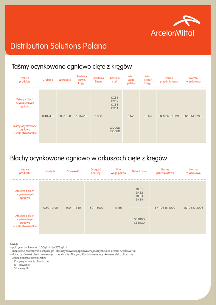 Distribution Solutions Poland Taśmy ocynkowane ogniowo cięte z kręgów Nazwa produktu Grubość Szerokość Średnica wewn. kręgu Średnica Zewn. Gatunki stali Max waga palety Max ciężar kregu Norma przedmiotowa Norma wymiarowa 5 ton 30 ton EN 10346:2009 EN10143:2006 DX51 DX52 DX53 DX54 Taśmy z blach ocynkowanych ogniowo 0,40-4,0 30 -1650 508/610 1850 Taśmy ocynkowane ogniowo – stale strukturalne S320GD S350GD Blachy ocynkowane ogniowo w arkuszach cięte z kręgów Nazwa produktu Grubość Szerokość Długość arkuszy Max waga paczki Gatunki stali Norma wymiarowa EN 10346:2009 EN10143:2006 DX51 DX52 DX53 DX54 Arkusze z blach ocynkowanych ogniowo 0,50 - 3,00 Arkusze z blach ocynkowanych ogniowo – stale strukturalne Norma przedmiotowa 100 – 1650 150 – 5000 5 ton S320GD S350GD Uwagi: - pokrycie cynkiem od 100g/m2 do 275 g/m2 - możliwość zaoferowania innych gat. stali ocynkowanej ogniowo znajdujących się w ofercie ArcelorMittal - dotyczy również blach powlekanych metalicznie: Alucynk, Aluminiowane, ocynkowane elektrolitycznie - Zabezpieczenie powierzchni C – pasywowanie chemiczne O – oliwienie SE – easyfilm