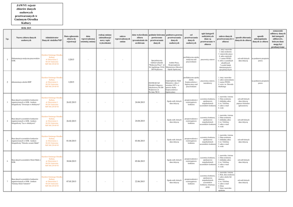 JAWNY rejestr zbiorów danych osobowych przetwarzanych w Gminnym Ośrodku Kultury ROK 2015 Lp. Nazwa zbioru danych osobowych Administrator Danych/ siedziba/NIP Dokumentacja medyczna pracowników GOK Dyrektor Gminnego Ośrodka Kultury, ul. Drzewiarza 2, 84-241 Gościcino NIP 588 239 69 93 2 dokumentacja szkoleń BHP Dyrektor Gminnego Ośrodka Kultury, ul. Drzewiarza 2, 84-241 Gościcino NIP 588 239 69 93 3 Dyrektor Gminnego Ośrodka Baza danych uczestników konkursów Kultury, organizowanych w GOK - konkurs ul. Drzewiarza 2, fotograficzny "Zwierzęta w obiektywie" 84-241 Gościcino NIP 588 239 69 93 4 Baza danych uczestników konkursów organizowanych w GOK - konkurs fotograficzny "Las w obiektywie" Dyrektor Gminnego Ośrodka Kultury, ul. Drzewiarza 2, 84-241 Gościcino NIP 588 239 69 93 5 Baza danych uczestników konkursów organizowanych w GOK - konkurs fotograficzny "Dziecko oczami Matki" Dyrektor Gminnego Ośrodka Kultury, ul. Drzewiarza 2, 84-241 Gościcino NIP 588 239 69 93 6 Dyrektor Gminnego Ośrodka Kultury, Baza danych uczestników Dzień Matki z ul. Drzewiarza 2, GOK 84-241 Gościcino NIP 588 239 69 93 1 7 Baza danych uczestników konkursów organizowanych w GOK - konkurs "Gminny Dzień Talentów" Dyrektor Gminnego Ośrodka Kultury, ul. Drzewiarza 2, 84-241 Gościcino NIP 588 239 69 93 Data zgłoszenia zbioru do rejestracji I.2015 I.2015 26.02.2015 26.02.2015 01.04.2015 data wprowadzonej ostatniej zmiany - - - - - rodzaj zmiany (aktualizacja/ nowy wpis/ wykreślenie) - - - - - zakres wprowadzonych zmian - Specjalistyczny Gabinet Lekarski kodeks Pracy, "Medycyna Pracy" ul. Rozporządzenie Dr Jagalskiego 10 84- Ministerstwa Zdrowia i 200 Wejherowo Opieki Społecznej - - - - INSTRUKTAŻ Ośrodek UsługowoSzkoleniowy 84-200 Wejherowo ul. Św.Jana 7B/14 24.04.2015 24.04.2015 03.06.2015 - - - - - - 22.06.2015 rozporządzenia Rady Ministrów z dnia 2 września 1997 r. w sprawie służby bezpieczeństwa i higieny pracy - cel przetwarzania danych osobowych profilaktyczna opieka medyczna nad pracownikami pracownicy etatowi profilaktyczna opieka złużby pracownicy etatowi, bezpieczeństwa i instruktorzy higieny pracy nad pracownikami zakres danych sposób sposób zbierania przetwarzanych w udostepniania danych do zbioru zbiorze danych ze zbioru 1. imię i nazwisko 2. data urodzenia 3. stanowisko pracy 4. adres zamieszk. 5. numer PESEL 6. infor.o czynnikach szkodliwych 7.wyniki badań laboratoryjnych i specjalistycznych -od osób których dane dotyczą 1. imię i nazwisko 2. adres zamieszkania 3. numer PESEL 4. seria i nr. Dowodu Osobistrgo przeprowadzenie i rozstrzygniecie konkursu 1. nazwiska i imiona 2. Data urodzenia 3. dokładny adres 4. nr. Telefonu 5. adres e-mail 6. wiek -od osób których dane dotyczą poprzez formularz zgłoszeniowy Zgoda osób, których dane dotyczą przeprowadzenie i rozstrzygniecie konkursu uczestnicy konkursu, opiekunowie niepełnoletnich uczestników konkursu 1. nazwiska i imiona 2. Data urodzenia 3. dokładny adres 4. nr. Telefonu 5. adres e-mail 6. wiek -od osób których dane dotyczą Zgoda osób, których dane dotyczą przeprowadzenie i rozstrzygniecie konkursu uczestnicy konkursu, opiekunowie niepełnoletnich uczestników konkursu 1. nazwiska i imiona 2. Data urodzenia 3. dokładny adres 4. nr. Telefonu 5. adres e-mail 6. wiek -od osób których dane dotyczą przeprowadzenie i rozstrzygniecie konkursu uczestnicy konkursu, opiekunowie niepełnoletnich uczestników konkursu 1. nazwiska i imiona 2. Data urodzenia 3. dokładny adres 4. nr. Telefonu 5. adres e-mail 6. wiek -od osób których dane dotyczą uczestnicy konkursu, opiekunowie niepełnoletnich uczestników konkursu, instytucje, grupy 1. nazwiska i imiona 2. Rok, data urodzenia 3. adres szkoły lub domowy 4. nr. Telefonu 5. adres e-mail 6. klasa 7. Imię i nazwisko opiekuna -od osób których dane dotyczą Zgoda osób, których dane dotyczą Zgoda osób, których dane dotyczą przeprowadzenie i rozstrzygniecie konkursu na podstawie przepisów prawa na podstawie przepisów prawa uczestnicy konkursu, opiekunowie niepełnoletnich uczestników konkursu Zgoda osób, których dane dotyczą 05.06.2015 30.04.2015 07.05.2015 data wykreślenia podmiot któremu podstawa prawna zbioru powierzono przetwarzania /przeniesienie do przetwarzanie danych archiwum danych osobowych opis kategorii osób,których dane są przetwarzane w zbiorze oznaczenie odbiorcy danych lub kategorii odbiorców, którym dane mogą być przekazywane 8 9 10 11 12 13 14 Opinie, przeglądy, protokoły Dyrektor Gminnego Ośrodka Kultury, ul. Drzewiarza 2, 84-241 Gościcino NIP 588 239 69 93 Rejestr korespondencji przychodzącej oraz wychodzącej Dyrektor Gminnego Ośrodka Kultury, ul. Drzewiarza 2, 84-241 Gościcino NIP 588 239 69 93 Umowy zawarte zgodnie z wymogami ustawy o zamówieniach publicznych Dyrektor Gminnego Ośrodka Kultury, ul. Drzewiarza 2, 84-241 Gościcino NIP 588 239 69 93 Umowy cywilnoprawne Rejest uczestników stałych warsztatów artystycznych w GOK Dyrektor Gminnego Ośrodka Kultury, ul. Drzewiarza 2, 84-241 Gościcino NIP 588 239 69 93 Dyrektor Gminnego Ośrodka Kultury, ul. Drzewiarza 2, 84-241 Gościcino NIP 588 239 69 93 Dyrektor Gminnego Ośrodka Kultury, Rejestr uczestników warsztatów podczas ul. Drzewiarza 2, ferii zimowych 84-241 Gościcino NIP 588 239 69 93 Rejestr uczestników warsztatów podczas wakacji letnich Dyrektor Gminnego Ośrodka Kultury, ul. Drzewiarza 2, 84-241 Gościcino NIP 588 239 69 93 I.2015 I.2015 I.2015 I.2015 I.2015 I.2015 VI.2015 - - - - - - - - - - - - - - - - - - - - - - XII.2015 XII.2015 XII.2015 XII.2015 III.2015 IX.2015 - - - na podstawie przepisów prawa dopełnienie obowiązków określonych w przepisach prawa na podstawie przepisów prawa osoby fizyczne i osoby prawne 1. nazwiska i imiona 2. adres zamieszkania -od osób których Korespondencja dopełnienie nadawcy i adresaci lub pobytu dane dotyczą Ustawa z dnia 14 obowiązków urzędowej na podstawie przepisów 3. adres instytucj