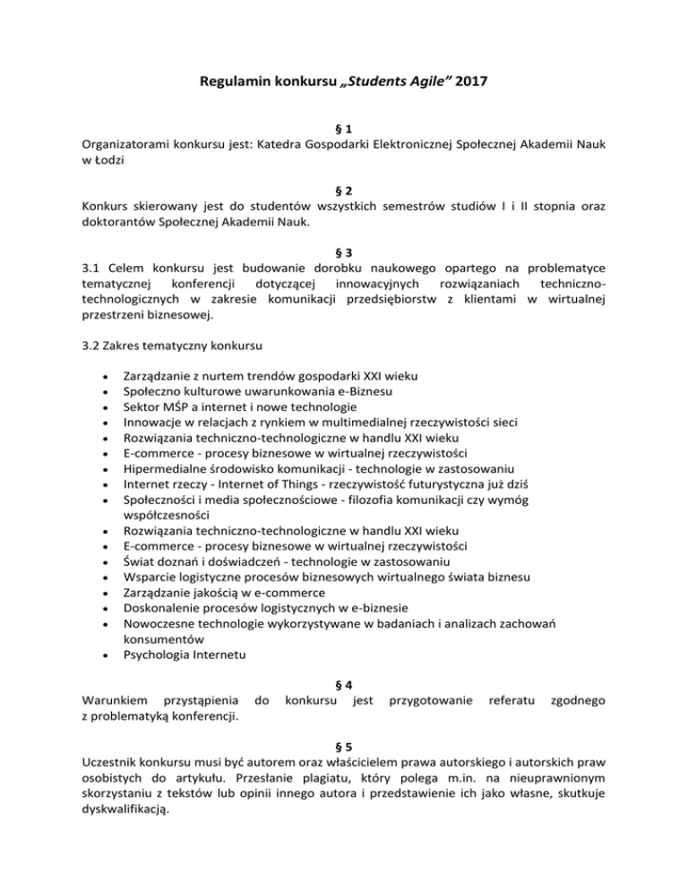 Regulamin konkursu „Students Agile” 2017 §1 Organizatorami konkursu jest: Katedra Gospodarki Elektronicznej Społecznej Akademii Nauk w Łodzi §2 Konkurs skierowany jest do studentów wszystkich semestrów studiów I i II stopnia oraz doktorantów Społecznej Akademii Nauk. §3 3.1 Celem konkursu jest budowanie dorobku naukowego opartego na problematyce tematycznej konferencji dotyczącej innowacyjnych rozwiązaniach technicznotechnologicznych w zakresie komunikacji przedsiębiorstw z klientami w wirtualnej przestrzeni biznesowej. 3.2 Zakres tematyczny konkursu Zarządzanie z nurtem trendów gospodarki XXI wieku Społeczno kulturowe uwarunkowania e-Biznesu Sektor MŚP a internet i nowe technologie Innowacje w relacjach z rynkiem w multimedialnej rzeczywistości sieci Rozwiązania techniczno-technologiczne w handlu XXI wieku E-commerce - procesy biznesowe w wirtualnej rzeczywistości Hipermedialne środowisko komunikacji - technologie w zastosowaniu Internet rzeczy - Internet of Things - rzeczywistość futurystyczna już dziś Społeczności i media społecznościowe - filozofia komunikacji czy wymóg współczesności Rozwiązania techniczno-technologiczne w handlu XXI wieku E-commerce - procesy biznesowe w wirtualnej rzeczywistości Świat doznań i doświadczeń - technologie w zastosowaniu Wsparcie logistyczne procesów biznesowych wirtualnego świata biznesu Zarządzanie jakością w e-commerce Doskonalenie procesów logistycznych w e-biznesie Nowoczesne technologie wykorzystywane w badaniach i analizach zachowań konsumentów Psychologia Internetu Warunkiem przystąpienia z problematyką konferencji. do §4 konkursu jest przygotowanie referatu zgodnego §5 Uczestnik konkursu musi być autorem oraz właścicielem prawa autorskiego i autorskich praw osobistych do artykułu. Przesłanie plagiatu, który polega m.in. na nieuprawnionym skorzystaniu z tekstów lub opinii innego autora i przedstawienie ich jako własne, skutkuje dyskwalifikacją. §6 Tekst referatu opracowany w języku polskim lub angielskim, musi być zgodny z wymogami edytorskimi Wydawnictwa Społecznej Akademii Nauk http://piz.san.edu.pl §7 7.1 Zgłoszenie udziału w konferencji następuje poprzez wypełnienie formularza rejestracyjnego dostępnego na stronie internetowej konferencji http://agilecommerce.edu.pl 7.2 Termin nadsyłania zgłoszeń upływa 28 lutego 2017 7.3 Termin nadsyłania referatów upływa 15 kwietnia 2017 7.4 Gotowe Referaty należy przesyłać tylko w wersji elektronicznej na adres mailowy konferencji [email protected] w temacie wpisując „Konferencja AgileCommerce” – III edycja §8 8.1 Nadesłane referaty zostaną ocenione przez Jury w skład, którego wchodzą: prof. dr hab. Natalia Czuchraj – przewodnicząca dr inż. Paweł Morawski dr Dominika Kaczorowska – Spychalska 8.2 Autorzy trzech najlepszych artykułów otrzymają nagrody ufundowane przez Rektora Społecznej Akademii Nauk. Wykładowcy pełniący rolę opiekunów naukowych nagrodzonych prac otrzymają wyróżnienie Rektora Społecznej Akademii Nauk. 8.3 Nagrodami w konkursie są tablety. 8.4 Wszystkie zgłoszone opracowania po przejściu pozytywnej weryfikacji zostaną opublikowane w aneksie „Debiuty” do czasopisma naukowego „Przedsiębiorczość i Zarządzanie”. §9 9.1 Prezentacja 3 najlepszych referatów odbędzie się podczas konferencji w dniu 13 maja 2017 9.2 Miejsce konferencji – Hotel Novotel Łódź Centrum, ul Piłsudskiego 11 9.3 Czas prezentacji 10-15 min.
