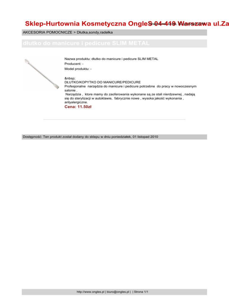 środa, Warszawa 30 grudzień 2015 Sklep-Hurtownia Kosmetyczna OngleSUtworzono: 04-419 ul.Za AKCESORIA POMOCNICZE > Dłutka,sondy,radełka dłutko do manicure i pedicure SLIM METAL Nazwa produktu: dłutko do manicure i pedicure SLIM METAL Producent: Model produktu: DŁUTKO/KOPYTKO DO MANICURE/PEDICURE Profesjonalne narzędzia do manicure i pedicure potrzebne do pracy w nowoczesnym salonie . Narzędzia , ktore mamy do zaoferowania wykonane są ze stali nierdzewnej , nadają się do sterylizacji w autoklawie, fabrycznie nowe , wysoka jakość wykonania , antyalergiczne. Cena: 11.50zł Dostępność: Ten produkt został dodany do sklepu w dniu poniedziałek, 01 listopad 2010 http://www.ongles.pl | [email protected] | | Strona 1/1
