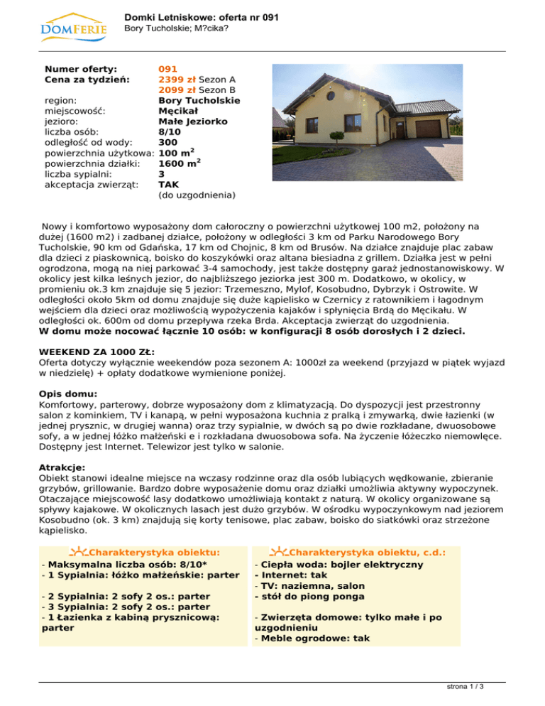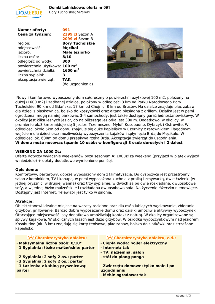 Domki Letniskowe: oferta nr 091 Bory Tucholskie; M?cika? Numer oferty: Cena za tydzień: 091 2399 zł Sezon A 2099 zł Sezon B region: Bory Tucholskie miejscowość: Męcikał jezioro: Małe Jeziorko liczba osób: 8/10 odległość od wody: 300 powierzchnia użytkowa: 100 m2 powierzchnia działki: 1600 m2 liczba sypialni: 3 akceptacja zwierząt: TAK (do uzgodnienia) Nowy i komfortowo wyposażony dom całoroczny o powierzchni użytkowej 100 m2, położony na dużej (1600 m2) i zadbanej działce, położony w odległości 3 km od Parku Narodowego Bory Tucholskie, 90 km od Gdańska, 17 km od Chojnic, 8 km od Brusów. Na działce znajduje plac zabaw dla dzieci z piaskownicą, boisko do koszykówki oraz altana biesiadna z grillem. Działka jest w pełni ogrodzona, mogą na niej parkować 3-4 samochody, jest także dostępny garaż jednostanowiskowy. W okolicy jest kilka leśnych jezior, do najbliższego jeziorka jest 300 m. Dodatkowo, w okolicy, w promieniu ok.3 km znajduje się 5 jezior: Trzemeszno, Mylof, Kosobudno, Dybrzyk i Ostrowite. W odległości około 5km od domu znajduje się duże kąpielisko w Czernicy z ratownikiem i łagodnym wejściem dla dzieci oraz możliwością wypożyczenia kajaków i spłynięcia Brdą do Męcikału. W odległości ok. 600m od domu przepływa rzeka Brda. Akceptacja zwierząt do uzgodnienia. W domu może nocować łącznie 10 osób: w konfiguracji 8 osób dorosłych i 2 dzieci. WEEKEND ZA 1000 ZŁ: Oferta dotyczy wyłącznie weekendów poza sezonem A: 1000zł za weekend (przyjazd w piątek wyjazd w niedzielę) + opłaty dodatkowe wymienione poniżej. Opis domu: Komfortowy, parterowy, dobrze wyposażony dom z klimatyzacją. Do dyspozycji jest przestronny salon z kominkiem, TV i kanapą, w pełni wyposażona kuchnia z pralką i zmywarką, dwie łazienki (w jednej prysznic, w drugiej wanna) oraz trzy sypialnie, w dwóch są po dwie rozkładane, dwuosobowe sofy, a w jednej łóżko małżeński e i rozkładana dwuosobowa sofa. Na życzenie łóżeczko niemowlęce. Dostępny jest Internet. Telewizor jest tylko w salonie. Atrakcje: Obiekt stanowi idealne miejsce na wczasy rodzinne oraz dla osób lubiących wędkowanie, zbieranie grzybów, grillowanie. Bardzo dobre wyposażenie domu oraz działki umożliwia aktywny wypoczynek. Otaczające miejscowość lasy dodatkowo umożliwiają kontakt z naturą. W okolicy organizowane są spływy kajakowe. W okolicznych lasach jest dużo grzybów. W ośrodku wypoczynkowym nad jeziorem Kosobudno (ok. 3 km) znajdują się korty tenisowe, plac zabaw, boisko do siatkówki oraz strzeżone kąpielisko. Charakterystyka obiektu: - Maksymalna liczba osób: 8/10* - 1 Sypialnia: łóżko małżeńskie: parter - 2 Sypialnia: 2 sofy 2 os.: parter - 3 Sypialnia: 2 sofy 2 os.: parter - 1 Łazienka z kabiną prysznicową: parter Charakterystyka obiektu, c.d.: - Ciepła woda: bojler elektryczny - Internet: tak - TV: naziemna, salon - stół do piong ponga - Zwierzęta domowe: tylko małe i po uzgodnieniu - Meble ogrodowe: tak strona 1 / 3 Domki Letniskowe: oferta nr 091 Bory Tucholskie; M?cika? - 2 Łazienka: z wanną: parter - Bielizna pościelowa: 10 zł/os/pobyt - Salon z kominkiem: parter - Kuchnia z wyposażeniem: parter - Pralka automatyczna: kuchnia - Zmywarka: tak - Grill ogrodowy: tak - Ognisko na działce: tak - Kuchenka elektryczna: 4 palniki z piekarnikiem - Ośrodek wypoczynkowy: ok. 3 km - Kuchenka mikrofalowa: tak - Lodówka: tak - Ogrzewanie: kominkowe oraz centralne - Kąpiel w jeziorku: 200 m - Wędkowanie: wykup zezwolenia na miejscu - Restauracja: 8 km - Lekarz: 8 km - Sklep spożywczy: 1,2 km - Wypożyczalnia sprzętu wodnego: 3 km * Łącznie 10 osób: w konfiguracji 8 osób dorosłych i 2 dzieci CENNIK: Podana poniżej i wyróżniona na pomarańczowo cena jest całkowitą ceną wynajmu domu na 1 tydzień - od soboty do soboty (zawiera w sobie kwotę rezerwacji i zaliczki). Dodatkowo dolicza się podane niżej opłady obowiązkowe i/lub nieobowiązkowe. Sezon A Sezon B TYLKO Weekendy: 25.06. - 20.08.2011. Poza sezonem A 29.04 - 03.05 (4 doby) wynajem za 1 tydzień w tym: 2399 zł/tydz 2099 zł/tydz 1349 zł za 3 doby 1699 zł za 4 doby - rezerwacja 399 zł/tydz 349 zł/tydz 299 zł/pobyt - zaliczka 200 zł/tydz 200 zł/tydz 200 zł/pobyt OPŁATY DODATKOWE: 1. Zużycie energii elekt. wg wskazań licznika; koszt 60 gr. za 1 kWh. 2. Sprzątanie domu po zakończeniu turnusu 150 zł jeżeli najemca nie chce sam wykonać tej pracy. 3. Każde zwierzę 50 zł/tydzień* 4. Drewno do kominka 1 wsad gratis, dodatkowa wiązka 30 zł 5. Bielizna pościelowa 10 zł/osoba/pobyt * w przypadku krótszych wynajmów opłata jest pobierana jak za cały tydzień strona 2 / 3 Domki Letniskowe: oferta nr 091 Bory Tucholskie; M?cika? KAUCJA 400 zł Kaucja, pobierana przez właściciela w momencie przekazania kluczy, jest zwracana po potrąceniu kwoty opłat dodatkowych oraz ewentualnych uzasadnionych kosztów szkód powstałych z winy najemcy. strona 3 / 3 Powered by TCPDF (www.tcpdf.org)