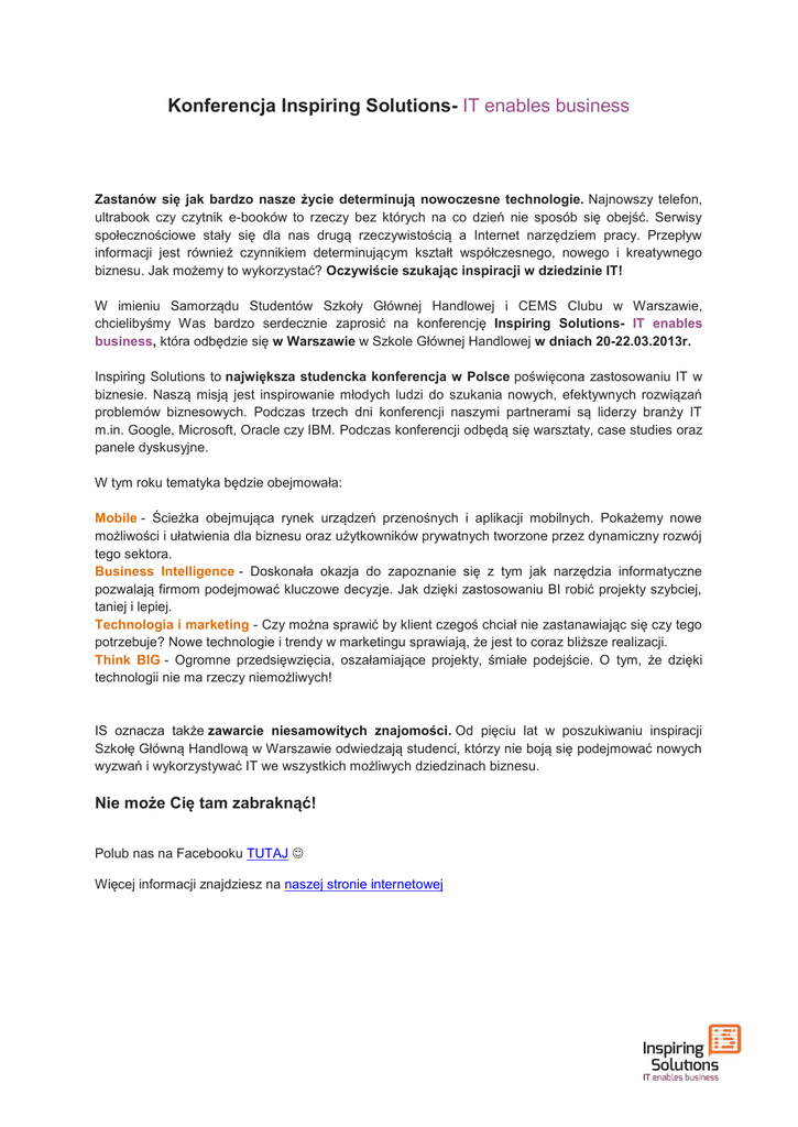 Konferencja Inspiring Solutions- IT enables business Zastanów się jak bardzo nasze życie determinują nowoczesne technologie. Najnowszy telefon, ultrabook czy czytnik e-booków to rzeczy bez których na co dzień nie sposób się obejść. Serwisy społecznościowe stały się dla nas drugą rzeczywistością a Internet narzędziem pracy. Przepływ informacji jest również czynnikiem determinującym kształt współczesnego, nowego i kreatywnego biznesu. Jak możemy to wykorzystać? Oczywiście szukając inspiracji w dziedzinie IT! W imieniu Samorządu Studentów Szkoły Głównej Handlowej i CEMS Clubu w Warszawie, chcielibyśmy Was bardzo serdecznie zaprosić na konferencję Inspiring Solutions- IT enables business, która odbędzie się w Warszawie w Szkole Głównej Handlowej w dniach 20-22.03.2013r. Inspiring Solutions to największa studencka konferencja w Polsce poświęcona zastosowaniu IT w biznesie. Naszą misją jest inspirowanie młodych ludzi do szukania nowych, efektywnych rozwiązań problemów biznesowych. Podczas trzech dni konferencji naszymi partnerami są liderzy branży IT m.in. Google, Microsoft, Oracle czy IBM. Podczas konferencji odbędą się warsztaty, case studies oraz panele dyskusyjne. W tym roku tematyka będzie obejmowała: Mobile - Ścieżka obejmująca rynek urządzeń przenośnych i aplikacji mobilnych. Pokażemy nowe możliwości i ułatwienia dla biznesu oraz użytkowników prywatnych tworzone przez dynamiczny rozwój tego sektora. Business Intelligence - Doskonała okazja do zapoznanie się z tym jak narzędzia informatyczne pozwalają firmom podejmować kluczowe decyzje. Jak dzięki zastosowaniu BI robić projekty szybciej, taniej i lepiej. Technologia i marketing - Czy można sprawić by klient czegoś chciał nie zastanawiając się czy tego potrzebuje? Nowe technologie i trendy w marketingu sprawiają, że jest to coraz bliższe realizacji. Think BIG - Ogromne przedsięwzięcia, oszałamiające projekty, śmiałe podejście. O tym, że dzięki technologii nie ma rzeczy niemożliwych! IS oznacza także zawarcie niesamowitych znajomości. Od pięciu lat w poszukiwaniu inspiracji Szkołę Główną Handlową w Warszawie odwiedzają studenci, którzy nie boją się podejmować nowych wyzwań i wykorzystywać IT we wszystkich możliwych dziedzinach biznesu. Nie może Cię tam zabraknąć! Polub nas na Facebooku TUTAJ Więcej informacji znajdziesz na naszej stronie internetowej