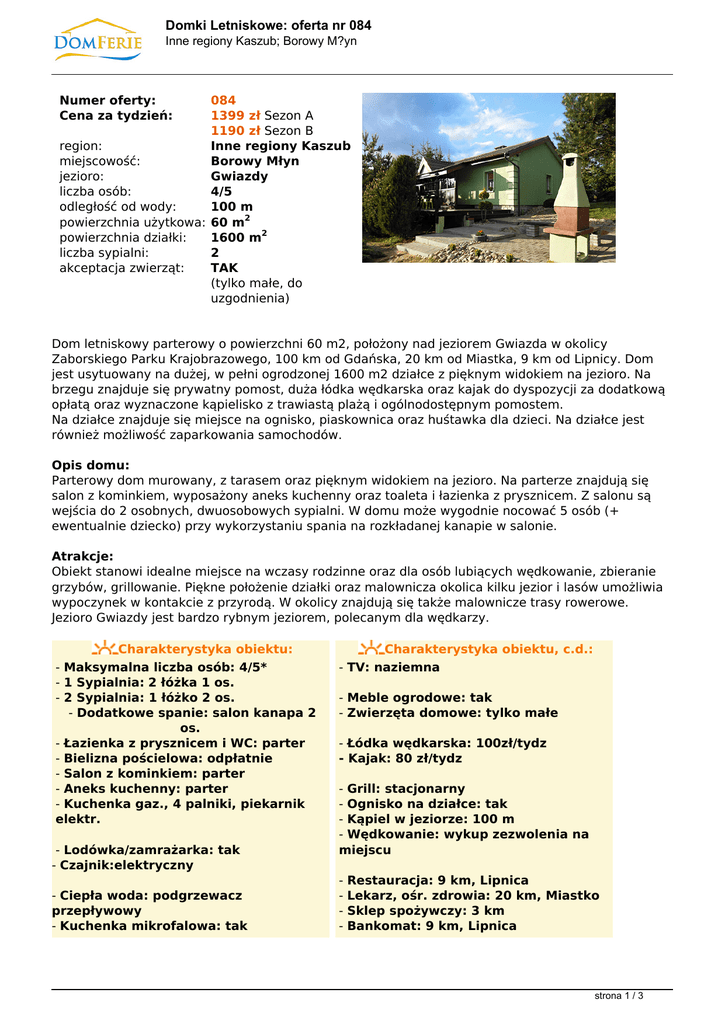 Domki Letniskowe: oferta nr 084 Inne regiony Kaszub; Borowy M?yn Numer oferty: Cena za tydzień: 084 1399 zł Sezon A 1190 zł Sezon B region: Inne regiony Kaszub miejscowość: Borowy Młyn jezioro: Gwiazdy liczba osób: 4/5 odległość od wody: 100 m powierzchnia użytkowa: 60 m2 powierzchnia działki: 1600 m2 liczba sypialni: 2 akceptacja zwierząt: TAK (tylko małe, do uzgodnienia) Dom letniskowy parterowy o powierzchni 60 m2, położony nad jeziorem Gwiazda w okolicy Zaborskiego Parku Krajobrazowego, 100 km od Gdańska, 20 km od Miastka, 9 km od Lipnicy. Dom jest usytuowany na dużej, w pełni ogrodzonej 1600 m2 działce z pięknym widokiem na jezioro. Na brzegu znajduje się prywatny pomost, duża łódka wędkarska oraz kajak do dyspozycji za dodatkową opłatą oraz wyznaczone kąpielisko z trawiastą plażą i ogólnodostępnym pomostem. Na działce znajduje się miejsce na ognisko, piaskownica oraz huśtawka dla dzieci. Na działce jest również możliwość zaparkowania samochodów. Opis domu: Parterowy dom murowany, z tarasem oraz pięknym widokiem na jezioro. Na parterze znajdują się salon z kominkiem, wyposażony aneks kuchenny oraz toaleta i łazienka z prysznicem. Z salonu są wejścia do 2 osobnych, dwuosobowych sypialni. W domu może wygodnie nocować 5 osób (+ ewentualnie dziecko) przy wykorzystaniu spania na rozkładanej kanapie w salonie. Atrakcje: Obiekt stanowi idealne miejsce na wczasy rodzinne oraz dla osób lubiących wędkowanie, zbieranie grzybów, grillowanie. Piękne położenie działki oraz malownicza okolica kilku jezior i lasów umożliwia wypoczynek w kontakcie z przyrodą. W okolicy znajdują się także malownicze trasy rowerowe. Jezioro Gwiazdy jest bardzo rybnym jeziorem, polecanym dla wędkarzy. Charakterystyka obiektu: - Maksymalna liczba osób: 4/5* - 1 Sypialnia: 2 łóżka 1 os. - 2 Sypialnia: 1 łóżko 2 os. - Dodatkowe spanie: salon kanapa 2 os. - Łazienka z prysznicem i WC: parter - Bielizna pościelowa: odpłatnie - Salon z kominkiem: parter - Aneks kuchenny: parter - Kuchenka gaz., 4 palniki, piekarnik elektr. - Lodówka/zamrażarka: tak - Czajnik:elektryczny - Ciepła woda: podgrzewacz przepływowy - Kuchenka mikrofalowa: tak Charakterystyka obiektu, c.d.: - TV: naziemna - Meble ogrodowe: tak - Zwierzęta domowe: tylko małe - Łódka wędkarska: 100zł/tydz - Kajak: 80 zł/tydz - Grill: stacjonarny - Ognisko na działce: tak - Kąpiel w jeziorze: 100 m - Wędkowanie: wykup zezwolenia na miejscu - Restauracja: 9 km, Lipnica Lekarz, ośr. zdrowia: 20 km, Miastko Sklep spożywczy: 3 km Bankomat: 9 km, Lipnica strona 1 / 3 Domki Letniskowe: oferta nr 084 Inne regiony Kaszub; Borowy M?yn - Ogrzewanie: kominek * 5 osób dorosłych + dziecko CENNIK: Podana poniżej i wyróżniona na pomarańczowo cena jest całkowitą ceną wynajmu domu na 1 tydzień - od soboty do soboty (zawiera w sobie kwotę rezerwacji i zaliczki). Dodatkowo dolicza się podane niżej opłady obowiązkowe i/lub nieobowiązkowe. wynajem za 1 tydzień w tym: Sezon A Sezon B TYLKO Weekendy: 25.06. - 20.08.2011. Poza sezonem A 29.04 - 03.05 (4 doby) 1399 zł/tydz 1190 zł/tydz 759 zł za 3 doby 929 zł za 4 doby - rezerwacja 319 zł/tydz 250 zł/tydz 249 zł/pobyt - zaliczka 200 zł/tydz 200 zł/tydz 200 zł/pobyt OPŁATY DODATKOWE: 1. 2. 3. 4. 5. 6. 7. 8. Zużycie energii elekt. wg wskazań licznika; koszt 80 gr. za 1 kWh. Sprzątanie domu po zakończeniu turnusu 100 zł jeżeli najemca nie chce sam wykonać tej pracy Drewno do kominka 1 wsad gratis, dodatkowa wiązka 30 zł Bielizna pościelowa: 10 zł/osoba/pobyt Każde zwierzę 50 zł/tydzień* Korzystanie z łodzi: 100 zł/tydz* Korzystanie z kajaka: 80 zł/tydz* Zryczałtowana opłata za wodę, ścieki i śmieci: 20zł/tydz* * w przypadku krótszych pobytów opłata naliczana jest jak za cały tydzień KAUCJA 300 zł Kaucja, pobierana przez właściciela w momencie przekazania kluczy, jest zwracana najemcy po strona 2 / 3 Domki Letniskowe: oferta nr 084 Inne regiony Kaszub; Borowy M?yn potrąceniu kwoty opłat dodatkowych oraz ewentualnych uzasadnionych kosztów szkód powstałych z jego winy. strona 3 / 3 Powered by TCPDF (www.tcpdf.org)