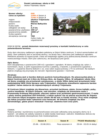 Domki Letniskowe: oferta nr 046 okolice Trójmiasta; Gdynia Numer oferty: Cena za tydzień: 046 2399 zł Sezon A 2199 zł Sezon B region: okolice Trójmiasta miejscowość: Gdynia jezioro: Morze Bałtyckie liczba osób: 6 odległość od wody: 2,5 km powierzchnia użytkowa: 200 m2 powierzchnia działki: 1000 m2 liczba sypialni: 3 akceptacja zwierząt: TAK (tylko małe, do uzgodnienia) DOM W GDYNI - przed złożeniem rezerwacji prosimy o kontakt telefoniczny w celu potwierdzenia terminu. Duży dom otoczony zadbanym ogrodem położony w Gdyni blisko centrum, 5 minut samochodem od plaży. Dom położony jest w zacisznej okolicy, na skraju lasu i otoczony jest zadbanym ogrodem. Położenie pozwala na wypoczynek z dala od miejskiego zgiełku przy jednoczesnej bliskości centrum nowoczesnego miasta. Dom jest całoroczny, do dyspozycji jest garaż. Opis domu: Dom dwupiętrowy o powierzchni 200 m2 z garażem i ogrodem. W domu znajdują się: salon z kominkiem, duża, w pełni wyposażona kuchnia z jadalnią, 2 łazienki, 2 przestronne sypialnie z łóżkami, 1 sypialnia dwoma łóżkami 1 os. oraz salon wypoczynkowy z TV na antresoli. Na każdym piętrze znajdują się przyrządy do ćwiczeń. Ogrzewanie gazowe + kominek. Atrakcje: Dom położony jest w bardzo dobrym punkcie komunikacyjnym. Do piaszczystej plaży w Gdyni Centrum jest ok 2,5km do Orłowa 6km, do Sopotu 10km. W odległości około 20m od domu znajduje się przystanek autobusowy, a około 500m dalej jest przystanek kolei podmiejskiej SKM (linie łączące całe Trójmiasto). Położenie mieszkania zapewnia bardzo szybkie i łatwe dotarcie do najważniejszych atrakcji Trójmiasta. W Centrum Gdyni znajduje się Akwarium, przystań jachtowa, plaże, liczne kafejki, puby, centra handlowe. W Gdyni Orłowie, nad morzem, znajduje się drewniane molo z Promenadą Królowej Marysieńki, placami zabaw oraz punktami gastronomicznymi. Z mola i plaży można podziwiać Klif Orłowski, a także wybrać się na pieszą wycieczkę do Sopotu lub centrum Gdyni brzegiem morza (około 30-40 min w każdą stronę). Przy molo znajduje się także przystań łodzi rybackich oraz ławeczki. W Orłowie znajduje się dom Żeromskiego, gdzie pisarz mieszkał i tworzył, stadnina koni oraz park. CENNIK: Podana poniżej i wyróżniona na pomarańczowo cena jest całkowitą ceną wynajmu domu na 1 tydzień - od soboty do soboty (zawiera w sobie kwotę rezerwacji i zaliczki). Dodatkowo dolicza się podane niżej opłady obowiązkowe i/lub nieobowiązkowe. Sezon A Sezon B TYLKO Weekendy: 25.06. - 20.08.2011. Poza sezonem A 29.04 - 03.05 (4 doby) strona 1 / 2 Domki Letniskowe: oferta nr 046 okolice Trójmiasta; Gdynia wynajem za 1 tydzień w tym: 2399 zł/tydz 2199 zł/tydz 1400 zł za 3 doby 1750 zł za 4 doby - rezerwacja 399 zł/tydz 299 zł/tydz 350 zł/pobyt - zaliczka 200 zł/tydz 200 zł/tydz 200 zł/pobyt OPŁATY DODATKOWE: 1. Zużycie energii elekt. wg wskazań licznika; koszt 60 gr. za 1 kWh. 2. Zużycie gazu wg wskazań licznika:12zł/m3 3. Sprzątanie domu po zakończeniu turnusu 150 zł jeżeli najemca nie chce sam wykonać tej pracy. 4. Drewno do kominka, jeden wsad gratis, kolejne wiązki 30 zł 5. Każde zwierzę 50 zł/tydzień 6. Bielizna pościelowa 10 zł/osoba/pobyt KAUCJA 500 zł Kaucja, pobierana przez właściciela w momencie przekazania kluczy, jest zwracana najemcy po potrąceniu kwoty opłat dodatkowych oraz ewentualnych uzasadnionych kosztów szkód powstałych z jego winy. strona 2 / 2 Powered by TCPDF (www.tcpdf.org)