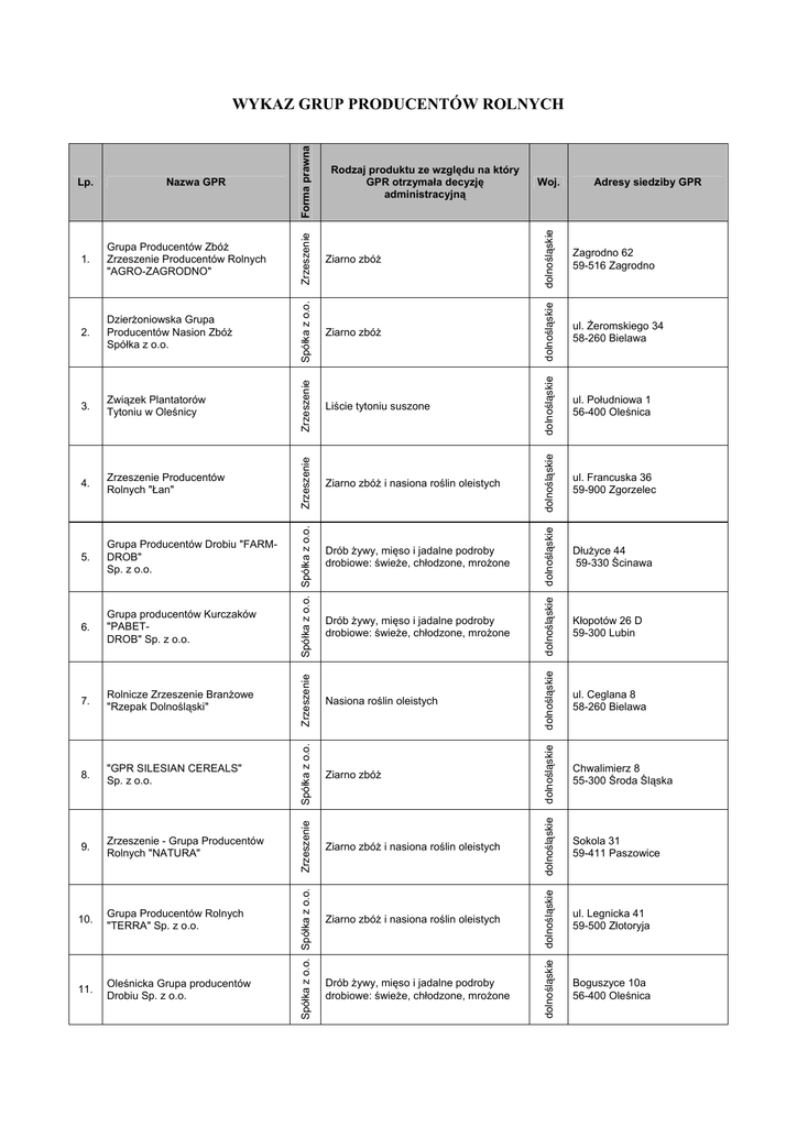 10. Grupa Producentów Rolnych "TERRA" Sp. z o.o. 11. Oleśnicka Grupa producentów Drobiu Sp. z o.o. dolnośląskie Zrzeszenie - Grupa Producentów Rolnych "NATURA" dolnośląskie 9. dolnośląskie "GPR SILESIAN CEREALS" Sp. z o.o. dolnośląskie 8. dolnośląskie Rolnicze Zrzeszenie Branżowe "Rzepak Dolnośląski" Drób żywy, mięso i jadalne podroby drobiowe: świeże, chłodzone, mrożone Dłużyce 44 59-330 Ścinawa Drób żywy, mięso i jadalne podroby drobiowe: świeże, chłodzone, mrożone dolnośląskie 7. ul. Francuska 36 59-900 Zgorzelec Kłopotów 26 D 59-300 Lubin Nasiona roślin oleistych dolnośląskie Grupa producentów Kurczaków "PABETDROB" Sp. z o.o. Ziarno zbóż i nasiona roślin oleistych ul. Ceglana 8 58-260 Bielawa Ziarno zbóż dolnośląskie 6. ul. Południowa 1 56-400 Oleśnica Chwalimierz 8 55-300 Środa Śląska Ziarno zbóż i nasiona roślin oleistych dolnośląskie Grupa Producentów Drobiu "FARMDROB" Sp. z o.o. Liście tytoniu suszone Sokola 31 59-411 Paszowice Ziarno zbóż i nasiona roślin oleistych dolnośląskie 5. ul. Żeromskiego 34 58-260 Bielawa ul. Legnicka 41 59-500 Złotoryja Drób żywy, mięso i jadalne podroby drobiowe: świeże, chłodzone, mrożone dolnośląskie Zrzeszenie Producentów Rolnych "Łan" Zrzeszenie 4. Spółka z o.o. Związek Plantatorów Tytoniu w Oleśnicy Ziarno zbóż Zrzeszenie 3. Zagrodno 62 59-516 Zagrodno Zrzeszenie Dzierżoniowska Grupa Producentów Nasion Zbóż Spółka z o.o. Ziarno zbóż Boguszyce 10a 56-400 Oleśnica Spółka z o.o. Spółka z o.o. 2. Adresy siedziby GPR Zrzeszenie Grupa Producentów Zbóż Zrzeszenie Producentów Rolnych "AGRO-ZAGRODNO" Woj. Spółka z o.o. 1. Rodzaj produktu ze względu na który GPR otrzymała decyzję administracyjną Zrzeszenie Nazwa GPR Spółka z o.o. Spółka z o.o. Lp. Forma prawna WYKAZ GRUP PRODUCENTÓW ROLNYCH 22. Rzepakowa Grupa Producencka Napus Sp. z o.o. dolnośląskie GPR "SZWEDPOL" Sp. z o.o. dolnośląskie 21. dolnośląskie Grupa Producentów Ziemniaków "KARTOFELEK" Sp. z o.o. dolnośląskie 20. dolnośląskie Grupa Producentów Rolnych "SMOŁA" Sp. z o.o. dolnośląskie 19. Wiadrów 28 59-411 Paszowice Ziarno zbóż i nasiona roślin oleistych dolnośląskie Grupa Producentów "ROLNIK" Sp. z o.o. Ziarno zbóż i nasiona roślin oleistych ul. Wrocławska 14 55-311 Kostomłoty Ziarno zbóż i nasiona roślin oleistych dolnośląskie 18. Piotrówek 37A 59-216 Kunice Chrzanów 18A 55-040 Kobierzyce Ziemniaki świeże lub chłodzone: odmiany jadalne i przemysłowe dolnośląskie Grupa Producentów Rolnych "ZAREMBA" Sp. z o.o. Drób żywy, mięso i jadalne podroby drobiowe: świeże, chłodzone, mrożone Chrzanów 18A 55-040 Kobierzyce Ziarno zbóż i nasiona roślin oleistych dolnośląskie 17. ul. Szymona Konarskiego 4/3 55-685 Wrocław ul. Średzka 14 55-311 Kostomłoty Nasiona roślin oleistych dolnośląskie "DRÓBPOL" Spółka z o.o. Spółka z o.o. 16. Drób żywy, mięso i jadalne podroby drobiowe: świeże, chłodzone, mrożone ul. Namysłowska 21 56-420 Bierutów Spółka z o.o. Spółka z o.o. Grupa Producentów Drobiu "WALDPOL" Sp. z o.o. ul. Legnicka 21 55-300 Środa Śląska Spółka z o.o. 15. Drób żywy, mięso i jadalne podroby drobiowe: świeże, chłodzone, mrożone Spółka z o.o. Grupa Producentów Drobiu "DOLDROB" Sp. z o.o. ul. Siemianicka 21 55-120 Oborniki Śląskie Spółka z o.o. Spółka z o.o. 14. Drób żywy, mięso i jadalne podroby drobiowe: świeże, chłodzone, mrożone Spółka z o.o. Grupa Producentów "SPAA" Sp. z o.o. Kilianów 26A 55-080 Kąty Wrocławskie Spółka z o.o. 13. Drób żywy, mięso i jadalne podroby drobiowe: świeże, chłodzone, mrożone Spółka z o.o. Grupa Producentów Drobiu "FARMERSS" Sp. z o.o. Spółka z o.o. 12. 33. Grupa Producentów "BAGIENIEC" spółka z ograniczoną odpowiedzialnością 34. Sady Dolne - Zboża spółka z ograniczoną odpowiedzialnością dolnośląskie "KUDUK" spółka z o.o. dolnośląskie 32. dolnośląskie "FERM-TEAM" spółka z o.o. dolnośląskie 31. dolnośląskie Grupa Producentów "AGROFAM" spółka z o.o. dolnośląskie 30. Karszów 42A 57-100 Strzelin Ziarno zbóż i nasiona roślin oleistych dolnośląskie Spółdzielnia Producentów Rolnych "AGRO - PLON" Ziarno zbóż i nasiona roślin oleistych ul. Towarowa 3 58-140 Jaworzyna Śląska Ziarno zbóż i nasiona roślin oleistych dolnośląskie 29. ul. Skoroszowska 6 51-179 Wrocław Warta Bolesławiecka 7A 59-720 Raciborowice Górne Drób żywy, mięso i jadalne podroby drobiowe: świeże, chłodzone, mrożone dolnośląskie Grupa Producentów "ROLTOP" spółka z o.o. Drób żywy, mięso i jadalne podroby drobiowe: świeże, chłodzone, mrożone ul. Przybosia 3/14 59-220 Legnica Ziarno zbóż i nasiona roślin oleistych dolnośląskie 28. Radzowice 6 56-504 Dziadowa Kłoda Warta Bolesławiecka 62 59-720 Raciborowice Górne Ziarno zbóż i nasiona roślin oleistych dolnośląskie "GALLUS" spółka z ograniczoną odpowiedzialnością Drób żywy, mięso i jadalne podroby drobiowe: świeże, chłodzone, mrożone Bagieniec 20 58-140 Jaworzyna Śląska Ziarno zbóż dolnośląskie 27. Spółka z o.o. Grupa Producencka "POL-DRÓB" spółka z ograniczoną odpowiedzialnością Gościsław 35 55-340 Udanin Sady Dolne 16 59-420 Bolków Spółka z o.o. Spółka z o.o. 26. Ziarno zbóż i nasiona roślin oleistych Spółka z o.o. "AGRO-KIELOCH" sp. z o.o. ul. A. Mickiewicza 8 55-120 Oborniki Śląskie Spółka z o.o. Spółka z o.o. 25. Drób żywy, mięso i jadalne podroby drobiowe: świeże, chłodzone, mrożone Spółdzielnia Grupa Producentów Rolnych "FERMY LASKOWSCY" sp. z o.o. ul. Namysłowska 21 56-420 Bierutów Spółka z o.o. 24. Ziarno zbóż Spółka z o.o. Zbożowa Grupa Producencka Pszenna Sp. z o.o. Spółka z o.o. Spółka z o.o. Spółka z o.o. 23. 43. Grupa Producentów Rolnych KARNICE spółka z o.o. 44. Rolniczy Zespół Spółdzielczy "ŚWIDNICA" - Spółdzielnia Osób Prawnych 45. "TERRAPOL" spółka z o.o
