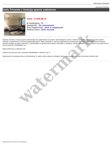 Informacje o produkcie Utworzono 07-03-2017 Sofa Trivento z funkcją spania codzienne Cena : 4.428,00 zł Nr katalogowy : FI Dostępność : Na zamówienie Stan magazynowy : brak w magazynie Średnia ocena : brak recenzji Więcej informacji w zakładce linki. er m ar k Narożnik Trivento z funkcją spania codziennego oraz pojemnikiem na pościel. Sofa dostępna w obiciu z tkaniny ze szwem zewnętrznym (Francuskim). Poduszki z wypełnieniem z pianek wysokoelastycznych. Nóżki metalowe w czarnym wybarwieniu lub drewniane (dostępne różne wybarwienia drewna). Narożnik dostęny w jednym wymiarze: 252x164x86h cm (powierzchnia spania 140x198cm). Dostępne również jako sofa z funkcją spania, bez pojemnika na pościel (wymiar: 254x96x86h cm). Podana cena dotyczy sofy o wymiarze 254x96x86h, w tkaninie z gr. A. w at Zapraszamy do naszego salonu na Mokotowską 71, gdzie można zobaczyć dostępne obicia oraz uzyskać wszystkie informacje odnośnie sofy. Wygenerowano w programie www.oscGold.com
