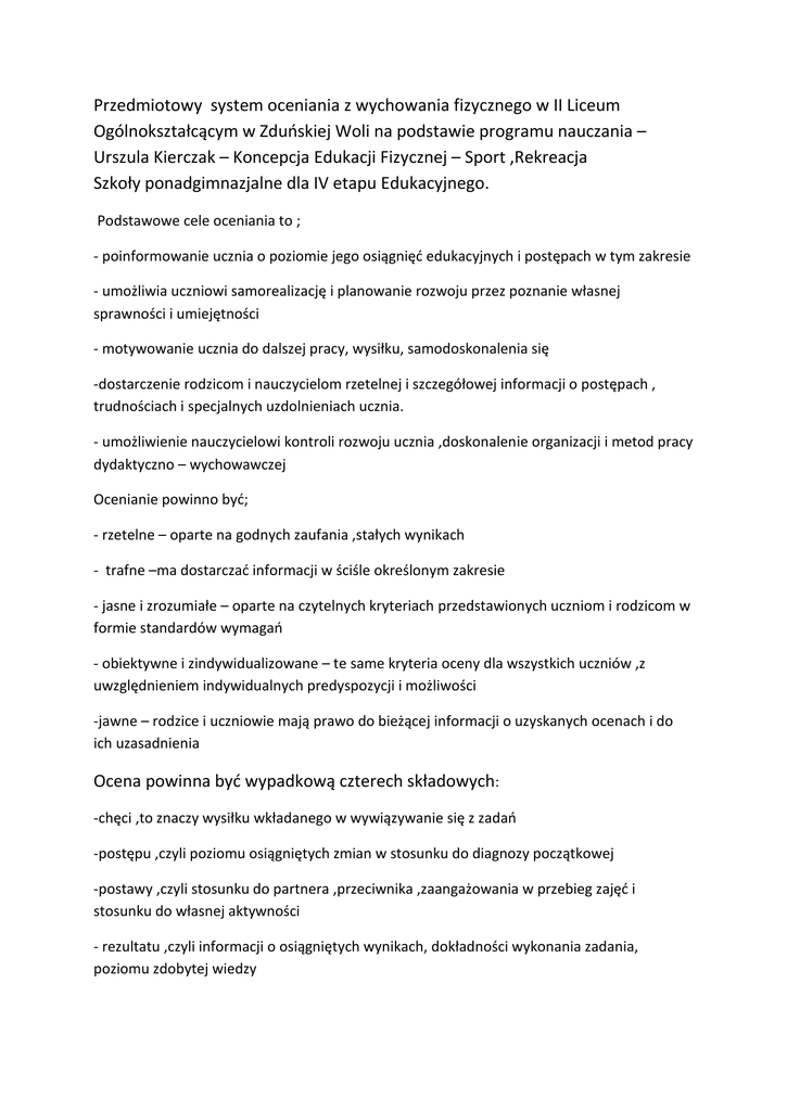 Przedmiotowy system oceniania z wychowania fizycznego w II Liceum Ogólnokształcącym w Zduoskiej Woli na podstawie programu nauczania – Urszula Kierczak – Koncepcja Edukacji Fizycznej – Sport ,Rekreacja Szkoły ponadgimnazjalne dla IV etapu Edukacyjnego. Podstawowe cele oceniania to ; - poinformowanie ucznia o poziomie jego osiągnięd edukacyjnych i postępach w tym zakresie - umożliwia uczniowi samorealizację i planowanie rozwoju przez poznanie własnej sprawności i umiejętności - motywowanie ucznia do dalszej pracy, wysiłku, samodoskonalenia się -dostarczenie rodzicom i nauczycielom rzetelnej i szczegółowej informacji o postępach , trudnościach i specjalnych uzdolnieniach ucznia. - umożliwienie nauczycielowi kontroli rozwoju ucznia ,doskonalenie organizacji i metod pracy dydaktyczno – wychowawczej Ocenianie powinno byd; - rzetelne – oparte na godnych zaufania ,stałych wynikach - trafne –ma dostarczad informacji w ściśle określonym zakresie - jasne i zrozumiałe – oparte na czytelnych kryteriach przedstawionych uczniom i rodzicom w formie standardów wymagao - obiektywne i zindywidualizowane – te same kryteria oceny dla wszystkich uczniów ,z uwzględnieniem indywidualnych predyspozycji i możliwości -jawne – rodzice i uczniowie mają prawo do bieżącej informacji o uzyskanych ocenach i do ich uzasadnienia Ocena powinna byd wypadkową czterech składowych: -chęci ,to znaczy wysiłku wkładanego w wywiązywanie się z zadao -postępu ,czyli poziomu osiągniętych zmian w stosunku do diagnozy początkowej -postawy ,czyli stosunku do partnera ,przeciwnika ,zaangażowania w przebieg zajęd i stosunku do własnej aktywności - rezultatu ,czyli informacji o osiągniętych wynikach, dokładności wykonania zadania, poziomu zdobytej wiedzy Skala ocen Zarówno w ocenianiu cząstkowym ,jak i semestralnym oraz rocznym stosowane są następujące stopnie i ich cyfrowe odpowiedniki: 1- niedostateczny 2- dopuszczający 3 – dostateczny 4 – dobry 5- bardzo dobry 6 – celujący Dodatkowe oznaczenia plus ,minus Podstawą oceny jest wysiłek włożony przez ucznia w wywiązywanie się z obowiązków wynikających ze specyfiki zajęd. Ocenianiu podlegają: - sumiennośd i starannośd w wywiązywaniu się z obowiązków wynikających z przedmiotu -zaangażowanie w przebieg lekcji i przygotowanie się do zajęd - stosunek do partnera i przeciwnika -stosunek do własnego ciała - aktywnośd fizyczna - postęp w opanowaniu umiejętności i wiadomości przewidzianych dla poszczególnych klas zgodnie z indywidualnymi możliwościami i predyspozycjami - osiągnięte wyniki w sportach wymiernych ,dokładnośd wykonywania zadania i poziom zdobytej wiedzy. W klasie programowo najwyższej ,przy wystawianiu oceny koocowo –szkolnej będą brane pod uwagę oceny uzyskane w klasach wcześniejszych Ocena celująca – uzyskuje uczeo który - osiągnął sprawnośd fizyczną znacznie wykraczającą poza program nauczania w danej klasie - prowadzi sportowy i higieniczny tryb życia, chętnie uczestniczy w zajęciach sportowo – rekreacyjnych - reprezentuje szkołę w zawodach i konkursach różnego szczebla - był obecny na 95% zajęd - postawa i stosunkiem do wf nie budzi zastrzeżeo - uzyskuje bardzo dobre i celujące oceny ze sprawdzianów - systematycznie uczestniczy w zajęciach w klubach sportowych - wykazał znajomośd przepisów sportowych oraz dużą wiedzę na temat sportu na świecie Ocena bardzo dobra – otrzymuje uczeo który - osiągnął sprawnośd fizyczną określoną programem nauczania - prowadzi sportowy i higieniczny tryb życia , chętnie uczestniczy w zajęciach sportowo rekreacyjnych - był obecny na 95 % zajęd - postawą i stosunkiem do wf nie budzi zastrzeżeo - systematycznie doskonali swoją sprawnośd fizyczną - wykazuje znajomośd przepisów sportowych - uzyskuje bardzo dobre wyniki ze sprawdzianów - bierze udział w zawodach Ocena dobra – otrzymuje uczeo który - opanował umiejętności i wiadomości na poziomie podstawowym - wywiązuje się z obowiązków ,osiąga postępy -był obecny na 85 % zajęd -bierze chętnie udział w zajęciach -postawą i stosunkiem do wf nie budzi zastrzeżeo -osiąga dobre wyniki ze sprawdzianów -wykazał się dobrą znajomością przepisów sportowych - posiada wystarczające nawyki higieniczno zdrowotne Ocenę dostateczną otrzymuje uczeo który - osiągnął sprawnośd fizyczną określoną programem nauczania nieprzekraczającą wymagao zawartych w minimum -posiada 70 % obecności na wf -osiąga dostateczne i dobre oceny ze sprawdzianów - przejawia braki w postawie i stosunku do wf - wykazuje małe postępy w usprawnianiu motorycznym - z wiadomości z wf ma spore braki -obniżył wyniki sprawności motorycznej z poprzednich lat - dysponuje przeciętną sprawnością motoryczną Ocenę dopuszczającą otrzymuje uczeo który - ledwo spełnia wymagania określone programem nauczania -opuszcza zajęcia i ma 65 % obecności na wf -nie jest pilny w czasie zajęd - nie wykazuje zaangażowania w przebieg lekcji -posiada małe wiadomości z zakresu wf -nie potrafi wykonad prostych zadao -obniżył wyniki sprawności motorycznej - nie opanował materiał w stopniu dostatecznym - osiąga ocen y dostateczne i dopuszczające ze sprawdzianów Ocenę niedostateczną otrzymuje uczeo który - nie spełnia wymagao programowych -opuszcza zajęcia i ma 55%obecności na zajęciach wf - nie jest pilny w czasie zajęd - wykazuje się praktycznie nie wiedzą z wf -nie bierze czynnego udziału w lekcji - otrzymuje ze sprawdzianów oceny dopuszczające i niedostateczne - ma niską sprawnośd motoryczną i nie osiąga postępów Sposób informowania o ocenach O uzyskaniu poszczególnych ocen uczniowie i rodzice będą informowani przez wpis do dziennika ,bezpośrednio po otrzymaniu oceny .O proponowanej ocenie semestralnej i rocznej rodzice i uczniowie zostaną poinformowani najpóźniej na dwa tygodnie przed rada pedagogiczną .