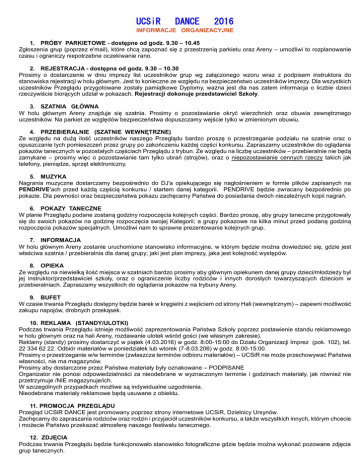 UCSiR DANCE 2016 INFORMACJE ORGANIZACYJNE 1. PRÓBY PARKIETOWE - dostępne od godz. 9.30 – 10.45 Zgłoszenia grup (poprzez e'mail), które chcą zapoznać się z przestrzenią parkietu oraz Areny – umożliwi to rozplanowanie czasu i ograniczy niepotrzebne oczekiwanie rano. 2. REJESTRACJA - dostępna od godz. 9.30 – 10.30 Prosimy o dostarczenie w dniu imprezy list uczestników grup wg załączonego wzoru wraz z podpisem instruktora do stanowiska rejestracji w holu głównym. Jest to konieczne ze względu na bezpieczeństwo uczestników imprezy. Dla wszystkich uczestników Przeglądu przygotowane zostały pamiątkowe Dyplomy, ważna jest dla nas zatem informacja o liczbie dzieci rzeczywiście biorących udział w pokazach. Rejestracji dokonuje przedstawiciel Szkoły. 3. SZATNIA GŁÓWNA W holu głównym Areny znajduje się szatnia. Prosimy o pozostawianie okryć wierzchnich oraz obuwia zewnętrznego uczestników. Na parkiet ze względów bezpieczeństwa dopuszczamy wejście tylko w zmienionym obuwiu. 4. PRZEBIERALNIE (SZATNIE WEWNĘTRZNE) Ze względu na dużą ilość uczestników naszego Przeglądu bardzo proszę o przestrzeganie podziału na szatnie oraz o opuszczanie tych pomieszczeń przez grupy po zakończeniu każdej części konkursu. Zapraszamy uczestników do oglądania pokazów tanecznych w pozostałych częściach Przeglądu z trybun. Ze względu na liczbę uczestników – przebieralnie nie będą zamykane – prosimy więc o pozostawianie tam tylko ubrań (strojów), oraz o niepozostawianie cennych rzeczy takich jak telefony, pieniądze, sprzęt elektroniczny. 5. MUZYKA Nagrania muzyczne dostarczamy bezpośrednio do DJ'a opiekującego się nagłośnieniem w formie plików zapisanych na PENDRIVE'ach przed każdą częścią konkursu / startem danej kategorii. PENDRIVE będzie zwracany bezpośrednio po pokazie. Dla pewności oraz bezpieczeństwa pokazu zachęcamy Państwa do posiadania dwóch niezależnych kopii nagrań. 6. POKAZY TANECZNE W planie Przeglądu podane zostaną godziny rozpoczęcia kolejnych części. Bardzo proszę, aby grupy taneczne przygotowały się do swoich pokazów na godzinę rozpoczęcia swojej Kategorii; a grupy pokazowe na kilka minut przed podaną godziną rozpoczęcia pokazów specjalnych. Umożliwi nam to sprawne prezentowanie kolejnych grup. 7. INFORMACJA W holu głównym Areny zostanie uruchomione stanowisko informacyjne, w którym będzie można dowiedzieć się, gdzie jest właściwa szatnia / przebieralnia dla danej grupy; jaki jest plan imprezy, jaka jest kolejność występów. 8. OPIEKA Ze względu na niewielką ilość miejsca w szatniach bardzo prosimy aby głównym opiekunem danej grupy dzieci/młodzieży był jej instruktor/przedstawiciel szkoły, oraz o ograniczenie liczby rodziców i innych dorosłych towarzyszących dzieciom w przebieralniach. Zapraszamy wszystkich do oglądania pokazów na trybuny Areny. 9. BUFET W czasie trwania Przeglądu dostępny będzie barek w kręgielni z wejściem od strony Hali (wewnętrznym) – zapewni możliwość zakupu napojów, drobnych przekąsek. 10. REKLAMA (STANDY/ULOTKI) Podczas trwania Przeglądu istnieje możliwość zaprezentowania Państwa Szkoły poprzez postawienie standu reklamowego w holu głównym oraz na hali Areny, rozdawanie ulotek wśród gości (we własnym zakresie). Reklamy (standy) prosimy dostarczyć w piątek (4.03.2016) w godz. 8:00-15:00 do Działu Organizacji Imprez (pok. 102), tel. 22 334 62 22. Odbiór materiałów w poniedziałek lub wtorek (7-8.03.206) w godz. 8:00-15:00. Prosimy o przestrzeganie w/w terminów (zwłaszcza terminów odbioru materiałów) – UCSiR nie może przechowywać Państwa własności, nie ma magazynów. Prosimy aby dostarczone przez Państwa materiały były oznakowane – PODPISANE Organizator nie ponosi odpowiedzialności za nieodebrane w wyznaczonym terminie i godzinach materiały, jak również nie przetrzymuje /NIE magazynuje/ich. W szczególnych przypadkach możliwe są indywidualne uzgodnienia. Nieodebrane materiały reklamowe będą usuwane z obiektu. 11. PROMOCJA PRZEGLĄDU Przegląd UCSiR DANCE jest promowany poprzez strony internetowe UCSiR, Dzielnicy Ursynów. Zachęcamy do zapraszania rodziców oraz rodzin i przyjaciół uczestników konkursu, a także wszystkich innych, którym chcecie i możecie Państwo przekazać atmosferę naszego festiwalu tanecznego. 12. ZDJĘCIA Podczas trwania Przeglądu będzie funkcjonowało stanowisko fotograficzne gdzie będzie można wykonać pozowane zdjęcia grup tanecznych.