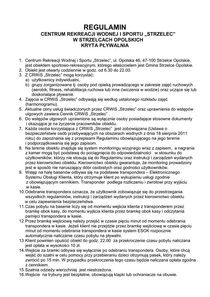REGULAMIN CENTRUM REKREACJI WODNEJ I SPORTU „STRZELEC” W STRZELCACH OPOLSKICH KRYTA PŁYWALNIA 1. Centrum Rekreacji Wodnej i Sportu „Strzelec”, ul. Opolska 46, 47-100 Strzelce Opolskie, jest obiektem sportowo-rekreacyjnym, którego właścicielem jest Gmina Strzelce Opolskie. 2. Obiekt jest otwarty codziennie w godz. od 6.30 do 22.00. 3. Z CRWiS „Strzelec” mogą korzystać: a) użytkownicy indywidualni, b) grupy zorganizowane tj. osoby pod opieką prowadzącego w zakresie zajęć ruchowych (aerobik, fitness, rehabilitacja ruchowa lub inne ćwiczenia w wodzie) oraz uczące się lub doskonalące pływanie. 4. Zajęcia w CRWiS „Strzelec” odbywają się według ustalonego rozkładu zajęć (harmonogramu). 5. Aktualne ceny usług świadczonych przez CRWiS „Strzelec” oraz uprawnienia do wstępów ulgowych zawiera Cennik CRWiS „Strzelec” . 6. Do wstępów ulgowych uprawnione są wyłącznie osoby posiadające stosowne dokumenty i okazujące je na życzenie pracowników obiektu. 7. Każda osoba korzystająca z CRWiS „Strzelec” jest zobowiązana (Ustawa o bezpieczeństwie osób przebywających na obszarach wodnych z dnia 18 sierpnia 2011 roku) do zapoznania się z przepisami Regulaminu obowiązującego na jego terenie i podporządkowania się jego zapisom. 8. Na terenie obiektu znajduje się system monitoringu wizyjnego wraz z zapisem, a nagrania z kamer mogą być podstawą do pociągnięcia do odpowiedzialności w stosunku do użytkowników, którzy nie stosują się do Regulaminu oraz instrukcji i zarządzeń wydanych przez kierownictwo obiektu. Kierownictwo obiektu gwarantuje, że monitoring prowadzony jest w sposób nie naruszający dóbr osobistych oraz godności użytkowników. 9. Wstęp na halę basenów odbywa się na podstawie transpondera – Elektronicznego Systemu Obsługi Klienta, który otrzymuje klient po wykupieniu usługi zgodnie z obowiązującym cennikiem. Transponder podlega rozliczeniu i zwrotowi przy wyjściu w kasie. 10. Odebranie transpondera oznacza, że użytkownik zobowiązuje się do przestrzegania wszystkich regulaminów, instrukcji i zarządzeń wydanych przez kierownictwo obiektu w celu zapewnienia bezpieczeństwa. 11. Czas pobytu na basenie liczy się od momentu wejścia klienta z transponderem przez bramkę obok kasy, do momentu wyjścia klienta przez bramkę obok kasy i odczytania pamięci transpondera w kasie. 12. Przez bramkę wejściową należy przejść w czasie pięciu minut od momentu odebrania transpondera w kasie. Jeżeli klient nie przejdzie przez bramkę wejściową w czasie pięciu minut od momentu odebrania transpondera w kasie system ESOK rozpocznie automatycznie naliczanie czasu pobytu na pływalni. 13. Klient powinien opuścić obiekt do godz. 22.00 za przekroczenie czasu pobytu naliczana jest opłata w wysokości 10 zł. 14. Wejście za bramki odbywa się wyłącznie po odebraniu transpondera. Osoby, które chcą wejść do szatni w celu pomocy przy przebieraniu dzieci otrzymują pasek, który należy zwrócić po 15 min. W przypadku przekroczenia tego czasu będzie naliczana opłata zgodna z cennikiem. 15. Szatnia odzieży wierzchniej jest niestrzeżona. 16. Wejście na trybuny jest bezpłatne, obowiązują klapki lub ochraniacze na obuwie. 17. Za niewykorzystane bilety wstępu oraz w przypadku wydalenia użytkownika z obiektu, uiszczone opłaty nie są zwracane. 18. Kierownictwo CRWiS „Strzelec” może czasowo ograniczyć wstęp na pływalnię ze względu na przekroczenie maksymalnej liczby osób korzystających z obiektu. 19. Po przejściu przez bramkę obok kasy, a przed wejściem do przebieralni obowiązuje zmiana obuwia zewnętrznego na obuwie basenowe w „strefie zmiany obuwia”. Buty należy zabrać do szafki basenowej, reklamówki są do pobrania na korytarzu przed przebieralnią. 20. Zmiana ubrania na strój basenowy odbywa się w przebieralni basenowej. 21. Dzieci do lat 3 korzystające z basenu muszą posiadać na sobie jednorazowe pieluchomajtki do kąpieli. 22. CRWiS „Strzelec” dysponuje specjalnymi pomieszczeniami z przewijakami dla matki/ojca z małym dzieckiem. W celu uzyskania pomocy rodzice proszeni są o zgłoszenie się do pracownika w kasie. 23. Dzieci do lat 9 mogą przebywać w obiekcie jedynie pod opieką osób pełnoletnich. Osoby te ponoszą pełną odpowiedzialność za powierzone ich opiece dzieci i odpowiadają za wszelkie szkody przez nie wyrządzone. Opiekun płaci za pobyt na pływalni według obowiązującego cennika. 24. Przed wyjściem z przebieralni na teren niecki basenowej należy sprawdzić, czy szafka została prawidłowo zamknięta. Za rzeczy, pieniądze i przedmioty wartościowe pozostawione w szafkach otwartych lub nieprawidłowo zamkniętych, kierownictwo obiektu nie ponosi odpowiedzialności. 25. Każdą osobę obowiązuje przed wejściem do wody umycie się pod natryskiem (także po skorzystaniu z WC). 26. Osoby korzystające z kąpieli w nieckach basenowych obowiązuje czysty strój kąpielowy, nogawki spodenek kąpielowych nie mogą sięgać poza kolana (z wyłączeniem kostiumów pływackich, skafandrów nurkowych oraz innych specjalnych strojów do pływania). Strój kąpielowy nie może posiadać zamków błyskawicznych ani żadnych wstawek metalowych, które mogą stanowić zagrożenie dla zdrowia lub bezpieczeństwa użytkowników oraz być przyczyną uszkodzeń elementów wyposażenia. 27. W hali basenów zabrania się pozostawiania bez nadzoru dzieci nie umiejących pływać. 28. Na halę basenową obiektu zakazuje się wstępu osobom z plastrami i bandażami na ciele. 29. Wstęp do CRWiS „Strzelec” jest bezpłatny dla opiekuna: osoby niepełnosprawnej o orzeczonym znacznym stopniu niepełnosprawności, osoby niepełnosprawnej poruszającej się na wózku inwalidzkim, osoby niewidomej, osoby niepełnosprawnej (dziecka do 16 roku życia), po okazaniu aktualnych dokumentów potwierdzających ten fakt. 30. W celu uzyskania pomocy osoby niepełnosprawne 