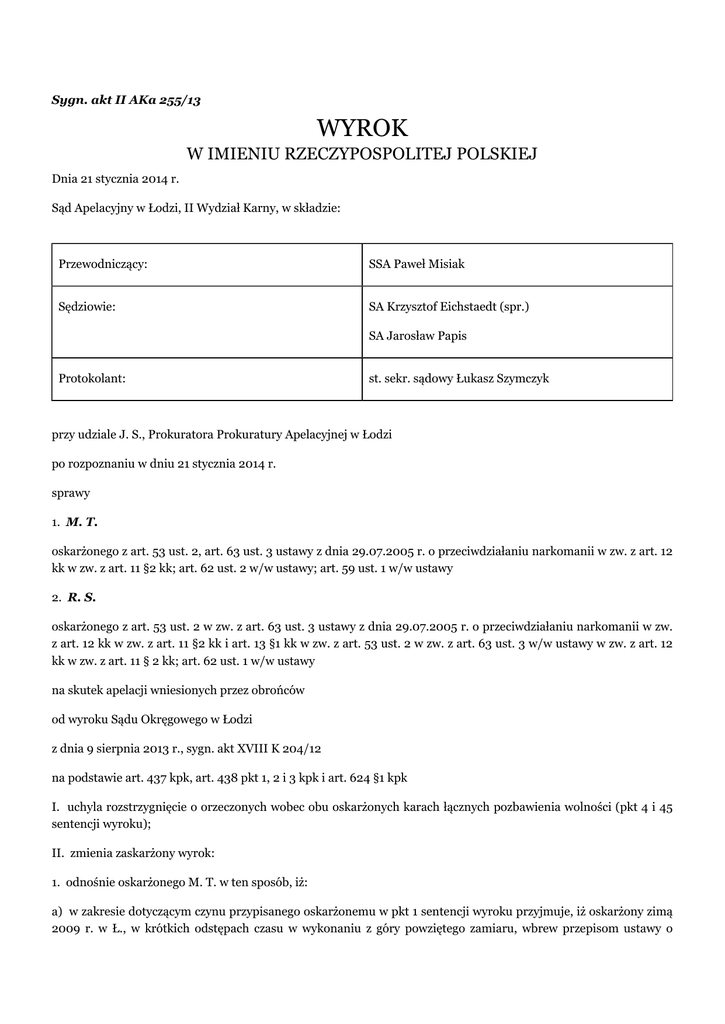 Sygn. akt II AKa 255/13 WYROK W IMIENIU RZECZYPOSPOLITEJ POLSKIEJ Dnia 21 stycznia 2014 r. Sąd Apelacyjny w Łodzi, II Wydział Karny, w składzie: Przewodniczący: SSA Paweł Misiak Sędziowie: SA Krzysztof Eichstaedt (spr.) SA Jarosław Papis Protokolant: st. sekr. sądowy Łukasz Szymczyk przy udziale J. S., Prokuratora Prokuratury Apelacyjnej w Łodzi po rozpoznaniu w dniu 21 stycznia 2014 r. sprawy 1. M. T. oskarżonego z art. 53 ust. 2, art. 63 ust. 3 ustawy z dnia 29.07.2005 r. o przeciwdziałaniu narkomanii w zw. z art. 12 kk w zw. z art. 11 §2 kk; art. 62 ust. 2 w/w ustawy; art. 59 ust. 1 w/w ustawy 2. R. S. oskarżonego z art. 53 ust. 2 w zw. z art. 63 ust. 3 ustawy z dnia 29.07.2005 r. o przeciwdziałaniu narkomanii w zw. z art. 12 kk w zw. z art. 11 §2 kk i art. 13 §1 kk w zw. z art. 53 ust. 2 w zw. z art. 63 ust. 3 w/w ustawy w zw. z art. 12 kk w zw. z art. 11 § 2 kk; art. 62 ust. 1 w/w ustawy na skutek apelacji wniesionych przez obrońców od wyroku Sądu Okręgowego w Łodzi z dnia 9 sierpnia 2013 r., sygn. akt XVIII K 204/12 na podstawie art. 437 kpk, art. 438 pkt 1, 2 i 3 kpk i art. 624 §1 kpk I. uchyla rozstrzygnięcie o orzeczonych wobec obu oskarżonych karach łącznych pozbawienia wolności (pkt 4 i 45 sentencji wyroku); II. zmienia zaskarżony wyrok: 1. odnośnie oskarżonego M. T. w ten sposób, iż: a) w zakresie dotyczącym czynu przypisanego oskarżonemu w pkt 1 sentencji wyroku przyjmuje, iż oskarżony zimą 2009 r. w Ł., w krótkich odstępach czasu w wykonaniu z góry powziętego zamiaru, wbrew przepisom ustawy o przeciwdziałaniu narkomanii uprawiał środki odurzające w postaci konopii innych niż włókniste, z której wytworzył środek odurzający w postaci 20 g marihuany, to jest przyjmuje, że popełniono przestępstwo wyczerpujące dyspozycję art. 53 ust.1 ustawy z dnia 29 lipca 2005 r. o przeciwdziałaniu narkomanii i art.63 ust. 1 wcześniej wspomnianej ustawy w zw. z art. 12 kk i w zw. z art. 11 §2 kk i za to na podstawie art. 53 ust. 1 ustawy z dnia 29 lipca 2005 r. o przeciwdziałaniu narkomanii w zw. z art. 11 §3 kk wymierza oskarżonemu karę 1 (jednego) roku pozbawienia wolności, b) w zakresie czynów przypisanych oskarżonemu w pkt 2 i 3 sentencji wyroku podstawę wymiaru kary uzupełnia o przepis art. 60 §2 i 6 pkt 3 kk, 2. odnośnie oskarżonego R. S. w ten sposób, iż: a) w zakresie dotyczącym czynu przypisanego oskarżonemu w pkt 43 sentencji wyroku zmienia opis czynu w ten sposób, iż przyjmuje, że zarówno wytworzona ilość środka odurzającego jak i ilość środka odurzającego w postaci marihuany, którą oskarżony zamierzał wytworzyć nie stanowiło znacznej ilości tego środka, a zachowaniem swoim oskarżony wyczerpał dyspozycję art. 53 ust. 1 ustawy z dnia 29 lipca 2005 r. o przeciwdziałaniu narkomanii i art. 63 ust. 1 wcześnie cytowanej ustawy w zw. z art. 11 §2 kk i art. 13 §1 kk w zw. z art. 53 ust. 1 ustawy z dnia 29 lipca 2005 r. o przeciwdziałaniu narkomanii i art. 13 §1 kk w zw. z art. 63 ust. 1 wcześniej cytowanej ustawy w zw. z art. 11 §2 kk i w zw. z art. 12 kk i za to na podstawie art. 53 ust. 1 ustawy a dnia 29 lipca 2005 r. o przeciwdziałaniu narkomanii w zw. z art. 11 §3 kk wymierza oskarżonemu karę 1 (jednego) roku pozbawienia wolności, b) w zakresie dotyczącym czynu przypisanego oskarżonemu w pkt 44 sentencji wyroku, w opisie czynu zwrot „w ilości nie mniejszej niż 20 g.” zastępuje zwrotem „w ilości nie mniejszej niż 10 g.” i przyjmuje, że oskarżony zachowaniem swoim wyczerpał dyspozycję art. 62 ust. 1 ustawy z dnia 29 lipca 2005 r. o przeciwdziałaniu narkomanii i na podstawie w/wym. przepisu wymierza oskarżonemu karę 5 (pięciu) miesięcy pozbawienia wolności, II. na podstawie art. 85 §1 kk i art. 86 §1 kk za zbiegające się przestępstwa wymierza łączne kary pozbawienia wolności: 1. oskarżonemu M. T. 1 (jeden) rok, 2. oskarżonemu R. S. 1 (jeden) rok, III. w pozostałym zakresie zaskarżony wyrok utrzymuje w mocy, w tym co do warunkowego zawieszenia wykonania kar, środków probacyjnych i środka karnego, IV. zasądza od Skarbu Państwa na rzecz adw. M. B. – obrońcy z urzędu oskarżonego M. T. i adw. W. W. – obrońcy z urzędu oskarżonego R. S. kwoty po 738 (siedemset trzydzieści osiem) złotych, tytułem kosztów nieopłaconej pomocy prawnej udzielonej w postępowaniu odwoławczym z urzędu w/wym. oskarżonym, V. zwalnia oskarżonych od ponoszenia kosztów sądowych związanych z postępowaniem odwoławczym. Sygn. akt II AKa 255/13 UZASADNIENIE Wyrokiem z dnia 9 sierpnia 2013r. wydanym w sprawie XVIII K 204/12 Sąd Okręgowy w Łodzi uznał za winnych, m. in. : 1) oskarżonego M. T. popełnienia przestępstw wyczerpujących dyspozycję: a) art. 53 ust. 2 ustawy z dnia 29 lipca 2005 r. o przeciwdziałaniu narkomanii i art.63 ust. 3 wcześniej wspomnianej ustawy w zw. z art. 12 k.k. i w zw. z art. 11 §2 k.k. i za to przy zastosowaniu nadzwyczajnego złagodzenia orzekł karę 2 lata pozbawienia wolności oraz 50 stawek dziennych grzywny; b) art. 62 ust. 2 ustawy z dnia 29 lipca 2005r. o przeciwdziałaniu narkomanii w zw. z art. 12 k.k. i za to wymierzył oskarżonemu karę 6 miesięcy pozbawienia wolności; c) art. 59 ust. 1 ustawy z dnia 29 lipca 2005 r. o przeciwdziałaniu narkomanii i za to wymierzył oskarżonemu karę 3 miesiące pozbawienia wolności; 2) oskarżonego M. S. popełnienia przestępstw wyczerpujących dyspozycję: a) art. 53 ust. 2 ustawy z dnia 29 lipca 2005 r. o przeciwdziałaniu narkomanii i art. 63 ust. 3 wcześniej cytowanej ustawy w zw. z art. 11 §2 k.k. i art. 13 §1 k.k. w zw. z art. 53 ust. 2 ustawy z dnia 29 lipca 2005 r. o przeciwdziałaniu narkomanii i art. 13 §1 k.k. w zw. z art. 63 ust. 3 wcześniej cytowanej ustawy w zw. z art. 11 §2 k.k. i w zw. z art. 12 k.k. i za przy zastosowaniu instytucji nadzwyczajnego złagodzenia kary wymierzył oskarżonemu karę 2 lata pozbawienia wolności oraz 50 stawek dz