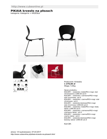 http://www.cubeonline.pl PIKAIA krzesło na płozach kategoria: Kategorie > KRZESŁA Producent: Kristalia 1 279,00 zł Waga: 5.6kg Opcje produktu: KOLORY: : siedzisko: białe/P01+nogi: stal chromowana 1399.00 szt.0 KOLORY: : siedzisko: czerwone/P02+nogi: stal chromowa szt.0 KOLORY: : siedzisko: czarne/P03+nogi: stal chromowa szt.0 KOLORY: : siedzisko:beżowe/P04+nogi: stal chromowa 1399.00 szt.0 KOLORY: : siedzisko: białe/P01+nogi: biały lakier 1399.00 szt.0 KOLORY: : siedzisko: czerwone/P02+nogi: czerwony lakier szt.0 KOLORY: : siedzisko: czarne/P03+nogi: czarny lakier szt.0 KOLORY: : siedzisko:beżowe/P04+nogi: beżowy lakier 1399.00 szt.0 Kod QR: strona: 1/3 wydrukowano: 07-03-2017 http://www.cubeonline.pl/pikaia-krzeslo-na-plozach.html Dopasowuj?ce si?, wszechstronne i wygodne krzes?o Pikaia spe?nia wszystkie wymagania stawiane krzes?om kontraktowym i dla sektora publicznego. Jest niezwykle mocne, na co nie b?d? narzeka? tak?e jego indywidualni nabywcy. Jego struktura, o ?ukowym i ergonomicznym kszta?cie, jest wykonana z formowanego poliuretanu i dost?pna w kolorze bia?ym, czarnym lub czerwonym. Oparcie zosta?o zaprojektowany do dobrego podparcia pleców i dostosowuje si? do kszta?tu cia?a. Jego stalowa, rurowa rama malowana jest w tych samych kolorach co reszta krzes?a. Pikaia jest krzes?em sztaplowanym (maksymalnie 4 sztuki na sobie). WYMIARY (CM): wysoko?? siedziska- 45 wysoko?? ca?kowita- 83 szeroko??- 51 g??boko??- 50 strona: 2/3 wydrukowano: 07-03-2017 http://www.cubeonline.pl/pikaia-krzeslo-na-plozach.html MATERIA?: siedzisko- tworzywo-poliuretan nogi- stal polerowana lub lakier w kolorze siedziska Inne produkty Kristalia: http://www.cubeonline.pl/manufacturer/kristalia Inne produkty projektanta: http://www.cubeonline.pl/designer/natuzzi-angelo strona: 3/3 wydrukowano: 07-03-2017 http://www.cubeonline.pl/pikaia-krzeslo-na-plozach.html