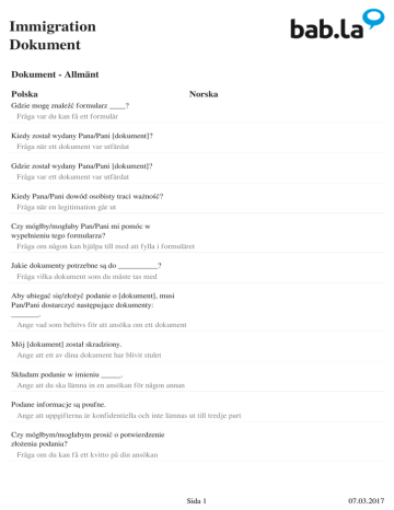 Immigration Dokument Dokument - Allmänt Polska Norska Gdzie mogę znaleźć formularz ____? Fråga var du kan få ett formulär Kiedy został wydany Pana/Pani [dokument]? Fråga när ett dokument var utfärdat Gdzie został wydany Pana/Pani [dokument]? Fråga var ett dokument var utfärdat Kiedy Pana/Pani dowód osobisty traci ważność? Fråga när en legitimation går ut Czy mógłby/mogłaby Pan/Pani mi pomóc w wypełnieniu tego formularza? Fråga om någon kan hjälpa till med att fylla i formuläret Jakie dokumenty potrzebne są do __________? Fråga vilka dokument som du måste tas med Aby ubiegać się/złożyć podanie o [dokument], musi Pan/Pani dostarczyć następujące dokumenty: _______. Ange vad som behövs för att ansöka om ett dokument Mój [dokument] został skradziony. Ange att ett av dina dokument har blivit stulet Składam podanie w imieniu _____. Ange att du ska lämna in en ansökan för någon annan Podane informacje są poufne. Ange att uppgifterna är konfidentiella och inte lämnas ut till tredje part Czy mógłbym/mogłabym prosić o potwierdzenie złożenia podania? Fråga om du kan få ett kvitto på din ansökan Sida 1 07.03.2017 Immigration Dokument Dokument - Personlig information Polska Norska Jak się Pan/Pani nazywa? Fråga efter någons namn Czy mógłby/mogłaby Pan/Pani podać swoją datę i miejsce urodzenia? Fråga var och när någon är född Gdzie Pan/Pani mieszka? Fråga var någon bor Jaki jest Pana/Pani adres? Fråga efter någons adress Jakie posiada Pana/Pani obywatelstwo? Fråga om någons medborgarskap Kiedy przyjechał/a Pan/Pani do [nazwa kraju]? Fråga när någon anlände till landet Czy mógłbym/mogłabym zobaczyć Pana/Pani dowód osobisty? Fråga om någon kan visa dig sin legitimation Dokument - Civilstatus Polska Norska Mój stan cywilny: _____. Ange din civilstatus kawaler/panna Civilstatus żonaty/zamężna Civilstatus Sida 2 07.03.2017 Immigration Dokument w separacji Civilstatus rozwodnik/rozwódka Civilstatus w konkubinacie Civilstatus w rejestrowanym związku partnerskim Civilstatus w związku partnerskim Civilstatus w związku partnerskim (ze wspólnym gospodarstwem domowym) Civilstatus wdowiec/wdowa Civilstatus Czy ma Pan/Pani dzieci? Fråga om någon har barn Czy mieszka Pan/Pani z osobami na Pana/Pani utrzymaniu? Fråga om någon finansierar de samboende Chciałbym/Chciałabym skorzystać z prawa do łączenia rodzin. Ange din avsikt att återförenas med din familj Dokument - Registrering i staden Polska Norska Chciałbym/Chciałabym się zameldować (w nowym miejscu zamieszkania). Ange att du till registrera dig i staden Sida 3 07.03.2017 Immigration Dokument Jakie dokumenty wymagane są do meldunku? Fråga vilka dokument du ska ta med Czy za meldunek pobierana jest opłata? Fråga om det är några kostnader involverade vid registrering Chciałbym/Chciałabym zameldować się na pobyt stały. Ange att du vill registrera din bostad Chciałbym/Chciałabym prosić o wydanie zaświadczenia o niekaralności. Ange att du vill ansöka om ett certifikat för gott uppförande Chciałbym/Chciałabym złożyć podanie o zezwolenie na pobyt stały. Ange att du vill ansöka om uppehållstillstånd Dokument - Sjukförsäkring Polska Norska Mam kilka pytań dotyczących ubezpieczenia zdrowotnego. Ange att du har några frågor om sjukförsäkring Czy muszę wykupić prywatne ubezpieczenie zdrowotne? Fråga om du behöver en privat sjukförsäkring Co obejmuje to ubezpieczenie zdrowotne? Fråga om vad försäkringen täcker Opłaty za pobyt w szpitalu Exempel på vad sjukförsäkringen täcker Opłaty za konsultacje u specjalistów Exempel på vad sjukförsäkringen täcker Sida 4 07.03.2017 Immigration Dokument Badania diagnostyczne Exempel på vad sjukförsäkringen täcker Zabiegi chirurgiczne Exempel på vad sjukförsäkringen täcker Leczenie psychiatryczne Exempel på vad sjukförsäkringen täcker Leczenie stomatologiczne Exempel på vad sjukförsäkringen täcker Leczenie okulistyczne Exempel på vad sjukförsäkringen täcker Dokument - Visum Polska Norska W jakim celu ubiega się Pan/Pani o wizę? Fråga varför någon begär inresevisum Czy muszę posiadać wizę, aby wjechać do [nazwa kraju]? Frågar om du behöver visum för att resa in i ett land Jak mogę przedłużyć swoją wizę? Fråga hur du kan förlänga ditt visum Dlaczego nie przyznano mi wizy? Fråga varför ditt visumansökan har blivit avslaget Czy mogę ubiegać się o zezwolenie na pobyt stały? Frågar om du kan ansöka om att bli en permanent medborgare i ett land Dokument - Bilkörning Polska Norska Sida 5 07.03.2017 Immigration Dokument Czy muszę wymienić tablice rejestracyjne mojego samochodu? Fråga om du måste byta ut din registreringsskylt om du har med dig din bil från ett annat land Chciałbym/Chciałabym zarejestrować mój pojazd. Ange att du behöver registrera ditt fordon Czy moje prawo jazdy jest tu ważne? Fråga om ditt körkort är giltigt där Chciałbym/Chciałabym złożyć podanie o tymczasowe prawo jazdy. Ansöka om ett provisoriskt körkort Chciałbym/Chciałabym zarezerwować termin na ___________. Ange att du vill boka tid för uppkörning egzamin teoretyczny Typ av test egzamin praktyczny Typ av test Chciałbym/Chciałabym zmienić ____________ na moim prawie jazdy. Ange att du vill ändra några detaljer på ditt körkort adres Vad vill du ändra? nazwisko Vad vill du ändra? zdjęcie Vad vill du ändra? Chciałbym/Chciałabym dodać wyższe kategorie do mojego prawa jazdy. Ange att du vill lägga till högre kategorier för ditt körkort Sida 6 07.03.2017 Immigration Dokument Chciałbym/Chciałabym przedłużyć ważność mojego prawa jazdy. Ange att du vill förnya ditt körkort Chciałbym/Chciałabym wymienić prawo jazdy. Ange att du vill ersätta ditt körkort zgubienie (prawa jazdy) Körkortsproblem kradzież (prawa jazdy) Körkortsproblem zniszczenie (prawa jazdy) Körkortsproblem Chciałbym/Chciałabym odwo