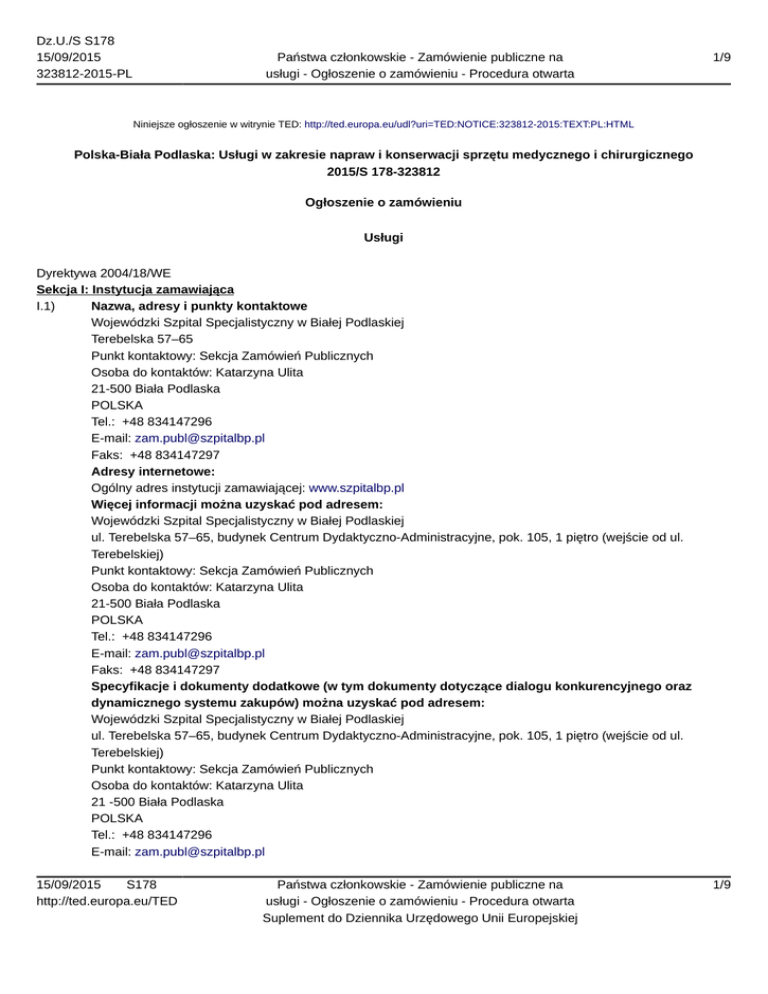 Dz.U./S S178 15/09/2015 323812-2015-PL Państwa członkowskie - Zamówienie publiczne na usługi - Ogłoszenie o zamówieniu - Procedura otwarta 1/9 Niniejsze ogłoszenie w witrynie TED: http://ted.europa.eu/udl?uri=TED:NOTICE:323812-2015:TEXT:PL:HTML Polska-Biała Podlaska: Usługi w zakresie napraw i konserwacji sprzętu medycznego i chirurgicznego 2015/S 178-323812 Ogłoszenie o zamówieniu Usługi Dyrektywa 2004/18/WE Sekcja I: Instytucja zamawiająca I.1) Nazwa, adresy i punkty kontaktowe Wojewódzki Szpital Specjalistyczny w Białej Podlaskiej Terebelska 57–65 Punkt kontaktowy: Sekcja Zamówień Publicznych Osoba do kontaktów: Katarzyna Ulita 21-500 Biała Podlaska POLSKA Tel.: +48 834147296 E-mail: [email protected] Faks: +48 834147297 Adresy internetowe: Ogólny adres instytucji zamawiającej: www.szpitalbp.pl Więcej informacji można uzyskać pod adresem: Wojewódzki Szpital Specjalistyczny w Białej Podlaskiej ul. Terebelska 57–65, budynek Centrum Dydaktyczno-Administracyjne, pok. 105, 1 piętro (wejście od ul. Terebelskiej) Punkt kontaktowy: Sekcja Zamówień Publicznych Osoba do kontaktów: Katarzyna Ulita 21-500 Biała Podlaska POLSKA Tel.: +48 834147296 E-mail: [email protected] Faks: +48 834147297 Specyfikacje i dokumenty dodatkowe (w tym dokumenty dotyczące dialogu konkurencyjnego oraz dynamicznego systemu zakupów) można uzyskać pod adresem: Wojewódzki Szpital Specjalistyczny w Białej Podlaskiej ul. Terebelska 57–65, budynek Centrum Dydaktyczno-Administracyjne, pok. 105, 1 piętro (wejście od ul. Terebelskiej) Punkt kontaktowy: Sekcja Zamówień Publicznych Osoba do kontaktów: Katarzyna Ulita 21 -500 Biała Podlaska POLSKA Tel.: +48 834147296 E-mail: [email protected] 15/09/2015 S178 http://ted.europa.eu/TED Państwa członkowskie - Zamówienie publiczne na usługi - Ogłoszenie o zamówieniu - Procedura otwarta Suplement do Dziennika Urzędowego Unii Europejskiej 1/9 Dz.U./S S178 15/09/2015 323812-2015-PL Państwa członkowskie - Zamówienie publiczne na usługi - Ogłoszenie o zamówieniu - Procedura otwarta 2/9 Faks: +48 834147297 Adres internetowy: www.szpitalbp.pl Oferty lub wnioski o dopuszczenie do udziału w postępowaniu należy przesyłać na adres: Wojewódzki Szpital Specjalistyczny w Białej Podlaskiej ul. Terebelska 57–65 Punkt kontaktowy: Punkt Informacyjny w budynku Centrum Dydaktyczno-Administracyjnego (wejście od ul. Terebelskiej, parter, hol główny) 21-500 Biała Podlaska POLSKA Tel.: +48 834147294 I.2) Rodzaj instytucji zamawiającej Inna: Samodzielny Publiczny Zakład Opieki Zdrowotnej I.3) Główny przedmiot lub przedmioty działalności Zdrowie I.4) Udzielenie zamówienia w imieniu innych instytucji zamawiających Instytucja zamawiająca dokonuje zakupu w imieniu innych instytucji zamawiających: nie Sekcja II: Przedmiot zamówienia II.1) Opis II.1.1) Nazwa nadana zamówieniu przez instytucję zamawiającą: Świadczenie usług serwisowych w zakresie napraw i przeglądów angiokardiografu do badań naczyniowych AXIOM Artis FC wraz ze stacją hemodynamiki AXIOM Sensis, sprawa znak: ZP.3521/6/15. II.1.2) Rodzaj zamówienia oraz lokalizacja robót budowlanych, miejsce realizacji dostawy lub świadczenia usług Usługi Kategoria usług: nr 1: Usługi konserwacyjne i naprawcze Główne miejsce lub lokalizacja robót budowlanych, miejsce realizacji dostawy lub świadczenia usług: Wojewódzki Szpital Specjalistyczny w Białej Podlaskiej, ul. Terebelska 57–65, 21-500 Biała Podlaska. Kod NUTS PL314 II.1.3) Informacje na temat zamówienia publicznego, umowy ramowej lub dynamicznego systemu zakupów (DSZ) Ogłoszenie dotyczy zamówienia publicznego II.1.4) Informacje na temat umowy ramowej II.1.5) Krótki opis zamówienia lub zakupu Przedmiotem zamówienia jest świadczenie przez Wykonawcę na rzecz Wojewódzkiego Szpitala Specjalistycznego w Białej Podlaskiej usług serwisowych w zakresie okresowych przeglądów technicznoeksploatacyjnych oraz napraw i modyfikacji angiokardiografu do badań naczyniowych AXIOM Artis FC wraz ze stacją badań hemodynamicznych AXIOM. II.1.6) Wspólny Słownik Zamówień (CPV) 50420000 II.1.7) Informacje na temat Porozumienia w sprawie zamówień rządowych (GPA) Zamówienie jest objęte Porozumieniem w sprawie zamówień rządowych (GPA): nie II.1.8) Części To zamówienie podzielone jest na części: nie 15/09/2015 S178 http://ted.europa.eu/TED Państwa członkowskie - Zamówienie publiczne na usługi - Ogłoszenie o zamówieniu - Procedura otwarta Suplement do Dziennika Urzędowego Unii Europejskiej 2/9 Dz.U./S S178 15/09/2015 323812-2015-PL Państwa członkowskie - Zamówienie publiczne na usługi - Ogłoszenie o zamówieniu - Procedura otwarta II.1.9) Informacje o ofertach wariantowych Dopuszcza się składanie ofert wariantowych: nie II.2) Wielkość lub zakres zamówienia II.2.1) Całkowita wielkość lub zakres: Szacunkowa wartość bez VAT: 645 300 PLN II.2.2) Informacje o opcjach Opcje: nie II.2.3) Informacje o wznowieniach Jest to zamówienie podlegające wznowieniu: nie II.3) Czas trwania zamówienia lub termin realizacji Okres w miesiącach: 36 (od udzielenia zamówienia) 3/9 Sekcja III: Informacje o charakterze prawnym, ekonomicznym, finansowym i technicznym III.1) Warunki dotyczące zamówienia III.1.1) Wymagane wadia i gwarancje: Wadium: 12 000 (dwanaście tysięcy) PLN. III.1.2) Główne warunki finansowe i uzgodnienia płatnicze i/lub odniesienie do odpowiednich przepisów je regulujących: 1. Termin zapłaty za zrealizowane usługi nastąpi w terminie 30 dni od dnia otrzymania przez zamawiającego prawidłowo wystawionej faktury. 2. Zryczałtowane miesięczne wynagrodzenie nie wzrośnie przez okres minimum 12 miesięcy od daty zawarcia umowy (z zastrzeżeniem zapisów zawartych w umowie – załącznik nr 1 do SIWZ). III.1.3) Forma prawna, jaką musi przyjąć grupa wykonawców, której zostanie udzielone zamówienie: III.1.4) Inne szczególne warunki III.2) Warunki udziału III.2.1)