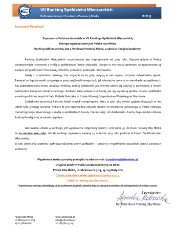 VII Ranking Spółdzielni Mleczarskich 2013 Dofinansowany z Funduszu Promocji Mleka Szanowni Państwo! Zapraszamy Państwa do udziału w VII Rankingu Spółdzielni Mleczarskich, którego organizatorem jest Polska Izba Mleka. Ranking dofinansowany jest z Funduszu Promocji Mleka, a udział w nim jest bezpłatny. Ranking Spółdzielni Mleczarskich organizowany jest nieprzerwanie od 2007 roku. Stanowi jedyne w Polsce przedsięwzięcie stworzone z myślą o spółdzielczej formie własności. Biorące w nim udział podmioty kategoryzowane są w pięciu perspektywach: finansowej, klientów, procesów, potencjału i dostawców. Każdy z uczestników rankingu, bez względu na to, jaką pozycję w nim zajmie, otrzyma indywidualny raport. Zawierać on będzie wyniki osiągnięte w poszczególnych kategoriach, jak również te zawarte w miernikach szczegółowych. Tak zaprezentowana ocena umożliwi wnikliwą analizę spółdzielni, jak również określi jej pozycję w porównaniu z innymi podmiotami biorącymi udział w rankingu. Zarówno dane podane w ankiecie, jak i jej wyniki są poufne. Analizy spółdzielni w rankingu dokona zespół dr hab. Michała Pietrzaka ze Szkoły Głównej Gospodarstwa Wiejskiego w Warszawie. Dodatkowo otrzymują Państwo krótki moduł marketingowy, który w tym roku wyłoni spośród biorących w niej udział tylko jednego laureata. Ankieta ta jest zapowiedzią naszych planów na stworzenie pierwszego w Polsce rankingu marketingowego stworzonego z myślą o spółdzielcach branży mleczarskiej i ich działaniach. Analizy tego modułu dokona Andrzej Kondej wraz ze swoim zespołem. Warunkiem udziału w rankingu jest wypełnienie załączonej ankiety i przesłanie jej do Biura Polskiej Izby Mleka do 20 czerwca 2013 roku. Wyniki rankingu ogłoszone zostaną 13 września 2013 roku podczas XI Forum Spółdzielczości Mleczarskiej. W celu dokonania rzetelnej i pełnowartościowej oceny spółdzielni – prosimy o wypełnienie wszystkich pozycji zawartych w ankiecie. Wypełnione ankiety prosimy przesyłać na adres e-mail: [email protected]. Oryginał prosimy wysłać pocztą tradycyjną na adres: Polska Izba Mleka, ul. Mickiewicza 7/23, 15-213 Białystok Termin nadsyłania ankiet upływa 20 czerwca 2013 r. Udział w rankingu jest bezpłatny. Organizatorzy rankingu zobowiązują się do zachowania poufności odnośnie danych zwartych w ankiecie i nie udostępniania ich osobom trzecim. Z poważaniem Dyrektor Biura Polskiej Izby Mleka Polska Izba Mleka ul. Mickiewicza 7/23 15-213 Białystok www.izbamleka.pl [email protected] tel. (85) 674 73 29