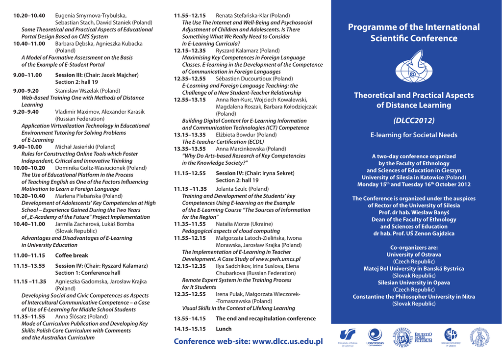10.20–10.40 Eugenia Smyrnova-Trybulska, Sebastian Stach, Dawid Staniek (Poland) Some Theoretical and Practical Aspects of Educational Portal Design Based on CMS System 10.40–11.00 Barbara Dębska, Agnieszka Kubacka (Poland) A Model of Formative Assessment on the Basis of the Example of E-Student Portal 9.00–11.00 Session III: (Chair: Jacek Majcher) Section 2: hall 19 9.00–9.20 Stanisław Wszelak (Poland) Web-Based Training One with Methods of Distance Learning 9.20–9.40 Vladimir Maximov, Alexander Karasik (Russian Federation) Application Virtualization Technology in Educational Environment Tutoring for Solving Problems of E-Learning 9.40–10.00 Michał Jasieński (Poland) Rules for Constructing Online Tools which Foster Independent, Critical and Innovative Thinking 10.00–10.20 Dominika Goltz-Wasiucionek (Poland) The Use of Educational Platform in the Process of Teaching English as One of the Factors Influencing Motivation to Learn a Foreign Language 10.20–10.40 Marlena Plebańska (Poland) Development of Adolescents’ Key Competencies at High School – Experience Gained During the Two Years of „E-Academy of the Future” Project Implementation 10.40–11.00 Jarmila Zacharová, Lukáš Bomba (Slovak Republic) Advantages and Disadvantages of E-Learning in University Education 11.00–11.15 11.15–13.55 Coffee break Session IV: (Chair: Ryszard Kalamarz) Section 1: Conference hall 11.15 –11.35 Agnieszka Gadomska, Jarosław Krajka (Poland) Developing Social and Civic Competences as Aspects of Intercultural Communicative Competence – a Case of Use of E-Learning for Middle School Students 11.35–11.55 Anna Ślósarz (Poland) Mode of Curriculum Publication and Developing Key Skills: Polish Core Curriculum with Comments and the Australian Curriculum 11.55–12.15 Renata Stefańska-Klar (Poland) The Use The Internet and Well-Being and Psychosocial Adjustment of Children and Adolescents. Is There Something What We Really Need to Consider In E-Learning Curricula? 12.15–12.35 Ryszard Kalamarz (Poland) Maximising Key Competences in Foreign Language Classes. E-learning in the Development of the Competence of Communication in Foreign Languages 12.35–12.55 Sébastien Ducourtioux (Poland) E-Learning and Foreign Language Teaching: the Challenge of a New Student-Teacher Relationship 12.55–13.15 Anna Ren-Kurc, Wojciech Kowalewski, Magdalena Roszak, Barbara Kołodziejczak (Poland) Building Digital Content for E-Learning Information and Communication Technologies (ICT) Competence 13.15–13.35 Elżbieta Bowdur (Poland) The E-teacher Certification (ECDL) 13.35–13.55 Anna Marcinkowska (Poland) “Why Do Arts-based Research of Key Competencies in the Knowledge Society?” Session IV: (Chair: Iryna Sekret) Section 2: hall 19 11.15 –11.35 Jolanta Szulc (Poland) Training and Development of the Students’ key Competences Using E-learning on the Example of the E-Learning Course “The Sources of Information for the Region” 11.35–11.55 Natalia Morze (Ukraine) Pedagogical aspects of cloud computing 11.55–12.15 Małgorzata Latoch-Zielińska, Iwona Morawska, Jarosław Krajka (Poland) The Implementation of E-Learning in Teacher Development. A Case Study of www.pwh.umcs.pl 12.15–12.35 Ilya Sadchikov, Irina Suslova, Elena Chubarkova (Russian Federation) Remote Expert System in the Training Process for It Students 12.35–12.55 Irena Pulak, Małgorzata Wieczorek-Tomaszewska (Poland) Visual Skills in the Context of Lifelong Learning Programme of the International Scientific Conference Theoretical and Practical Aspects of Distance Learning (DLCC2012) E-learning for Societal Needs A two-day conference organized by the Faculty of Ethnology and Sciences of Education in Cieszyn University of Silesia in Katowice (Poland) Monday 15th and Tuesday 16th October 2012 11.15–12.55 13.55–14.15 The end and recapitulation conference 14.15–15.15 Lunch Conference web-site: www.dlcc.us.edu.pl The Conference is organized under the auspices of Rector of the University of Silesia Prof. dr hab. Wiesław Banyś Dean of the Faculty of Ethnology and Sciences of Education dr hab. Prof. UŚ Zenon Gajdzica Co-organizers are: University of Ostrava (Czech Republic) Matej Bel University in Banská Bystrica (Slovak Republic) Silesian University in Opava (Czech Republic) Constantine the Philosopher University in Nitra (Slovak Republic) University of Silesia in Katowice Silesian University in Opava Programme of the Conference 14th October 2012 (Sunday) (Hotel “Academicus”, Cieszyn) International Programme Committee: Xabier Basogain – University of the Basque Country, Spain Filipe Carrera – Lisbon Technical University, Portugal Sixto Cubo – Extremadura University, Spain Franz Feiner – Catholic University College for Education, Graz, Austria Zenon Gajdzica – University of Silesia in Katowice, Poland Bogdan Galwas – Warsaw Technical University, Poland Miroslav Hrubý – University of Defence, Czech Republic Milena Janáková – Silesian University in Opava, Czech Republic Peter Jusko – Matej Bel University in Banská Bystrica, Slovak Republic Stanisław Juszczyk – University of Silesia in Katowice, Poland Jana Kapounová – University of Ostrava, Czech Republic Piet Kommers – University of Twente, Netherlands Kateřina Kostolányová – University of Ostrava, Czech Republic Stefan M. Kwiatkowski – Maria Grzegorzewska Academy of Special Education, Poland Štefan Ligas – Matej Bel University in Banská Bystrica, Slovak Republic Jan Łaszczyk – Maria Grzegorzewska Academy of Special Education, Poland Małgorzata Łuszczak – University of Silesia in Katowice, Poland Andrzej W. Mitas – The Silesian University of Technology in Katowice, Poland Norbert Pachler – London University, United Kingdom Paulo Pinto – Lusiada Uiversity, Portugal António dos Reis – The Graal Institute, Portugal David Richardson – Leaneus University, Sweden Halina Rusek – University of Silesia in Katowic