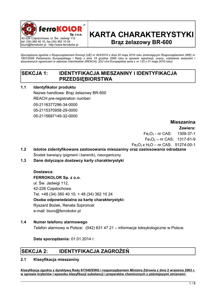 42-226 Częstochowa, ul. Św. Jadwigi 112 tel. (34) 360 40 10, fax (34) 362 10 24 [email protected] http://www.ferrokolor.pl KARTA CHARAKTERYSTYKI Brąz żelazowy BR-600 Sporządzona zgodnie z Rozporządzeniem Komisji (UE) nr 453/2010 z dnia 20 maja 2010 roku zmieniającym Rozporządzeniem (WE) nr 1907/2006 Parlamentu Europejskiego i Rady z dnia 18 grudnia 2006 roku w sprawie rejestracji, oceny, udzielania zezwoleń i stosowanych ograniczeń w zakresie chemikaliów (REACH), (DU Unii Europejskiej seria L nr 133 z 31 maja 2010 roku) SEKCJA 1: 1.1 IDENTYFIKACJA MIESZANINY I IDENTYFIKACJA PRZEDSIĘBIORSTWA Identyfikator produktu Nazwa handlowa: Brąz żelazowy BR-600 REACH pre-registration number: 05-2116377296-34-0000 05-2115370958-29-0000 05-2115687149-32-0000 Mieszanina 1.2 1.3 Zawiera: Fe2O3 - nr CAS: 1309-37-1 Fe3O4 – nr CAS: 1317-61-9 Fe2O3 x H2O – nr CAS: 51274-00-1 Istotne zidentyfikowane zastosowania mieszaniny oraz zastosowania odradzane Środek barwiący (pigment i barwnik), nieorganiczny. Dane dotyczące dostawcy karty charakterystyki Dostawca: FERROKOLOR Sp. z o.o. ul. Św. Jadwigi 112, 42-226 Częstochowa Tel. +48 (34) 360 40 10, + 48 (34) 362 10 24 Osoba odpowiedzialna za kartę charakterystyki: Ryszard Bożek, Renata Szproncel e-mail: [email protected] 1.4 Numer telefonu alarmowego Telefon alarmowy w Polsce: (042) 631 47 21 – informacje toksykologiczne w Polsce. Data sporządzenia: 01.01.2014 r. SEKCJA 2: 2.1 IDENTYFIKACJA ZAGROŻEŃ Klasyfikacja mieszaniny Klasyfikacja zgodna z dyrektywą Rady 67/548/EWG i rozporządzeniem Ministra Zdrowia z dnia 2 września 2003 r. w sprawie kryteriów i sposobu klasyfikacji substancji i preparatów chemicznych z późniejszymi zmianami: 1/8 KARTA CHARAKTERYSTYKI - Brąz żelazowy BR-600 Produkt nie został zaklasyfikowany jako niebezpieczny. Podczas przestrzegania ogólnych zasad bezpieczeństwa i higieny pracy produkt nie stwarza zagrożenia dla zdrowia lub życia człowieka. 2.2 Elementy oznakowania Etykieta zawierająca nazwę: jak w pkt 1.1 Symbol – nie jest wymagany Zwroty wykazujące rodzaj zagrożenia – nie są wymagane Zwroty określające warunki bezpiecznego stosowania – nie są wymagane Mimo braku konieczności stosowania szczególnych warunków bezpieczeństwa zaleca się: •Chronić przed dziećmi •Przechowywać pojemnik w suchym pomieszczeniu •Nie wdychać pyłu •Nosić odpowiednią odzież ochronną i rękawice ochronne 2.3 Inne zagrożenia Mieszanina nie spełnia kryteriów PBT i vPvB SEKCJA 3: SKŁAD / INFORMACJA O SKŁADNIKACH Identyfikator produktu: Mieszanina Nazwa substancji CAS nr WE nr Symbol Zwroty R Fe2O3 1309-37-1 215-168-2 ---------------- --------------- Fe3O4 1317-61-9 215-277-5 ---------------- --------------- Fe2O3 x H2O 51274-00-1 257-098-5 ---------------- --------------- Zgodnie z wiedzą dostawcy / producenta, produkt nie zawiera żadnych niebezpiecznych składników w ilościach, które wymagałyby wymienienia, zgodnie z prawem Unii Europejskiej oraz regulacjami krajowymi. SEKCJA 4: 4.1 ŚRODKI PIERWSZEJ POMOCY Opis środków pierwszej pomocy Kontakt z oczami: Kontakt ze skórą: FERROKOLOR Sp. z o.o. Płukać dużą ilością czystej wody przez co najmniej 15 minut przy odwiniętych powiekach. Usunąć szkła kontaktowe. Jeżeli podrażnienie nie ustępuje, należy skontaktować się z lekarzem – okulistą. Nie podrażnia skóry, w przypadku zanieczyszczenia skóry zdjąć zanieczyszczone ubranie i zmyć skórę dużą ilością wody z dodatkiem środków myjących. 2/8 KARTA CHARAKTERYSTYKI - Brąz żelazowy BR-600 Wdychanie pyłów: Przewód pokarmowy: SEKCJA 5: Możliwe podrażnienie błon śluzowych, katar, kichanie. Wyprowadzić poszkodowanego z miejsca kontaktu z pyłami. Jeżeli podrażnienie nie ustępuję wezwać lekarza. Jeżeli nastąpi połknięcie podać poszkodowanemu dużą ilość wody tylko w przypadku gdy jest przytomny. W razie potrzeby wezwać lekarza. POSTĘPOWANIE W PRZYPADKU POŻARU 5.1 Środki gaśnicze Stosować gaśnice odpowiednie dla palących się w otoczeniu materiałów. 5.2 Szczególne zagrożenia związane z mieszaniną Produkt nie powinien być przechowywany w pobliżu źródeł ciepła ponieważ w temperaturze powyżej 80 st. C może stać się niestabilny i ulegać utlenianiu. SEKCJA 6: POSTĘPOWANIE W PRZYPADKU NIEZAMIERZONEGO UWOLNIENIA DO ŚRODOWISKA 6.1 Indywidualne środki ostrożności, wyposażenie ochronne i procedury w sytuacjach awaryjnych. Mieszanina niepalna, niewybuchowa, nietoksyczna, stabilna, nie wymaga szczególnych środków ostrożności. 6.2 Środki ostrożności w zakresie ochrony środowiska Zabezpieczyć przed przedostaniem się do kanalizacji, cieków i zbiorników wodnych. 6.3 Metody i materiały zapobiegające rozprzestrzenianiu się skażenia i służące do usuwania skażenia W warunkach przemysłowych zapewnić odpowiednią wentylację. Rozsypany produkt zebrać ostrożnie do pojemnika unikając pylenia i przekazać do powtórnego wykorzystania lub utylizować w przedsiębiorstwie utylizacji odpadów. 6.4 Odniesienia do innych sekcji Usuwać zgodnie z zaleceniami przedstawionymi w sekcji 13. SEKCJA 7: 7.1 POSTĘPOWANIE Z SUBSTANCJAMI I MIESZANINAMI ORAZ ICH MAGAZYNOWANIE Środki ostrożności dotyczące bezpiecznego postępowania 7.1.1 Stosować odzież i sprzęt ochronny (maski, rękawice, okulary). Stosować mieszaninę zgodnie z przeznaczeniem tylko przez przeszkolony i odpowiednio wyposażony w środki ochrony osobistej personel 7.1.2 Nie jeść, nie pić i nie palić w czasie użytkowania. Myć ręce podczas przerw i po zakończeniu pracy. Zdjąć zanieczyszczone ubranie. 7.2 Warunki bezpiecznego magazynowania, łącznie z informacjami dotyczącymi FERROKOLOR Sp. z o.o. 3/8 KARTA CHARAKTERYSTYKI - Brąz żelazowy BR-600 wszelkich wzajemnych niezgodności Przechowywać w szczelnie zamkniętych opakowaniach w suchych, przewiewnych pomieszczeniach. Chronić produkt przed zawilgoceniem. 7.3 Środek barwiący (pigment 