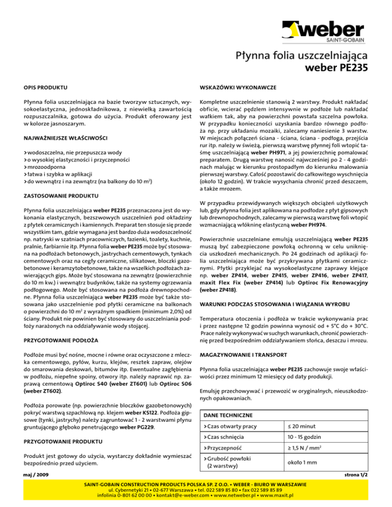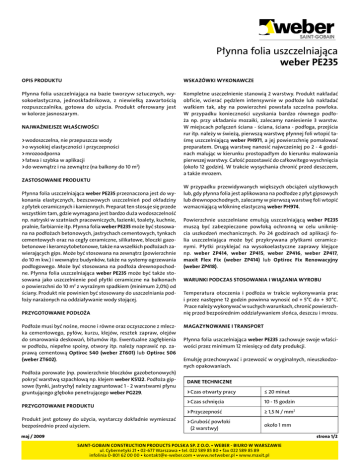 Płynna folia uszczelniająca weber PE235 Opis produktu WSKAZÓWKI WYKONAWCZE Płynna folia uszczelniająca na bazie tworzyw sztucznych, wysokoelastyczna, jednoskładnikowa, z niewielką zawartością rozpuszczalnika, gotowa do użycia. Produkt oferowany jest w kolorze jasnoszarym. Kompletne uszczelnienie stanowią 2 warstwy. Produkt nakładać obficie, wcierać pędzlem intensywnie w podłoże lub nakładać wałkiem tak, aby na powierzchni powstała szczelna powłoka. W przypadku konieczności uzyskania bardzo równego podłoża np. przy układaniu mozaiki, zalecamy naniesienie 3 warstw. W miejscach połączeń ściana - ściana, ściana - podłoga, przejścia rur itp. należy w świeżą, pierwszą warstwę płynnej foli wtopić taśmę uszczelniającą weber PH971, a jej powierzchnię pomalować preparatem. Drugą warstwę nanosić najwcześniej po 2 - 4 godzinach malując w kierunku prostopadłym do kierunku malowania pierwszej warstwy. Całość pozostawić do całkowitego wyschnięcia (około 12 godzin). W trakcie wysychania chronić przed deszczem, a także mrozem. Najważniejsze właściwości >wodoszczelna, > nie przepuszcza wody >o > wysokiej elastyczności i przyczepności >mrozoodporna > >łatwa > i szybka w aplikacji >do > wewnątrz i na zewnątrz (na balkony do 10 m2) Zastosowanie PRODUKTU Płynna folia uszczelniająca weber PE235 przeznaczona jest do wykonania elastycznych, bezszwowych uszczelnień pod okładziny z płytek ceramicznych i kamiennych. Preparat ten stosuje się przede wszystkim tam, gdzie wymagana jest bardzo duża wodoszczelność np. natryski w szatniach pracowniczych, łazienki, toalety, kuchnie, pralnie, farbiarnie itp. Płynna folia weber PE235 może być stosowana na podłożach betonowych, jastrychach cementowych, tynkach cementowych oraz na cegły ceramiczne, silikatowe, bloczki gazobetonowe i keramzytobetonowe, także na wszelkich podłożach zawierających gips. Może być stosowana na zewnątrz (powierzchnie do 10 m kw.) i wewnątrz budynków, także na systemy ogrzewania podłogowego. Może być stosowana na podłoża drewnopochodne. Płynna folia uszczelniająca weber PE235 może być także stosowana jako uszczelnienie pod płytki ceramiczne na balkonach o powierzchni do 10 m2 z wyraźnym spadkiem (minimum 2,0%) od ściany. Produkt nie powinien być stosowany do uszczelniania podłoży narażonych na oddziaływanie wody stojącej. PRZYGOTOWANIE PODŁOŻA Podłoże musi być nośne, mocne i równe oraz oczyszczone z mleczka cementowego, pyłów, kurzu, klejów, resztek zapraw, olejów do smarowania deskowań, bitumów itp. Ewentualne zagłębienia w podłożu, niepełne spoiny, otwory itp. należy naprawić np. zaprawą cementową Optiroc S40 (weber ZT601) lub Optiroc S06 (weber ZT602). Podłoża porowate (np. powierzchnie bloczków gazobetonowych) pokryć warstwą szpachlową np. klejem weber KS122. Podłoża gipsowe (tynki, jastrychy) należy zagruntować 1 - 2 warstwami płynu gruntującego głęboko penetrującego weber PG229. PRZYGOTOWANIE PRODUKTU Produkt jest gotowy do użycia, wystarczy dokładnie wymieszać bezpośrednio przed użyciem. W przypadku przewidywanych większych obciążeń użytkowych lub, gdy płynna folia jest aplikowana na podłodze z płyt gipsowych lub drewnopochodnych, zalecamy w pierwszą warstwę foli wtopić wzmacniającą włókninę elastyczną weber PH974. Powierzchnie uszczelniane emulsją uszczelniającą weber PE235 muszą być zabezpieczone powłoką ochronną w celu uniknięcia uszkodzeń mechanicznych. Po 24 godzinach od aplikacji folia uszczelniająca może być przykrywana płytkami ceramicznymi. Płytki przyklejać na wysokoelastyczne zaprawy klejące np. weber ZP414, weber ZP415, weber ZP416, weber ZP417, maxit Flex Fix (weber ZP414) lub Optiroc Fix Renowacyjny (weber ZP418). WARUNKI PODCZAS STOSOWANIA I WIĄZANIA WYROBU Temperatura otoczenia i podłoża w trakcie wykonywania prac i przez następne 12 godzin powinna wynosić od + 5°C do + 30°C. Prace należy wykonywać w suchych warunkach, chronić powierzchnię przed bezpośrednim oddziaływaniem słońca, deszczu i mrozu. MAGAZYNOWANIE I TRANSPORT Płynna folia uszczelniająca weber PE235 zachowuje swoje właściwości przez minimum 12 miesięcy od daty produkcji. Emulsję przechowywać i przewozić w oryginalnych, nieuszkodzonych opakowaniach. DANE TECHNICZNE >Czas > otwarty pracy ≤ 20 minut >Czas > schnięcia 10 - 15 godzin >Przyczepność > ≥ 1,5 N / mm2 >Grubość > powłoki (2 warstwy) około 1 mm maj / 2009 strona 1/2 Saint-Gobain Construction Products Polska Sp. z o.o. • Weber - Biuro w Warszawie ul. Cybernetyki 21 • 02-677 Warszawa • tel. 022 589 85 80 • fax 022 589 85 89 infolinia 0-801 62 00 00 • [email protected] • www.netweber.pl • www.maxit.pl Płynna folia uszczelniająca weber PE235 ŚRODKI BEZPIECZEŃSTWA >Rozciągliwość, > po wyschnięciu około 310% >Orientacyjne > zużycie około 1,2 kg / m2 / 2 warstwy (~1 mm związanej powłoki) >Temperatura > stosowania od + 5oC do + 30oC >Ruch > pieszy po około 10 godzinach >Termin > przydatności do użycia 12 miesięcy od daty produkcji Wyrób jest substancją nietoksyczną i w normalnych warunkach użytkowania nie stwarza zagrożenia. Należy chronić oczy i skórę. W przypadku zanieczyszczenia: oczy natychmiast przemyć dużą ilością czystej wody i zasięgnąć porady lekarza, skórę umyć mydłem i wodą. Przechowywać poza zasięgiem dzieci. UWAGA OPAKOWANIE >pojemnik > 4 kg, 8 kg, 24 kg Niniejsza karta techniczna określa ogólny zakres stosowania wyrobu, ale nie może zastąpić zawodowego przygotowania wykonawcy. Prace należy wykonać zgodnie ze sztuką budowlaną i zasadami BHP. Producent gwarantuje jakość wyrobu, ale nie ma wpływu na warunki i sposób jego użycia. W przypadku wątpliwości należy wykonać własne próby lub skontaktować się z Doradcami Technicznymi Weber. Wraz z ukazaniem się tej karty technicznej, tracą ważność karty wcześni