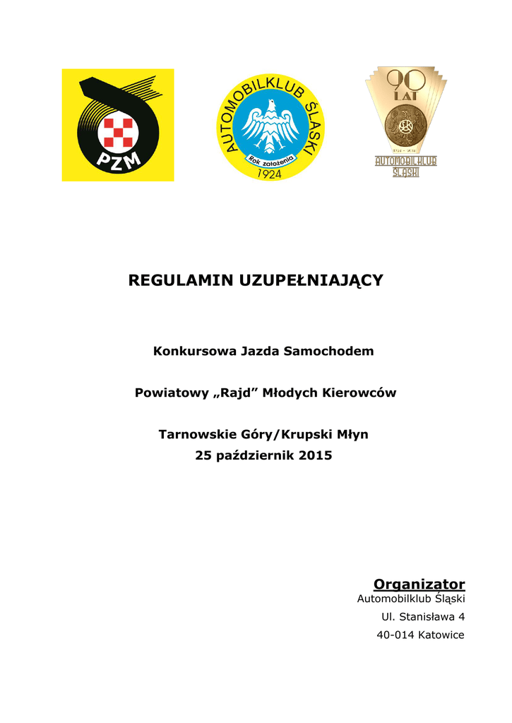 REGULAMIN UZUPEŁNIAJĄCY Konkursowa Jazda Samochodem Powiatowy „Rajd” Młodych Kierowców Tarnowskie Góry/Krupski Młyn 25 październik 2015 Organizator Automobilklub Śląski Ul. Stanisława 4 40-014 Katowice SPIS TREŚCI 1. USTALENIA OGÓLNE 3 2. ORGANIZACJA 3 3. PROGRAM 4 4. ZGŁOSZENIA 5 5. UBEZPIECZENIE 6 6. NUMERY IDENTYFIKACYJNE 7 7. REKLAMA 7 8. ODBIÓR ADMINISTRACYJNY 7 9. ZAPOZNANIE Z TRASĄ 8 10. BADANIA KONTROLNE 8 11. BADANIA KOŃCOWE 9 12. OPONY 9 13. ODPRAWA UCZESTNIKÓW 9 14. PRZEBIEG IMPREZY 9 15. PROCEDURA STARTU 10 16. POMIAR CZASU 10 17. META 10 18. BEZPIECZEŃSTWO 10 19. IDENTYFIKACJA OSÓB OFICJALNYCH 10 20. NAGRODY 11 21. PROTESTY 11 22. KARY 11 23. POSTANOWIENIA KOŃCOWE 11 Strona 2 z 10 USTALENIA OGÓLNE Konkursowa Jazda Samochodem zostanie przeprowadzona zgodnie z postanowieniami: Międzynarodowego Kodeksu Sportowego, Regulaminu sportowego Rajdów Regionalnych FIA wraz z załącznikami, Regulaminu Konkursowej Jazdy Samochodem na rok 2015, Regulaminu Ochrony Środowiska PZM, Ustawy „Prawo o Ruchu Drogowym RP” niniejszego regulaminu uzupełniającego. Modyfikacje, zmiany i/lub uzupełnienia do niniejszego Regulaminu Uzupełniającego będą publikowane wyłącznie w numerowanych i datowanych komunikatach ogłaszanych przez organizatora lub ZSS. Otwarcie listy zgłoszeń 01.10.2015 Zamknięcie listy zgłoszeń 22.10.2015 Odbiór administracyjny 25.10.2015 godz. 7:30-8:30 Badanie kontrolne BK1 25.10.2015 godz. 7:45-9:30 Zapoznanie z trasą 25.10.2015 godz. 8:00-10:00 Pierwsze posiedzenie ZSS 25.10.2015 godz. 9:45 Publikacja listy załóg dopuszczonych do startu 25.10.2015 godz. 10:15 Odprawa uczestników 25.10.2015 godz. 10:45 Start 25.10.2015 godz. 11:00 Meta 25.10.2015 godz. 15:59 Badanie kontrolne BK2 25.10.2015 godz. 15:59 Opublikowanie końcowej klasyfikacji prowizorycznej 25.10.2015 godz. 17:30 Rozdanie nagród 25.10.2015 godz. 18:00 1. USTALENIA OGÓLNE 1.1 Miejsce i termin imprezy Impreza odbędzie się w dniu 25.10.2015r na terenie Tarnowskich Gór i Krupskiego Młyna. 1.2 Nazwa i ranga imprezy Konkursowa Jazda Samochodem: Powiatowy „Rajd” Młodych Kierowców. 1.3 Numer wizy ZO PZM Numer wizy 15/KJS/2015 wydana przez OKSS w Katowicach w dniu 11.06. i 23.09.2015r. 1.4 Lokalizacja Biura Biuro znajdować się będzie do dnia 23.10.2015r pod adresem Automobilklub Śląski w Katowicach, ulica Stanisława 4 w godzinach 8:00 – 16:00. W dniu imprezy pod adresem Klub 22, Tarnowskie Góry, ul. Czarnohucka 22 w godzinach 7:30 – 18:00. 1.5 Lokalizacja startu, mety i parku zamkniętego Start – Tarnowskie Góry, Parking przy Starostwie Powiatowym, ul. Karłuszowiec 5 Meta - Tarnowskie Góry, Parking przy Starostwie Powiatowym, ul. Karłuszowiec 5 Park zamknięty – nie dotyczy Strona 3 z 10 1.6 Charakterystyka Impreza zostanie przeprowadzona w ciągu jednego dnia i składa z 3 sekcji. Na trasie zlokalizowane będzie 8 prób poprzedzonych PKC. Nawierzchnia trasy i prób : asfalt, szuter Długość trasy: 73,10km (w tym 8,55km prób) Trasa imprezy jest obowiązkowa i została opisana w książce drogowej. 1.7 Ukończenie KJS-u daje 1/6 części uprawnień do uzyskania licencji sportu samochodowego stopnia RN. 2. ORGANIZACJA 2.1 Nazwa organizatora Automobilklub Śląski 2.2 Adres Ul. Stanisława 4 40 – 014 Katowice tel. (32) 254-88-74, 725-039-065 strona: www.auto-slaski.katowice.pl e-mail: [email protected] 2.3. Władze KJS 2.3.1. Zespół Sędziów Sportowych Przewodniczący Bożena Cholewa Członek Grzegorz Szewczyk Członek Krystyna Bywalec 2.3.2. Osoby oficjalne Dyrektor Imprezy Andrzej Szkuta Asystent ds. sportowych Robert Szkuta Asystent ds. Organizacyjnych Jolanta Michałek Kierownik Biura Marcjanna Grenda Kierownik Komisji Obliczeń Kornelia Szkuta Kierownik Badań Kontrolnych Bartłomiej Urbański 3. ZGŁOSZENIA 3.1 Załoga 3.1.1. Załogę stanowią wyłącznie dwie osoby, określani jako kierowca i pilot. Kierowca musi mieć prawo jazdy, a pilot ukończone 17 lat. 3.1.2. Kierowca nie może posiadać jakiejkolwiek licencji kierowcy sportu samochodowego w rozumieniu przepisów Polskiego Związku Motorowego, za wyjątkiem zawodników posiadających licencję, wymienionych w punkcie 1.1 Regulaminu Ramowego KJS. Strona 4 z 10 3.1.3.Pilot nie może prowadzić samochodu podczas imprezy. W przypadku stwierdzenia prowadzenia samochodu przez pilota, załoga zostanie wykluczona. 3.2 Obowiązki załogi Do obowiązków załogi należy: 3.2.1. Obecność na odprawie uczestników 3.2.2. Przejazd trasy imprezy z pobraniem wiz na wszystkich PKC w podanej przez organizatora kolejności i kierunku zgodnym z książką drogową. 3.2.3. Odbycie wszystkich prób w zapiętych pasach bezpieczeństwa, zapiętych kaskach ochronnych, z włączonymi światłami mijania i zamkniętymi szybami. Nieprzestrzeganie powyższych przepisów pociągnie za sobą karę do wykluczenia włącznie. 3.3 Procedura zgłoszeń 3.3.1. Uczestnik zamierzający wziąć udział w KJS – Powiatowy „Rajd” Młodych Kierowców musi przesłać do dnia 22.10.2015r do godz. 24:00 wypełnione zgłoszenie na adres: e-mail: [email protected] 3.3.2. Jeżeli zgłoszenie wysłane jest pocztą e-mail, oryginał musi dotrzeć do organizatora najpóźniej w dniu odbioru administracyjnego. Oryginał zgłoszenia musi być czytelny i podpisany przez obydwu członków załogi. 3.3.3. Zgłoszenie zostanie przyjęte tylko w przypadku, gdy towarzyszyć mu będzie pokwitowanie wpłaty pełnej kwoty wpisowego lub potwierdzenie wystawione przez klub uczestnika. 3.3.4 Przez fakt podpisania zgłoszenia załoga przyjmuje do wiadomości, że startuje w imprezie na własną odpowiedzialność i zrzeka się wszelkich praw do odszkodowań za straty wynikłe podczas imprezy. Zrzeczenie to dotyczy FIA, PZM, Organizatora, osób oficjalnych występujących w imprezie i innych uczestników. 3.3.5 Organizator ma prawo nie przyjęcia zgłoszenia w szczególnych przypadkach: nieetyczne zachowanie lub niewypełnienie czytelnie