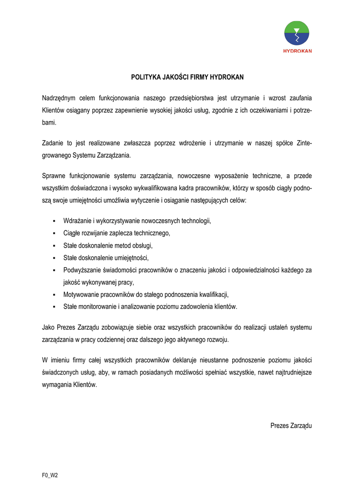POLITYKA JAKOŚCI FIRMY HYDROKAN Nadrzędnym celem funkcjonowania naszego przedsiębiorstwa jest utrzymanie i wzrost zaufania Klientów osiągany poprzez zapewnienie wysokiej jakości usług, zgodnie z ich oczekiwaniami i potrzebami. Zadanie to jest realizowane zwłaszcza poprzez wdrożenie i utrzymanie w naszej spółce Zintegrowanego Systemu Zarządzania. Sprawne funkcjonowanie systemu zarządzania, nowoczesne wyposażenie techniczne, a przede wszystkim doświadczona i wysoko wykwalifikowana kadra pracowników, którzy w sposób ciągły podnoszą swoje umiejętności umożliwia wytyczenie i osiąganie następujących celów: Wdrażanie i wykorzystywanie nowoczesnych technologii, Ciągłe rozwijanie zaplecza technicznego, Stałe doskonalenie metod obsługi, Stałe doskonalenie umiejętności, Podwyższanie świadomości pracowników o znaczeniu jakości i odpowiedzialności każdego za jakość wykonywanej pracy, Motywowanie pracowników do stałego podnoszenia kwalifikacji, Stałe monitorowanie i analizowanie poziomu zadowolenia klientów. Jako Prezes Zarządu zobowiązuje siebie oraz wszystkich pracowników do realizacji ustaleń systemu zarządzania w pracy codziennej oraz dalszego jego aktywnego rozwoju. W imieniu firmy całej wszystkich pracowników deklaruje nieustanne podnoszenie poziomu jakości świadczonych usług, aby, w ramach posiadanych możliwości spełniać wszystkie, nawet najtrudniejsze wymagania Klientów. Prezes Zarządu F0_W2