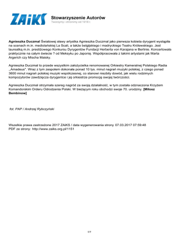 Agnieszka Duczmal Światowej sławy artystka Agnieszka Duczmal jako pierwsza kobieta dyrygent wystąpiła na scenach m.in. mediolańskiej La Scali, a także belgijskiego i madryckiego Teatru Królewskiego. Jest laureatką m.in. prestiżowego Konkursu Dyrygentów Fundacji Herberta von Karajana w Berlinie. Koncertowała praktycznie na całym świecie ? od Meksyku po Japonię. Współpracowała z takimi artystami jak Marta Argerich czy Mischa Maisky. Agnieszka Duczmal to przede wszystkim założycielka renomowanej Orkiestry Kameralnej Polskiego Radia ,,Amadeus''. Wraz z tym zespołem dokonała ponad 10 tys. minut nagrań muzyki polskiej, z czego ponad 3600 minut nagrań polskiej muzyki współczesnej, co stanowi niezbity dowód, jak wielu rodzimych kompozytorów zawdzięcza dyrygentce i jej orkiestrze promocję swojej twórczości. Agnieszka Duczmal otrzymała szereg nagród za swoją działalność, w tym została odznaczona Krzyżem Komandorskim Orderu Odrodzenia Polski. W bieżącym roku obchodzi swoje 70. urodziny. [Miłosz Bembinow] fot. PAP / Andrzej Rybczyński Wszelkie prawa zastrzeżone 2017 ZAiKS / data wygenerowania strony 07.03.2017 07:59:48 PDF ze strony: http://www.zaiks.org.pl/1151 1/1