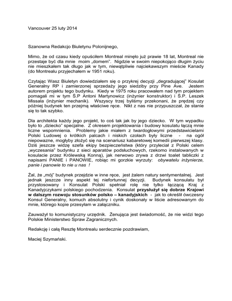 Vancouver 25 luty 2014 Szanowna Redakcjo Biuletynu Polonijnego, Mimo, że od czasu kiedy opuściłem Montreal minęło już prawie 18 lat, Montreal nie przestaje być dla mnie moim „domem”. Nigdzie w swoim niepokojąco długim życiu nie mieszkałem tak długo jak w tym, niewątpliwie najciekawszym mieście Kanady (do Montrealu przyjechałem w 1951 roku). Czytając Wasz Biuletyn dowiedziałem się o przykrej decyzji „degradującej” Kosulat Generalny RP i zamierzonej sprzedaży jego siedziby przy Pine Ave. Jestem autorem projektu tego budynku. Kiedy w 1975 roku pracowałem nad tym projektem pomagali mi w tym Ś.P Antoni Martynowicz (inżynier konstruktor) i Ś.P. Leszek Missala (inżynier mechanik). Wszyscy trzej byliśmy przekonani, że prędzej czy później budynek ten przejmą właściwe ręce. Nikt z nas nie przypuszczał, że stanie się to tak szybko. Dla architekta każdy jego projekt, to coś tak jak by jego dziecko. W tym wypadku było to „dziecko” specjalne. Z okresem projektowania i budowy kosulatu łączą mnie liczne wspomnienia. Problemy jakie miałem z twardogłowymi przedstawicielami Polski Ludowej o krótkich palcach i niskich czołach były liczne - na ogół niepowazne, mogłyby złożyć się na scenariusz kabaretowej komedii pierwszej klasy. Dziś jeszcze widzę szefa ekipy bezpieczeństwa (który przyleciał z Polski celem „wyczesania” budynku z sieci aparatów podsłuchowych, rzekomo instalowanych w kosulacie przez Królewską Konną), jak nerwowo zrywa z drzwi toalet tabliczki z napisami PANIE i PANOWIE, robiąc mi gorzkie wyrzuty: obywatelu inżynierze, panie i panowie to nie u nas ! Żal, że „mój” budynek przejdzie w inne ręce, jest żalem natury sentymentalnej. Jest jednak jeszcze inny aspekt tej niefortunnej decyzji. Budynek konsulatu był przystosowany i Konsulat Polski spełniał rolę nie tylko łączącą Kraj z Kanadyjczykami polskiego pochodzenia. Konsulat przysłużył się dobrze Krajowi w dalszym rozwoju stosunków polsko – kanadyjskich - jak to określił ówczesny Konsul Generalny, komuch absolutny i cynik doskonały w liście adresowanym do mnie, którego kopie przesyłam w załączniku. Zauważył to komunistyczny urzędnik. Żenująca jest świadomość, że nie widzi tego Polskie Ministerstwo Spraw Zagranicznych. Redakcję i całą Resztę Montrealu serdecznie pozdrawiam, Maciej Szymański. Wspomnienia Pana Szymańskiego można znaleźć pod adresem http://szymanski.biulpol.net