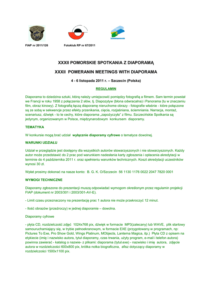 FIAP nr 2011/126 Fotoklub RP nr 67/2011 XXXII POMORSKIE SPOTKANIA Z DIAPORAMĄ XXXII POMERANIN MEETINGS WITH DIAPORAMA 4 - 6 listopada 2011 r. – Szczecin (Polska) REGULAMIN Diaporama to dziedzina sztuki, którą należy umiejscowić pomiędzy fotografią a filmem. Sam termin powstał we Francji w roku 1958 z połączenia 2 słów, tj. Diapozytyw (błona odwracalna) i Panorama (tu w znaczeniu film, obraz kinowy). Z fotografią łączą diaporamę nieruchome obrazy - fotografie właśnie - które połączone są ze sobą w sekwencje przez efekty przenikania, cięcia, rozjaśniana, ściemniania. Narracja, montaż, scenariusz, dźwięk - to te cechy, które diaporama „zapożyczyła” z filmu. Szczecińskie Spotkania są jedynym, organizowanym w Polsce, międzynarodowym konkursem diaporamy. TEMATYKA W konkursie mogą brać udział wyłącznie diaporamy cyfrowe o tematyce dowolnej. WARUNKI UDZIAŁU Udział w przeglądzie jest dostępny dla wszystkich autorów stowarzyszonych i nie stowarzyszonych. Każdy autor może przedstawić do 2 prac pod warunkiem nadesłania karty zgłoszenia i opłacenia akredytacji w terminie do 4 października 2011 r. oraz spełnieniu warunków technicznych. Koszt akredytacji uczestników wynosi 30 zł. Wpłat prosimy dokonać na nasze konto: B. G. K. O/Szczecin 56 1130 1176 0022 2047 7820 0001 WYMOGI TECHNICZNE Diaporamy zgłoszone do prezentacji muszą odpowiadać wymogom określonym przez regulamin projekcji FIAP (dokument nr 2003/301 i 2003/301-AV-E). - Limit czasu przeznaczony na prezentację prac 1 autora nie może przekroczyć 12 minut. - Ilość obrazów (przeźroczy) w jednej diaporamie – dowolna. Diaporamy cyfrowe - płyta CD, rozdzielczość zdjęć 1024x768 pix, dźwięk w formacie MP3(zalecany) lub WAVE, plik startowy samouruchamiający się, w trybie pełnoekranowym, w formacie EXE (przygotowany.w programach, np: Pictures To Exe, Pro Show Gold, Wings Platinum, MObjects, Lanterna Magica, itp.) Płyta CD z opisem na etykiecie (imię i nazwisko autora, tytuł diaporamy, czas trwania, użyty program, e-mail i telefon autora) powinna zawierać - katalog o nazwie- z plikami: diaporama (tytuł.exe) - nazwisko i imię autora, zdjęcie autora w rozdzielczości 600x800 pix, krótka notka biograficzna, afisz dotyczący diaporamy w rozdzielczości 1500x1100 pix. NAGRODY - medale FIAP (złoty, srebrny, brązowy) - medale Fotoklubu RP (złoty, srebrny i brązowy) - medale Fotoklubu „Zamek” - wyróżnienia honorowe FIAP - nagrody i wyróżnienia specjalne - uczestnicy konkursu otrzymają katalog oraz dyplom uczestnictwa. JURY I OCENA Oceny prac i podziału nagród dokona powołane przez organizatora Jury złożone z przedstawicieli związków twórczych, stowarzyszeń fotograficznych i doświadczonych autorów w składzie: Mieczysław Cybulski (AFIAP, AFRP, hon.zdfp) – Warszawa, Małgorzata Dołowska (AFRP) – Warszawa, Jerzy Wygoda (AFRP, hon.zdfp, IFK) – Rzeszów, Timm Stűtz (EFIAP, AFIAP) - Drezno, Niemcy,…………………………….. Juror rezerwowy: Leszek Kurpiewski (AFRP, hon.zdfp, IFK, hon. STF) – Szczecin. Jury oceniając walory twórcze poszczególnych diaporam, weźmie pod uwagę zaprezentowane podczas projekcji walory techniczne i estetyczne warstw obrazowej i dźwiękowej (montaż i realizacja).Jury ma prawo do dokonania innego podziału nagród. Werdykt jury jest ostateczny i nie podlega odwołaniu. Komisarz może wyłączyć spod obrad Jury prace nie spełniające warunków technicznych określonych regulaminem. INFORMACJE DODATKOWE Organizatorzy zapewniają sprzęt projekcyjny i nagłaśniający: - komputer PC (system Windows XP) i projektor multimedialny, - nagłośnienie (wzmacniacz stereo). TERMINY I MIEJSCE IMPREZY Zgłoszenia, opłaty, nadsyłanie prac Sesja preselekcyjna, plener Projekcje konkursowe i specjalne Obrady jury Pokaz galowy Wysyłka katalogu i nagród: Miejsce przeglądu 4.10.2011. 4.11.2011. 5.11.2011. 5.11.2011. 6.11.2011. 31.12.2011. Kino „ZAMEK”, Sala Anny Jagiellonki Sekretariat imprezy wejście A, pok.110 DANE ADRESOWE ORGANIZATORA Zamek Książąt Pomorskich w Szczecinie, 70-540 Szczecin, ul. Korsarzy 34, tel. 091/433 49 71, www.fotoklub.zamek.szczecin.pl, e-mail: [email protected], [email protected], fax 091/ 434 79 84 Komisarz Konkursu – Leszek Kurpiewski (AFRP, hon.zdfp, hon. STF), tel. 501 148 252