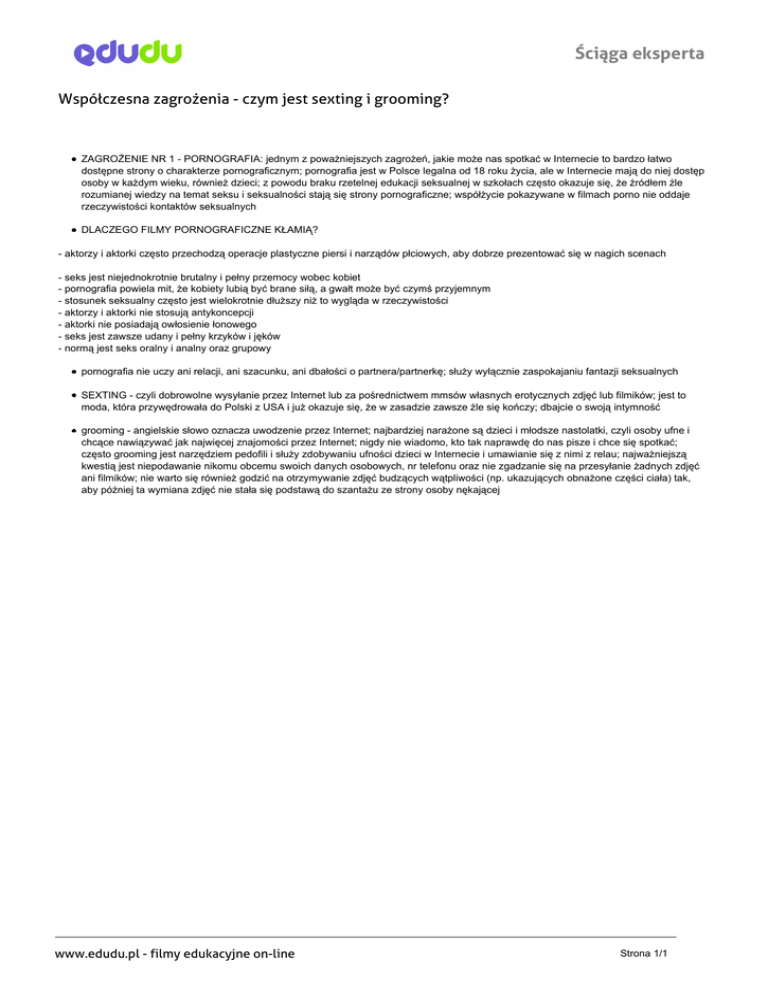 Ściąga eksperta Współczesna zagrożenia - czym jest sexting i grooming? ZAGROŻENIE NR 1 - PORNOGRAFIA: jednym z poważniejszych zagrożeń, jakie może nas spotkać w Internecie to bardzo łatwo dostępne strony o charakterze pornograficznym; pornografia jest w Polsce legalna od 18 roku życia, ale w Internecie mają do niej dostęp osoby w każdym wieku, również dzieci; z powodu braku rzetelnej edukacji seksualnej w szkołach często okazuje się, że źródłem źle rozumianej wiedzy na temat seksu i seksualności stają się strony pornograficzne; współżycie pokazywane w filmach porno nie oddaje rzeczywistości kontaktów seksualnych DLACZEGO FILMY PORNOGRAFICZNE KŁAMIĄ? - aktorzy i aktorki często przechodzą operacje plastyczne piersi i narządów płciowych, aby dobrze prezentować się w nagich scenach - seks jest niejednokrotnie brutalny i pełny przemocy wobec kobiet - pornografia powiela mit, że kobiety lubią być brane siłą, a gwałt może być czymś przyjemnym - stosunek seksualny często jest wielokrotnie dłuższy niż to wygląda w rzeczywistości - aktorzy i aktorki nie stosują antykoncepcji - aktorki nie posiadają owłosienie łonowego - seks jest zawsze udany i pełny krzyków i jęków - normą jest seks oralny i analny oraz grupowy pornografia nie uczy ani relacji, ani szacunku, ani dbałości o partnera/partnerkę; służy wyłącznie zaspokajaniu fantazji seksualnych SEXTING - czyli dobrowolne wysyłanie przez Internet lub za pośrednictwem mmsów własnych erotycznych zdjęć lub filmików; jest to moda, która przywędrowała do Polski z USA i już okazuje się, że w zasadzie zawsze źle się kończy; dbajcie o swoją intymność grooming - angielskie słowo oznacza uwodzenie przez Internet; najbardziej narażone są dzieci i młodsze nastolatki, czyli osoby ufne i chcące nawiązywać jak najwięcej znajomości przez Internet; nigdy nie wiadomo, kto tak naprawdę do nas pisze i chce się spotkać; często grooming jest narzędziem pedofili i służy zdobywaniu ufności dzieci w Internecie i umawianie się z nimi z relau; najważniejszą kwestią jest niepodawanie nikomu obcemu swoich danych osobowych, nr telefonu oraz nie zgadzanie się na przesyłanie żadnych zdjęć ani filmików; nie warto się również godzić na otrzymywanie zdjęć budzących wątpliwości (np. ukazujących obnażone części ciała) tak, aby później ta wymiana zdjęć nie stała się podstawą do szantażu ze strony osoby nękającej www.edudu.pl - filmy edukacyjne on-line Powered by TCPDF (www.tcpdf.org) Strona 1/1