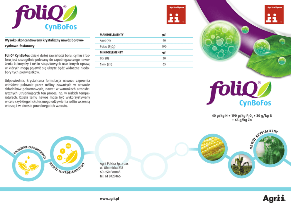 CynBoFos SalWap B MAKROELEMENTY g/l Wysoko skoncentrowany krystaliczny nawóz borowo- Azot (N) 40 cynkowo-fosforowy Potas (P2O5) 190 MIKROELEMENTY g/l Bor (B) 30 Cynk (Zn) 65 FoliQ® CynBoFos dzięki dużej zawartości boru, cynku i fosforu jest szczególnie polecany do zapobiegawczego nawożenia kukurydzy i roślin strączkowych oraz innych upraw, w których mogą pojawić się ukryte bądź widoczne niedobory tych pierwiastków. Odpowiednia, krystaliczna formulacja nawozu zapewnia właściwe pobranie przez rośliny zawartych w nawozie składników pokarmowych, nawet w warunkach atmosferycznych utrudniających ten proces, np. w niskich temperaturach. Dzięki temu nawóz może być wykorzystywany w celu szybkiego i skutecznego odżywienia roślin wczesną wiosną i w okresie powolnego ich wzrostu. CynBoFos SalWap B N AW ENIE ZAPOBIE WŻ GA AO ÓZ W NA W Y ZE WC N ÓZ 40 g/kg N + 190 g/kg P2O5 + 30 g/kg B + 65 g/kg Zn M IK R O ELE M O NT Agrii Polska Sp. z o.o. ul. Obornicka 233 60-650 Poznań tel. 61 8429466 www.agrii.pl Y KR STA LIC Z N Y Kluczowe zalety wysoka koncentracja boru, cynku i fosforu szybkie i efektywne pobieranie składników w każdych warunkach odpowiednio zbilansowany skład, niezbędny do zapewnienia właściwego wzrostu i plonowania roślin pełna rozpuszczalność w wodzie Dawki i terminy stosowania Uprawa Dawka kg/ha Liczba zabiegów i terminy stosowania Kukurydza 2,0 2 zabiegi: w fazie 4 – 10 liści, w odstępach 7 – 10 dni Strączkowe 2,0 2 zabiegi: od fazy kilku liści do fazy ukazywania się pąków kwiatowych FoliQ® CynBoFos może być stosowany w podanych fazach rozwojowych roślin uprawnych lub w momencie stwierdzenia występowania na roślinach uprawnych objawów niedoboru cynku, boru i fosforu w celu ich likwidacji. Najważniejsze korzyści rozbudowany i aktywny system korzeniowy prawidłowa gospodarka hormonalna roślin zwiększona tolerancja na suszę zwiększona odporność na choroby właściwy wzrost i rozwój roślin właściwy przebieg procesu kwitnienia i zapylania lepsze warunki do wiązania kolb efektywne wykorzystanie azotu stosowanego doglebowo wyższy plon www.agrii.pl