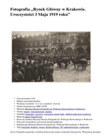 Fotografia „Rynek Główny w Krakowie. Uroczystości 3 Maja 1919 roku” • • • • • • • • • • • • Czas powstania 1919 Miejsce powstania Kraków Wymiary wysokość: 11,7 cm, szerokość: 16,6 cm Numer inwentarzowy MHF 161/II Muzeum Muzeum Historii Fotografii im. Walerego Rzewuskiego w Krakowie Tematy miasto, sfotografowane, pamięć Technika fotografia pozytyw, fotografia czarnobiała, odbitka żelatynowosrebrowa Materiał papier fotograficzny Prawa do obiektu Muzeum Historii Fotografii im. Walerego Rzewuskiego w Krakowie Prawa do wizerunków cyfrowych domena publiczna Digitalizacja Muzeum Historii Fotografii im. Walerego Rzewuskiego w Krakowie Tagi fotografia, Kraków, święto, Rynek Główny, 2D, audiodeskrypcja, wydarzenia Jest to fotografia amatorska, na której uchwycono ważne wydarzenie historyczne. Wykonał ją nieznany autor 3 maja 1919 roku w Krakowie. Na płycie Rynku, na pierwszym planie stoi piechota; obok – ustawiona w dwuszeregu, tyłem do osoby fotografującej – artyleria. Sukiennice udekorowano flagami i polskim godłem. Pod nimi stoją liczne grupy cywilów. Odbywa się msza polowa, zorganizowana przez artylerię i kawalerię. Pod arkadami środkowej części Sukiennic, od strony ul. Szewskiej, urządzono ołtarz, który udekorowano kwiatami i emblematami o barwach narodowych. Od strony ratusza stoją oddziały załogi krakowskiej reprezentowane przez 13. Pułk Piechoty z orkiestrą, 20. Pułk Piechoty Ziemi Krakowskiej i 8. Pułk Ułanów. Na odwrocie zdjęcia znajduje się napis sporządzony ołówkiem: „3 Maja 1919”. Fotografia jest zapisem jednej z pierwszych uroczystości w wolnej Polsce. Właśnie w 1919 roku święto 3 maja, upamiętniające uchwalenie Konstytucji 3 maja przez Sejm Wielki zwołany w październiku 1788 roku, zostało ponownie ustanowione. Fotografia przedstawia pierwsze obchody rocznicy w II Rzeczypospolitej. Uchwalenie tej zasadniczej ustawy zostało uznane za święto już 5 maja 1791 roku. Była to pierwsza konstytucja w nowożytnej Europie, druga, po amerykańskiej, na świecie; wyprzedziła konstytucję francuską. Ponownie zaczęto obchodzić Święto Narodowe Trzeciego Maja w 1990 roku. Rynek Główny pokryty jest kostką brukową. To największy plac Krakowa, jeden z największych placów w Europie. Na zdjęciu widać Sukiennice. To handlowy budynek, w którym znajdowały się kramy i składy, najczęściej z suknem. Zazwyczaj umieszczane były na środku rynku w europejskich miastach, które leżały na szlakach handlowych. Wznoszono je od średniowiecza do XVII wieku. Sukiennice po raz pierwszy zostały utworzone w XIII wieku przez księcia Bolesława Wstydliwego w ramach nadania Krakowowi prawa lokacji. W latach 1380—1400 bryłę Sukiennic ujednolicił Marcin Windentolde. W 1555 roku miał miejsce pożar. Za czasów Zygmunta Augusta odbudowę Sukiennic powierzono Janowi Marii il Mosca, zwanemu Padovano. Padovano zbudował attykę, ozdobił ją kwiatonami i maszkaronami. Na pierwszym piętrze sprzedawali swe towary kupcy i rękodzielnicy niemający własnych kramów. W 1601 roku Joachim Ciepielowski wykonał poprzeczne przejście. W latach późniejszych nastąpił upadek polityczny i gospodarczy Krakowa. Dzięki Janowi Matejce i Józefowi Dietlowi Sukiennice doczekały się remontu. Prace remontowe wykonał Tomasz Pryliński, który w 1875 roku rozpoczął przebudowę. Fotografia jest wyeksponowana na wystawie stałej w Muzeum Historii Fotografii, otoczona kolejnymi fotografiami pamiątkowymi, wykonanymi przez nieznanego fotografa, przedstawiającymi tłumnie zebranych na Rynku Głównym mieszkańców Krakowa. Opracowanie: Małgorzata Kanikuła (Muzeum Historii Fotografii im. Walerego Rzewuskiego w Krakowie), © wszystkie prawa zastrzeżone