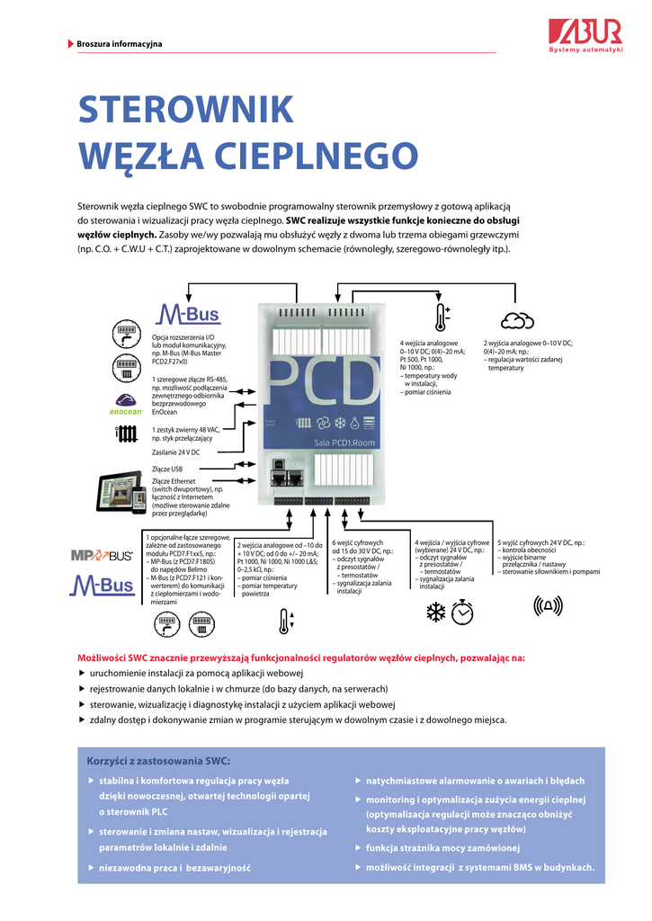 Broszura informacyjna STEROWNIK WĘZŁA CIEPLNEGO Sterownik węzła cieplnego SWC to swobodnie programowalny sterownik przemysłowy z gotową aplikacją do sterowania i wizualizacji pracy węzła cieplnego. SWC realizuje wszystkie funkcje konieczne do obsługi węzłów cieplnych. Zasoby we/wy pozwalają mu obsłużyć węzły z dwoma lub trzema obiegami grzewczymi (np. C.O. + C.W.U + C.T.) zaprojektowane w dowolnym schemacie (równoległy, szeregowo-równoległy itp.). Opcja rozszerzenia I/O lub moduł komunikacyjny, np. M-Bus (M-Bus Master PCD2.F27x0) 4 wejścia analogowe 0–10 V DC; 0(4)–20 mA; Pt 500, Pt 1000, Ni 1000, np.: – temperatury wody w instalacji, – pomiar ciśnienia 1 szeregowe złącze RS-485, np. możliwość podłączenia zewnętrznego odbiornika bezprzewodowego EnOcean 2 wyjścia analogowe 0–10 V DC; 0(4)–20 mA; np.: – regulacja wartości zadanej temperatury 1 zestyk zwierny 48 VAC, np. styk przełączający Zasilanie 24 V DC Złącze USB Złącze Ethernet (switch dwuportowy), np. łączność z Internetem (możliwe sterowanie zdalne przez przeglądarkę) 1 opcjonalne łącze szeregowe, zależne od zastosowanego modułu PCD7.F1xx5, np.: – MP-Bus (z PCD7.F180S) do napędów Belimo – M-Bus (z PCD7.F121 i konwerterem) do komunikacji z ciepłomierzami i wodomierzami 2 wejścia analogowe od –10 do + 10 V DC; od 0 do +/– 20 mA; Pt 1000, Ni 1000, Ni 1000 L&S; 0–2,5 kΩ, np.: – pomiar ciśnienia – pomiar temperatury powietrza 6 wejść cyfrowych od 15 do 30 V DC, np.: – odczyt sygnałów z presostatów / – termostatów – sygnalizacja zalania instalacji 4 wejścia / wyjścia cyfrowe (wybierane) 24 V DC, np.: – odczyt sygnałów z presostatów / – termostatów – sygnalizacja zalania instalacji 5 wyjść cyfrowych 24 V DC, np.: – kontrola obecności – wyjście binarne przełącznika / nastawy – sterowanie siłownikiem i pompami Możliwości SWC znacznie przewyższają funkcjonalności regulatorów węzłów cieplnych, pozwalając na: uruchomienie instalacji za pomocą aplikacji webowej rejestrowanie danych lokalnie i w chmurze (do bazy danych, na serwerach) sterowanie, wizualizację i diagnostykę instalacji z użyciem aplikacji webowej zdalny dostęp i dokonywanie zmian w programie sterującym w dowolnym czasie i z dowolnego miejsca. Korzyści z zastosowania SWC: stabilna i komfortowa regulacja pracy węzła dzięki nowoczesnej, otwartej technologii opartej o sterownik PLC sterowanie i zmiana nastaw, wizualizacja i rejestracja parametrów lokalnie i zdalnie niezawodna praca i bezawaryjność natychmiastowe alarmowanie o awariach i błędach monitoring i optymalizacja zużycia energii cieplnej (optymalizacja regulacji może znacząco obniżyć koszty eksploatacyjne pracy węzłów) funkcja strażnika mocy zamówionej możliwość integracji z systemami BMS w budynkach. SWC jest gotowy do użytku bez potrzeby programowania i korzystania z narzędzi inżynierskich. Konfiguracja, parametryzacja i nadzór pracy sterownika odbywa się za pomocą prostej w obsłudze wizualizacji opartej o technologię webową. Aplikację SWC można modyfikować i rozbudowywać dostosowując do indywidualnych potrzeb za pomocą pakietu PG5 Controls Suite, a konfiguracji dokonywać lokalnie (przez USB) i zdalnie przez port Ethernet lub sieć GSM. Zdalne uaktualnianie programu i serwis sterownika ograniczają koszty, eliminując konieczność wyjazdów serwisowych. Funkcje realizowane przez SWC: sterowanie pracą urządzeń węzła cieplnego (pompy, zawory, falowniki itp.) obsługa różnych obiegów przez gotową, uniwersalną aplikację (C.O. + C.W.U + C.T.) rejestrowanie pomiarów i zdarzeń alarmowych, alarmowanie o błędach (na www, za pomocą e-maili lub sms) diagnostyka i regulacja pracy węzła monitoring pracy węzła cieplnego i zużycia energii elektrycznej (obsługa liczników energii) współpraca z systemami do raportowania i bilingowymi (udostępnianie danych z liczników) udostępnianie danych historycznych obsługa komunikacji GSM 2G/3G/4G (za pomocą zewnętrznego modemu). SWC umożliwia zbudowanie systemu działającego na zasadzie chmury obliczeniowej i współpracuje z: serwerami baz danych MySQL; SWC pozwala na zdalne logowania do baz danych serwerami plików historycznych CSV; pliki historyczne można rejestrować w nieulotnej pamięci sterownika i bezpośrednio ze sterownika generować wykresy i trendy; sterownik może także przesyłać pliki CSV na komputer PC lub drugi sterownik SERWERY, BAZY DANYCH, SCADA serwisami internetowymi (do przesyłania i odbierania danych z serwisów internetowych z wykorzystaniem protokołu HTTP) środowiskiem do raportowania i analiz Pluto Live Report. W podstawowej wersji systemu, w przypadku niewielkich instalacji nie jest konieczne stosowanie systemu SCADA, bo monitoring i sterowanie zapewnia aplikacja webowa wbudowana w sterownik. SABUR Sp. z o.o. ul. Puławska 303, 02-785 Warszawa | T +48 22 549 43 53 | F +48 22 549 43 50 | www.sabur.com.pl | [email protected] Zastrzega się możliwość wprowadzenia zmian technicznych bez uprzedzenia. Nie ponosimy odpowiedzialności za ewentualne błędy w druku. 02.2015