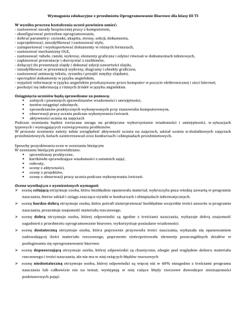 Wymagania edukacyjne z przedmiotu Oprogramowanie Biurowe dla klasy III TI W wyniku procesu kształcenia uczeń powinien umieć: - zastosować zasady bezpiecznej pracy z komputerem, - skonfigurować potrzebne oprogramowanie, - dobrać parametry: czcionki, akapitu, strony, sekcji, dokumentu, - zaprojektować, zmodyfikować i zastosować style, - zaimportować i wyeksportować dokumenty w różnych formatach, - zastosować mechanizmy OLE, - zastosować: tabele, ramki, wykresy, elementy graficzne i edytor równań w dokumentach tekstowych, - zaplanować prezentacje i skorzystać z szablonów, - dołączyć do prezentacji slajdy i dokonać edycji zawartości slajdu, - zmodyfikować w prezentacji wykresy, diagramy i obiekty graficzne, - zastosować animację tekstu, rysunku i przejść między slajdami, - sporządzić dokumenty w języku angielskim, - wyjaśnić informacje w języku angielskim przekazywane przez komputer w poczcie elektronicznej i sieci Internet, - posłużyć się informacją z różnych źródeł w języku angielskim. Osiągnięcia uczniów będą sprawdzane za pomocą: ustnych i pisemnych sprawdzianów wiadomości i umiejętności, testów osiągnięć szkolnych, sprawdzianów praktycznych wykonywanych przy stanowisku komputerowym, obserwacji pracy ucznia podczas wykonywania ćwiczeń. aktywności ucznia na zajęciach Podczas oceniania będzie zwracana uwaga na praktyczne wykorzystanie wiadomości i umiejętności, w sytuacjach typowych i wymagających rozwiązywania problemów. W procesie oceniania należy także uwzględnić aktywność ucznia na zajęciach, udział ucznia w dodatkowych zajęciach przedmiotowych, kołach zainteresowań oraz konkursach i olimpiadach przedmiotowych. Sposoby pozyskiwania ocen w ocenianiu bieżącym W ocenianiu bieżącym przewidziano: sprawdziany praktyczne, kartkówki sprawdzające wiadomości z ostatnich zajęć, referaty, oceny z aktywności, oceny z projektów, oceny z obserwacji pracy ucznia podczas wykonywania ćwiczeń. Ocena wynikająca z wymienionych wymagań: ocenę celującą otrzymuje osoba, która bezbłędnie opanowała materiał, wykroczyła poza wiedzę zawartą w programie nauczania, bierze udział i osiąga znaczące wyniki w konkursach i olimpiadach informatycznych. ocenę bardzo dobrą otrzymuje osoba, która potrafi zinterpretować bezbłędnie wszystkie treści zawarte w programie nauczania, prezentuje znajomość materiału rzeczowego. ocenę dobrą otrzymuje osoba, której odpowiedzi są zgodne z treściami nauczania, wykazuje dobrą znajomość zagadnień z przedmiotu oprogramowanie biurowe, wykorzystuje posiadane wiadomości. ocenę dostateczną otrzymuje osoba, która poprawnie przyswoiła treści nauczania, wykazała się opanowaniem zadowalającej ilości materiału rzeczowego, poprawnie zinterpretowała elementy poszczególnych działów w posługiwaniu się oprogramowanie biurowe. ocenę dopuszczającą otrzymuje osoba, której odpowiedzi są chaotyczne, ubogie pod względem doboru materiału rzeczowego i treści nauczania, ale nie ma w niej rażących błędów rzeczowych ocenę niedostateczną otrzymuje osoba, której odpowiedzi są więcej niż w 60% niezgodne z treściami programu nauczania lub całkowicie nie na temat, występują w niej rażące błędy rzeczowe dowodzące nieznajomości podstawowych pojęć.