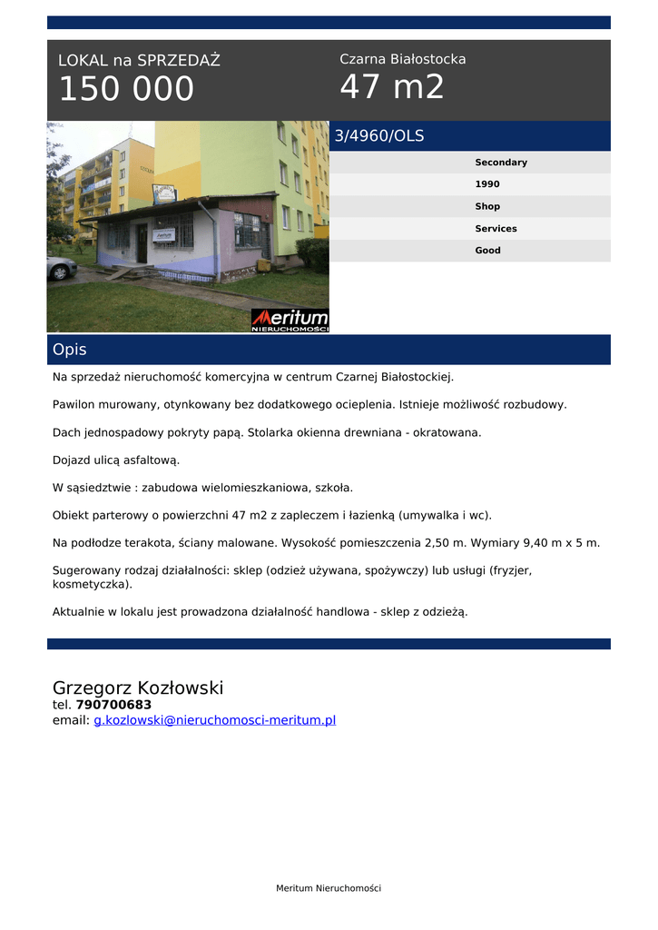 Czarna Białostocka LOKAL na SPRZEDAŻ 47 m2 150 000 3/4960/OLS Secondary 1990 Shop Services Good Opis Na sprzedaż nieruchomość komercyjna w centrum Czarnej Białostockiej. Pawilon murowany, otynkowany bez dodatkowego ocieplenia. Istnieje możliwość rozbudowy. Dach jednospadowy pokryty papą. Stolarka okienna drewniana - okratowana. Dojazd ulicą asfaltową. W sąsiedztwie : zabudowa wielomieszkaniowa, szkoła. Obiekt parterowy o powierzchni 47 m2 z zapleczem i łazienką (umywalka i wc). Na podłodze terakota, ściany malowane. Wysokość pomieszczenia 2,50 m. Wymiary 9,40 m x 5 m. Sugerowany rodzaj działalności: sklep (odzież używana, spożywczy) lub usługi (fryzjer, kosmetyczka). Aktualnie w lokalu jest prowadzona działalność handlowa - sklep z odzieżą. Grzegorz Kozłowski tel. 790700683 email: [email protected] Meritum Nieruchomości Powered by TCPDF (www.tcpdf.org)