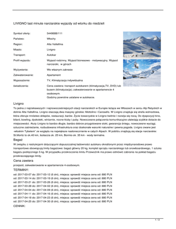 LIVIGNO last minute narciarskie wyjazdy od wtorku do niedzieli Symbol oferty: 5449688/111 Państwo: Włochy Region: Alta Valtellina Miasto: Livigno Transport: Autokar Profil wyjazdu: Wyjazd rodzinny, Wyjazd biznesowo - motywacyjny, Wyjazd Wyżywienie: We własnym zakresie Zakwaterowanie: Apartament Wyposażenie: TV, Klimatyzacja indywidualna świadczenia: Cena zawiera: transport autokarem (klimatyzacja,TV, DVD) lub narciarski, w górach busem (klimatyzacja); zakwaterowanie w apartamencie 4 osobowym. Godziny powrotne ustalane w autokarze. Livigno To jedna z najciekawszych i najnowocześniejszych stacji narciarskich w Europie leżąca we Włoszech w sercu Alp Retyckich w dolinie Alta Valtellina. Livigno otaczają dwa masywy górskie: Mottolino i Carosello. W Livigno znajduje się strefa wolnocłowa, która oferuje mnóstwo sklepów, restauracji, barów. Życie towarzyskie w Livigno kwitnie i rozwija się nocą. Do dyspozycji kino, bilard, bowling, dyskoteki, winiarnie, nocne kluby i puby. Nowoczesne połączenia komunikacyjne ułatwiają szybkie dotacie do miejscowości. Atuty Livigno to bardzo długie, bardzo dobrze przygotowane stoki, gwarancja śniegu, nowoczesne wyciągi, sztuczne zaśnieżanie, rozbudowana infrastruktura oraz doskonałe warunki naturalne i pewna pogoda. Livigno zwane jest -włoskim Tybetem” ze względu na największe nasłonecznienie w całych Alpach. W pobliżu znajdują się stacje narciarskie: St.Moritz to ok.40 km, Isolaccia ok. 25 km, Bormio ok. 35 km - wody termalne. Bagaż W związku z restrykcjami dotyczącymi dopuszczalnej ładowności autokaru określonymi przez międzynarodowe prawo transportowe obowiązują limity bagażowe: bagaż główny 20 kg, komplet sprzętu narciarskiego lub snowboardowego, 1 sztuka bagażu podręcznego 5 kg. W przypadku przekroczenia limitu Przewoźnik ma prawo odmówić zabrania na pokład bagażu przekraczającego limity. Cena zawiera przejazd, zakwaterowanie w apartamencie 4-osobowym. TERMINY: od: 2017-03-07 do: 2017-03-12 (6 dni), miejsca: sprawdź miejsca cena od: 880 PLN od: 2017-03-14 do: 2017-03-19 (6 dni), miejsca: sprawdź miejsca cena od: 880 PLN od: 2017-03-21 do: 2017-03-26 (6 dni), miejsca: sprawdź miejsca cena od: 880 PLN od: 2017-03-28 do: 2017-04-02 (6 dni), miejsca: sprawdź miejsca cena od: 880 PLN od: 2017-04-04 do: 2017-04-09 (6 dni), miejsca: sprawdź miejsca cena od: 880 PLN od: 2017-04-11 do: 2017-04-16 (6 dni), miejsca: sprawdź miejsca cena od: 880 PLN od: 2017-04-18 do: 2017-04-23 (6 dni), miejsca: sprawdź miejsca cena od: 880 PLN od: 2017-04-25 do: 2017-04-30 (6 dni), miejsca: sprawdź miejsca cena od: 880 PLN CENNIK: 1/3 Długość pobytu: 6 dni Grupa cenowa: A Miasto docelowe (do wyboru) Bormio (Alta Valtellina) (*) Livigno (Alta Valtellina) Miasto wyjazdowe (do wyboru) Lublin parking przed motelem PZM (11:15) Opole C.H. Biedronka ul. Dubois (17:45) Kielce Salon Solo Seat, ul. Dębowa 346B (16:15) Gliwice Dworzec PKS ul. Toszecka (19:15) Białystok Dworzec PKP (06:30) Tychy Hotel Tychy (20:40) Kraków Reymonta, miasteczko studenckie (18:45) Sopot McDonald (06:40) Skarżysko Kamienna Parking MCK (12:00) Gdańsk Dworzec PKS (07:15) Wejherowo do potwierdzenia () Poznań Dworzec PKP (11:45) Gdynia Dworzec PKP (06:15) Częstochowa stacja BP, Mc Donald ul. Drogowców 1 (18:00) (*) Katowice ul. Mickiewicza 23-27, parking strzeżony (20:15) Sosnowiec ul. Kresowa Mcdonald (20:00) Bielsko-Biała BP stacja, ul. Warszawska (21:30) Toruń Dworzec PKP (10:00) Łódź Parking dw. Łódź Fabryczna (15:45) Pszczyna Kaufland (21:00) Wrocław2 Parking pod wzgórzem Andersa (15:45) Czechowice-Dziedzice stacja Jet Mc Donald (21:10) Rzeszów Mc Donald Al. Powst. Warszawy 20 (13:30) Radom Mc Donald k. Statoil ul. Czarnieckiego 73 (13:45) Kalisz ul. Dworcowa przy PKP (12:15) Olsztyn Dworzec PKP/PKS (09:00) (-) (-) 120 80 70 (-) 129 (-) (-) 150 90 150 150 100 150 50 (-) 20 (-) 120 90 (-) (-) (-) 80 80 100 130 2/3 Warszawa Dworzec Zachodni (11:45) Tarnów Parking przed Hotelem Tarnovia (15:45) Piotrków Trybunalski ul. POW PKP/ PKS (16:45) Szczecin Dworzec PKP (04:00) Cieszyn Stacja Orlen ul. Graniczna (22:00) Leszno Parking przy stadionie Smoczyka (13:15) Tczew McDonald (08:15) Pobyt w obiekcie (do wyboru) (*) osoba dorosła Ubezpieczenie (do wyboru) ubezpieczenie NW, KL, SKI (*) ---bez ubezpieczenia--ubezpieczenie NW, KL Transport - wyjazd (do wyboru) (*) miejsce autokar-bus Livigno 80 90 140 (-) 40 135 (*) apartament 4-osobowy standardowo dla osób: 4 Rodzaj osoby (do wyboru) 100 (-) 880 70 (-) 40 (-) Waluta: PLN Aktualne ceny z systemu S.A.R.T. (-) - cena usługi, podatku kalkulowana przy osobie lub gratis (*) - kwota wliczona w cenę standardową 3/3