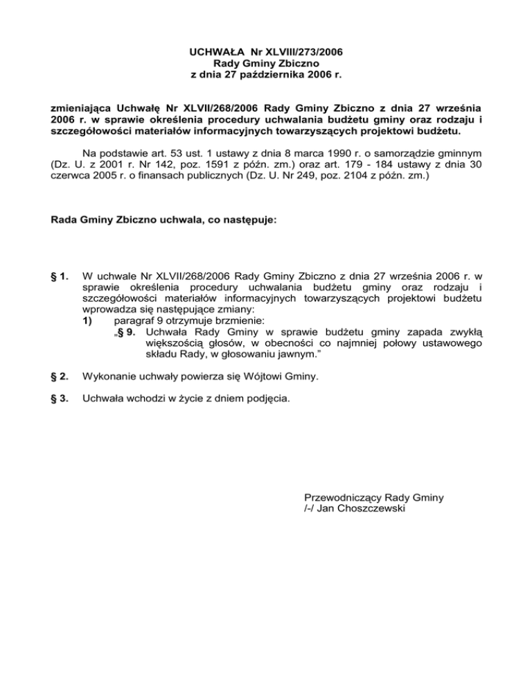 UCHWAŁA Nr XLVIII/273/2006 Rady Gminy Zbiczno z dnia 27 października 2006 r. zmieniająca Uchwałę Nr XLVII/268/2006 Rady Gminy Zbiczno z dnia 27 września 2006 r. w sprawie określenia procedury uchwalania budżetu gminy oraz rodzaju i szczegółowości materiałów informacyjnych towarzyszących projektowi budżetu. Na podstawie art. 53 ust. 1 ustawy z dnia 8 marca 1990 r. o samorządzie gminnym (Dz. U. z 2001 r. Nr 142, poz. 1591 z późn. zm.) oraz art. 179 - 184 ustawy z dnia 30 czerwca 2005 r. o finansach publicznych (Dz. U. Nr 249, poz. 2104 z późn. zm.) Rada Gminy Zbiczno uchwala, co następuje: § 1. W uchwale Nr XLVII/268/2006 Rady Gminy Zbiczno z dnia 27 września 2006 r. w sprawie określenia procedury uchwalania budżetu gminy oraz rodzaju i szczegółowości materiałów informacyjnych towarzyszących projektowi budżetu wprowadza się następujące zmiany: 1) paragraf 9 otrzymuje brzmienie: „§ 9. Uchwała Rady Gminy w sprawie budżetu gminy zapada zwykłą większością głosów, w obecności co najmniej połowy ustawowego składu Rady, w głosowaniu jawnym.” § 2. Wykonanie uchwały powierza się Wójtowi Gminy. § 3. Uchwała wchodzi w życie z dniem podjęcia. Przewodniczący Rady Gminy /-/ Jan Choszczewski
