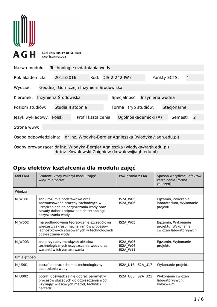 Nazwa modułu: Rok akademicki: Wydział: Kierunek: Technologie uzdatniania wody 2015/2016 Kod: DIS-2-242-IW-s Punkty ECTS: 4 Geodezji Górniczej i Inżynierii Środowiska Inżynieria Środowiska Poziom studiów: Studia II stopnia Język wykładowy: Polski Specjalność: Inżynieria wodna Forma i tryb studiów: Profil kształcenia: Stacjonarne Ogólnoakademicki (A) Semestr: 2 Strona www: Osoba odpowiedzialna: dr inż. Włodyka-Bergier Agnieszka ([email protected]) Osoby prowadzące: dr inż. Włodyka-Bergier Agnieszka ([email protected]) dr inż. Kowalewski Zbigniew ([email protected]) Opis efektów kształcenia dla modułu zajęć Kod EKM Student, który zaliczył moduł zajęć wie/umie/potrafi Powiązania z EKK Sposób weryfikacji efektów kształcenia (forma zaliczeń) M_W001 zna i rozumie podstawowe oraz zaawansowane procesy zachodzące w urządzeniach do oczyszczania wody oraz zasady doboru odpowiednich technologii oczyszczania wody IS2A_W05, IS2A_W06 Egzamin, Zaliczenie laboratorium, Wykonanie projektu M_W002 ma podbudowaną teoretycznie szczegółową wiedzę z zakresu mechanizmów procesów jednostkowych stosowanych w technologiach oczyszczania wody IS2A_W05 Egzamin, Wykonanie projektu, Wykonanie ćwiczeń laboratoryjnych M_W003 zna przykłady rozwiązań układów technologicznych oczyszczania wody oraz warunków ich zastosowania IS2A_W05, IS2A_W06, IS2A_W11 Egzamin, Wykonanie projektu M_U001 potrafi dobrać schemat technologiczny uzdatniania wody IS2A_U16, IS2A_U17 Wykonanie projektu M_U002 potrafi doświadczalnie dobrać parametry procesów służących do oczyszczania wód, używając właściwych metod, technik i narzędzi IS2A_U08, IS2A_U21 Wykonanie ćwiczeń laboratoryjnych, Kolokwium Wiedza Umiejętności 1/6 Karta modułu - Technologie uzdatniania wody M_U003 potrafi przeprowadzać eksperymenty, interpretować wyniki i wyciągać wnioski IS2A_U08 Wykonanie ćwiczeń laboratoryjnych, Kolokwium Kompetencje społeczne M_K001 potrafi współdziałać i pracować w grupie, przyjmując w niej różne role IS2A_K03 Zaangażowanie w pracę zespołu M_K002 potrafi określić priorytetowe cele wykonywanego zadania i sposoby jego realizacji IS2A_K04 Wykonanie ćwiczeń M_K003 ma świadomość skutków działalności inżynierskiej, jej wpływu na środowisko i związanej z tym odpowiedzialności za podejmowane decyzje; prawidłowo identyfikuje oraz rozstrzyga dylematy związane z wykonywaniem zawodu IS2A_K02, IS2A_K05 Aktywność na zajęciach Matryca efektów kształcenia w odniesieniu do form zajęć Konwersatori um Zajęcia seminaryjne Zajęcia praktyczne Zajęcia terenowe Zajęcia warsztatowe zna i rozumie podstawowe oraz zaawansowane procesy zachodzące w urządzeniach do oczyszczania wody oraz zasady doboru odpowiednich technologii oczyszczania wody + - + + - - - - - - - M_W002 ma podbudowaną teoretycznie szczegółową wiedzę z zakresu mechanizmów procesów jednostkowych stosowanych w technologiach oczyszczania wody + - + - - - - - - - - M_W003 zna przykłady rozwiązań układów technologicznych oczyszczania wody oraz warunków ich zastosowania + - - + - - - - - - - M_U001 potrafi dobrać schemat technologiczny uzdatniania wody + - - + - - - - - - - M_U002 potrafi doświadczalnie dobrać parametry procesów służących do oczyszczania wód, używając właściwych metod, technik i narzędzi - - + - - - - - - - - E-learning Ćwiczenia projektowe M_W001 Inne Ćwiczenia laboratoryjne Forma zajęć Ćwiczenia audytoryjne Student, który zaliczył moduł zajęć wie/umie/potrafi Wykład Kod EKM Wiedza Umiejętności 2/6 Karta modułu - Technologie uzdatniania wody M_U003 potrafi przeprowadzać eksperymenty, interpretować wyniki i wyciągać wnioski - - + - - - - - - - - Kompetencje społeczne M_K001 potrafi współdziałać i pracować w grupie, przyjmując w niej różne role - - + + - - - - - - - M_K002 potrafi określić priorytetowe cele wykonywanego zadania i sposoby jego realizacji - - + + - - - - - - - M_K003 ma świadomość skutków działalności inżynierskiej, jej wpływu na środowisko i związanej z tym odpowiedzialności za podejmowane decyzje; prawidłowo identyfikuje oraz rozstrzyga dylematy związane z wykonywaniem zawodu + - - + - - - - - - - Treść modułu zajęć (program wykładów i pozostałych zajęć) Wykład Procesy fizyczne stosowane w uzdatnianiu wody Procesy separacji fazy stałej – cedzenie, sedymentacja, flotacja, filtracja. Procesy membranowe w uzdatnianiu wody – membrany i moduły membranowe, ciśnieniowe procesy membranowe, inne procesy membranowe stosowane w uzdatnianiu wody. Koagulacja jako chemiczno-fizyczny proces usuwania fazy stałej z wody – przebieg procesu koagulacji, chemizm koagulantów hydrolizujących, flokulacja. Metody sorpcyjne w uzdatnianiu wody Adsorbenty stosowane w uzdatnianiu wody – węgle aktywne, adsorbenty nie węglowe. Izoterma adsorpcji. Usuwanie naturalnej materii organicznej, innych zanieczyszczeń organicznych, metali ciężkich i zanieczyszczeń nieorganicznych z wody z wykorzystaniem metod sorpcyjnych. Praktyczne rozwiązania z zastosowaniem węgli aktywnych do oczyszczania wody – wyznaczanie dawek pylistego węgla aktywnego oraz parametrów złoża z granulowanym węglem aktywnym. Procesy chemiczne stosowane w uzdatnianiu wody Utlenianie w technologii uzdatniania wód – utlenianianie zanieczyszczeń powietrzem i związkami chemicznymi (chlorem, chloraminowanie, dwutlenkiem chloru, nadmanganianem potasu, ozonem). Zaawansowane procesy utlenianiania – reakcje wolnorodnikowe, homogeniczne i heterogeniczne procesy utleniania, ozonowanie katalityczne. Wymiana jonowa – istota procesu, wymieniacze jonowe, technologiczna charakterystyka procesu wymiany jonowej, zastosowanie wymiany jonowej w technologii uzdatniania wody. Metody strąceniowe w uzdatnianiu wody. Biologiczne metody uzdatniania wody Podstawy biologicznych metod uzdatniania. Procesy biochemiczne wykorzystywane w uzdatnianiu wody – aer
