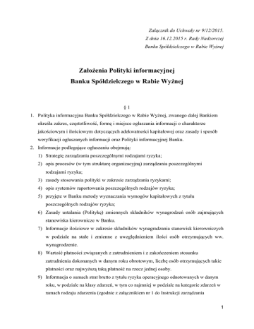 Załącznik do Uchwały nr 9/12/2015. Z dnia 16.12.2015 r. Rady Nadzorczej Banku Spółdzielczego w Rabie Wyżnej Założenia Polityki informacyjnej Banku Spółdzielczego w Rabie Wyżnej §1 1. Polityka informacyjna Banku Spółdzielczego w Rabie Wyżnej, zwanego dalej Bankiem określa zakres, częstotliwość, formę i miejsce ogłaszania informacji o charakterze jakościowym i ilościowym dotyczących adekwatności kapitałowej oraz zasady i sposób weryfikacji ogłaszanych informacji oraz Polityki informacyjnej Banku. 2. Informacje podlegające ogłaszaniu obejmują: 1) Strategię zarządzania poszczególnymi rodzajami ryzyka; 2) opis procesów (w tym strukturę organizacyjną) zarządzania poszczególnymi rodzajami ryzyka; 3) zasady stosowania polityki w zakresie zarządzania ryzykami; 4) opis systemów raportowania poszczególnych rodzajów ryzyka; 5) przyjęte w Banku metody wyznaczania wymogów kapitałowych z tytułu poszczególnych rodzajów ryzyka; 6) Zasady ustalania (Politykę) zmiennych składników wynagrodzeń osób zajmujących stanowiska kierownicze w Banku. 7) Informacje ilościowe w zakresie składników wynagradzania stanowisk kierowniczych w podziale na stałe i zmienne z uwzględnieniem ilości osób otrzymujących ww. wynagrodzenie. 8) Wartość płatności związanych z zatrudnieniem i z zakończeniem stosunku zatrudnienia dokonanych w danym roku obrotowym, liczbę osób otrzymujących takie płatności oraz najwyższą taką płatność na rzecz jednej osoby. 9) Informacja o sumach strat brutto z tytułu ryzyka operacyjnego odnotowanych w danym roku, w podziale na klasy zdarzeń, w tym co najmniej w podziale na kategorie zdarzeń w ramach rodzaju zdarzenia (zgodnie z załącznikiem nr 1 do Instrukcji zarządzania 1 ryzykiem operacyjnym), oraz o tym, jakie działania mitygujące w związku z tym zostały podjęte w celu uniknięcia ich w przyszłości 10) Informacja o najpoważniejszych zdarzeniach operacyjnych, jakie wystąpiły w minionym roku – według uznania Banku. 1) Informacje wymagane przez Rekomendację „P” w zakresie: a) roli i zakresu odpowiedzialności właściwych komitetów oraz innych jednostek funkcjonalnych i biznesowych, b) działalności w zakresie pozyskiwania finansowania, c) stopnia, w jakim funkcje skarbowe oraz zarządzanie ryzykiem płynności są scentralizowane bądź zdecentralizowane, d) w przypadku zrzeszonego banku spółdzielczego, funkcjonowania w ramach zrzeszenia. e) rozmiar i skład nadwyżki płynności banku, f) wymogi dotyczące dodatkowego zabezpieczenia na wypadek obniżenia oceny kredytowej banku, g) normy płynności oraz inne regulacyjne normy dopuszczalnego ryzyka w działalności banków obowiązujące w danej jurysdykcji. h) lukę płynności zawierającą kilka najbliższych przedziałów dla pozycji bilansowych i pozabilansowych oraz otrzymane na tej podstawie skumulowane luki płynności, i) w przypadku zrzeszonych banków spółdzielczych oraz banku zrzeszającego, dodatkowe zabezpieczenie płynności w ramach zrzeszenia. j) aspekty ryzyka płynności, na które bank jest narażony i które monitoruje, k) dywersyfikację źródeł finansowania banku, l) inne techniki wykorzystywane do ograniczania ryzyka płynności, m) pojęcia stosowane w procesie mierzenia pozycji płynnościowej i ryzyka płynności, łącznie z dodatkowymi wskaźnikami, dla których bank nie ujawnia danych, n) wyjaśnienie, w jaki sposób ryzyko płynności rynku (produktu) jest odzwierciedlone w systemie zarządzania płynnością płatniczą banku, o) wyjaśnienie, jak są wykorzystywane testy warunków skrajnych, p) opis modelowanych scenariuszy testów warunków skrajnych, q) wskazanie, czy i w jakim stopniu plan awaryjny płynności uwzględnia wyniki testów warunków skrajnych, r) politykę banku w zakresie utrzymywania rezerw płynności, s) ograniczenia regulacyjne w zakresie transferu płynności w obrębie jednostek grupy lub, w przypadku zrzeszonych banków spółdzielczych i banku zrzeszającego, w obrębie 2 zrzeszenia, t) częstotliwość i rodzaj wewnętrznej sprawozdawczości w zakresie płynności – Instrukcja SIZ. 2) Dodatkowe informacje wymagane przez Rozporządzenie 575/2013 UE, nie ujęte w Uchwale 385/2008 KNF: a) Zasady oceny odpowiedniości członków Zarządu i Rady Nadzorczej (Regulamin działania Zarządu, Regulamin działania Rady Nadzorczej) zawierające politykę rekrutacji dotyczącą wyboru członków organu zarządzającego oraz rzeczywistego stanu ich wiedzy, umiejętności i wiedzy specjalistycznej oraz strategię w zakresie zróżnicowania w odniesieniu do wyboru członków organu zarządzającego, b) utworzenie (bądź nie) przez instytucję oddzielnego komitetu ds. ryzyka oraz liczby posiedzeń komitetu, które się odbyły. Regulamin Komitetu Kredytowego, Komitetu Zarządzania Ryzykami itp., c) Bufory kapitałowe (art. 440), d) Wskaźnik dźwigni finansowej (art. 451). 11) inne informacje określone w załączniku nr 1 do Instrukcji sporządzania i ujawniania informacji. 1. Zakres informacji wymienionych w ust. 2 podlega zatwierdzeniu przez Zarząd oraz Radę Nadzorczą Banku na zasadach określonych w § 2. 2. Informacje wymienione w ust. 2 podlegają weryfikacji przez Głównego Księgowego na zasadach określonych w § 2 niniejszej Polityki. 3. Informacje wymienione w ust. 2 są ogłaszane w cyklach rocznych najpóźniej w terminie publikacji sprawozdania finansowego Banku. 4. Informacje, o których mowa w ust. 2 są udostępniane wszystkim zainteresowanych w formie papierowej w Centrali Banku w Rabie Wyżnej, w pokoju Wiceprezesów Zarządu w godzinach od 7:00 do 15:00. §2 1. Weryfikacja Polityki informacyjnej odbywa się do końca grudnia każdego roku na podstawie informacji przygotowanej przez Komórkę ds. Ryzyk. 2. Zarząd i Rada Nadzorcza Banku zatwierdza wszystkie zmiany oraz weryfikację Polityki informacyjnej, §3 Szczegółowy zakres i sposób przygotowania informacji podlegając