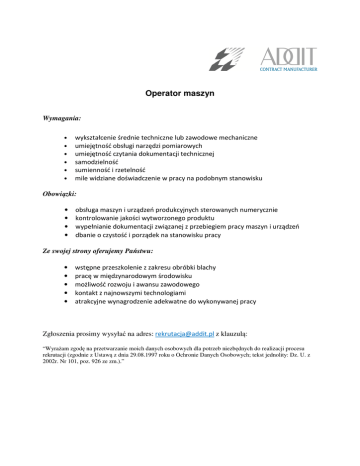 Operator maszyn Wymagania: • • • • • • wykształcenie średnie techniczne lub zawodowe mechaniczne umiejętność obsługi narzędzi pomiarowych umiejętność czytania dokumentacji technicznej samodzielność sumienność i rzetelność mile widziane doświadczenie w pracy na podobnym stanowisku Obowiązki: • • • • obsługa maszyn i urządzeń produkcyjnych sterowanych numerycznie kontrolowanie jakości wytworzonego produktu wypełnianie dokumentacji związanej z przebiegiem pracy maszyn i urządzeń dbanie o czystość i porządek na stanowisku pracy Ze swojej strony oferujemy Państwu: • • • • • wstępne przeszkolenie z zakresu obróbki blachy pracę w międzynarodowym środowisku możliwość rozwoju i awansu zawodowego kontakt z najnowszymi technologiami atrakcyjne wynagrodzenie adekwatne do wykonywanej pracy Zgłoszenia prosimy wysyłać na adres: [email protected] z klauzulą: “Wyrażam zgodę na przetwarzanie moich danych osobowych dla potrzeb niezbędnych do realizacji procesu rekrutacji (zgodnie z Ustawą z dnia 29.08.1997 roku o Ochronie Danych Osobowych; tekst jednolity: Dz. U. z 2002r. Nr 101, poz. 926 ze zm.).”